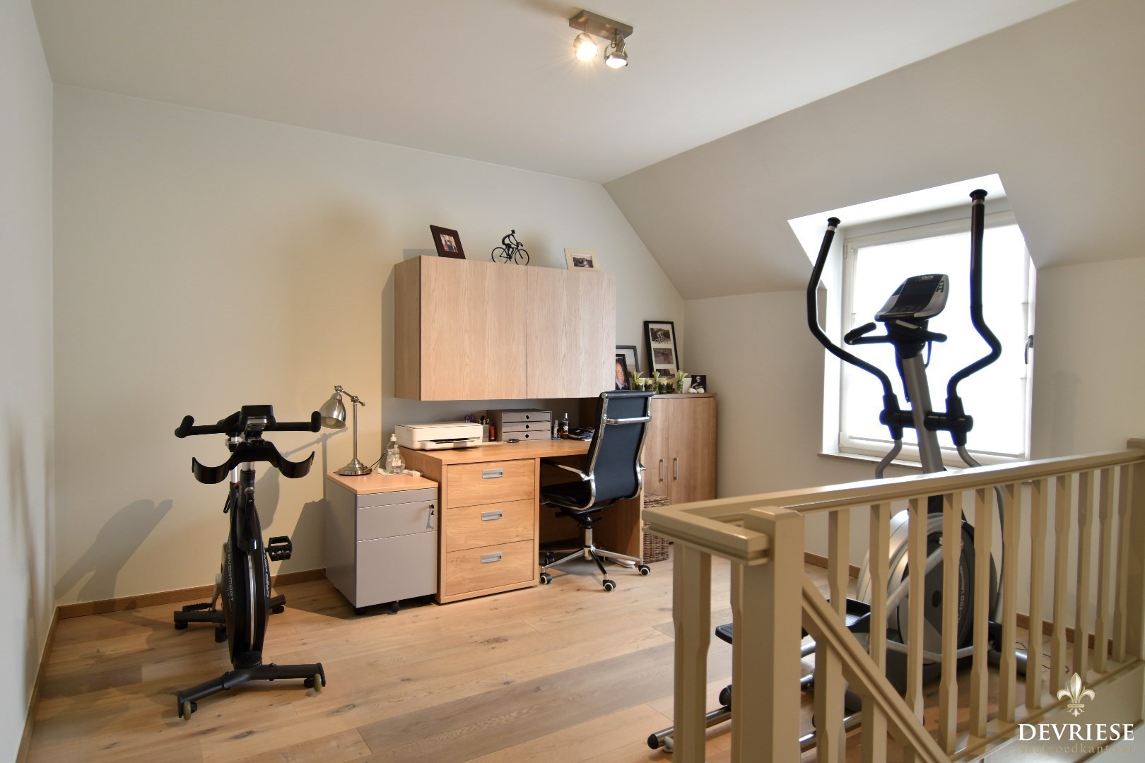 Op de eerste verdieping treffen we 3 grote slaapkamers én aparte dressing. De overloop van 11 m² doet momenteel dienst als bureau, ideaal voor thuiswerkers of als hobbyplaats.