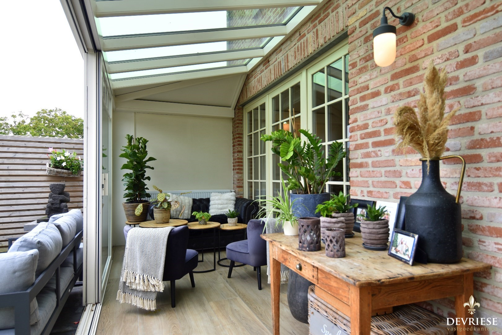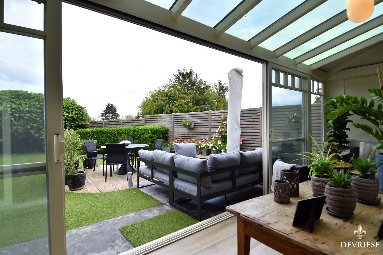 De lichtrijke veranda, met een extra zithoek, biedt een prachtig open zicht op de tuin, voorzien van een leuk aangelegd zonne-terras en een handig poortje dat toegang geeft langs de achterkant van de woning.