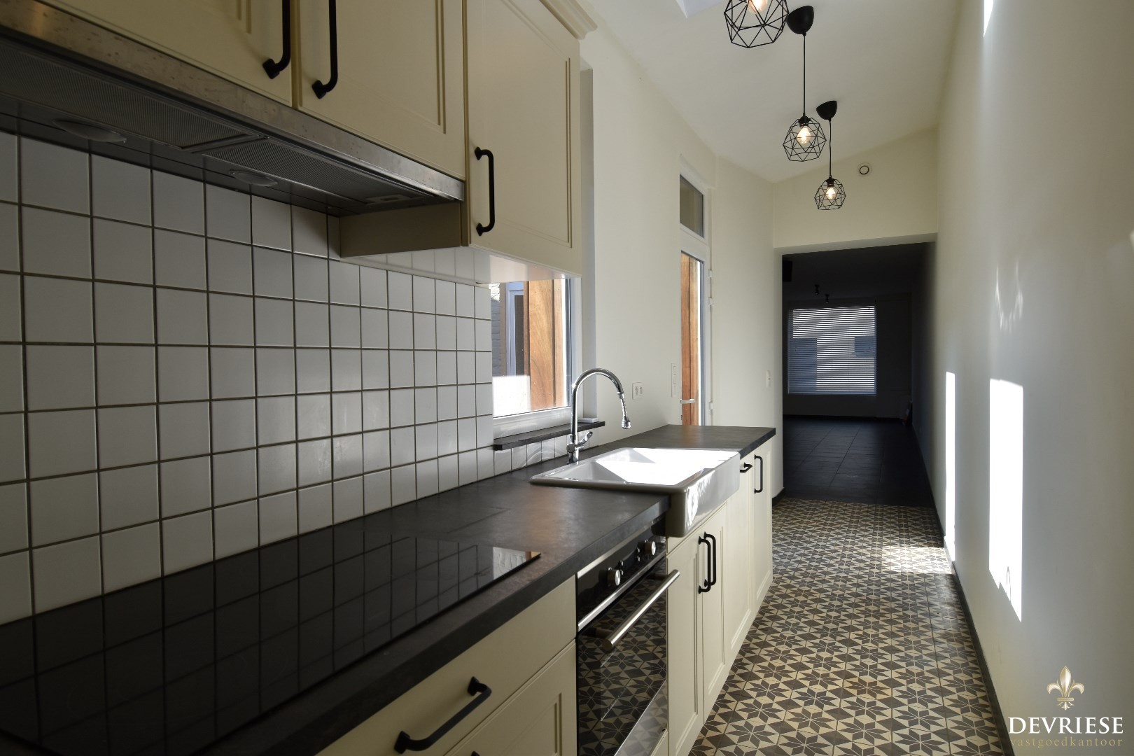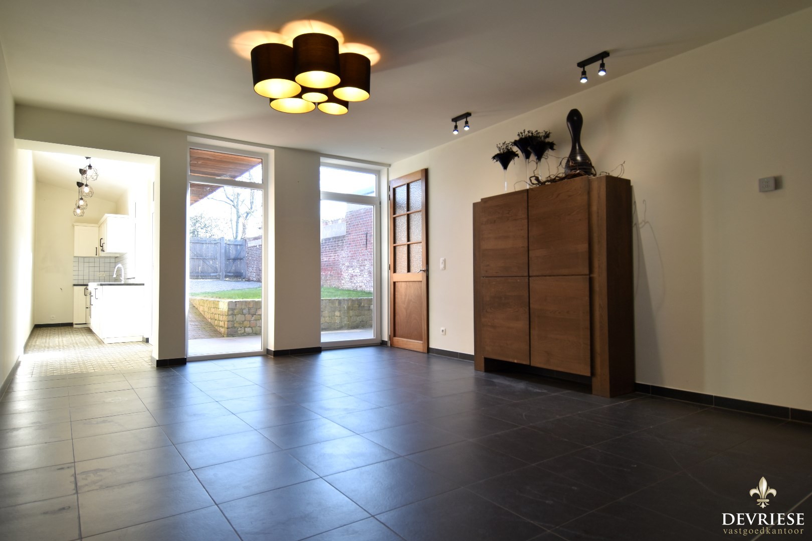 De lichtrijke doorzonleefruimte biedt een aangename sfeer en sluit naadloos aan op de volledig geïnstalleerde keuken.