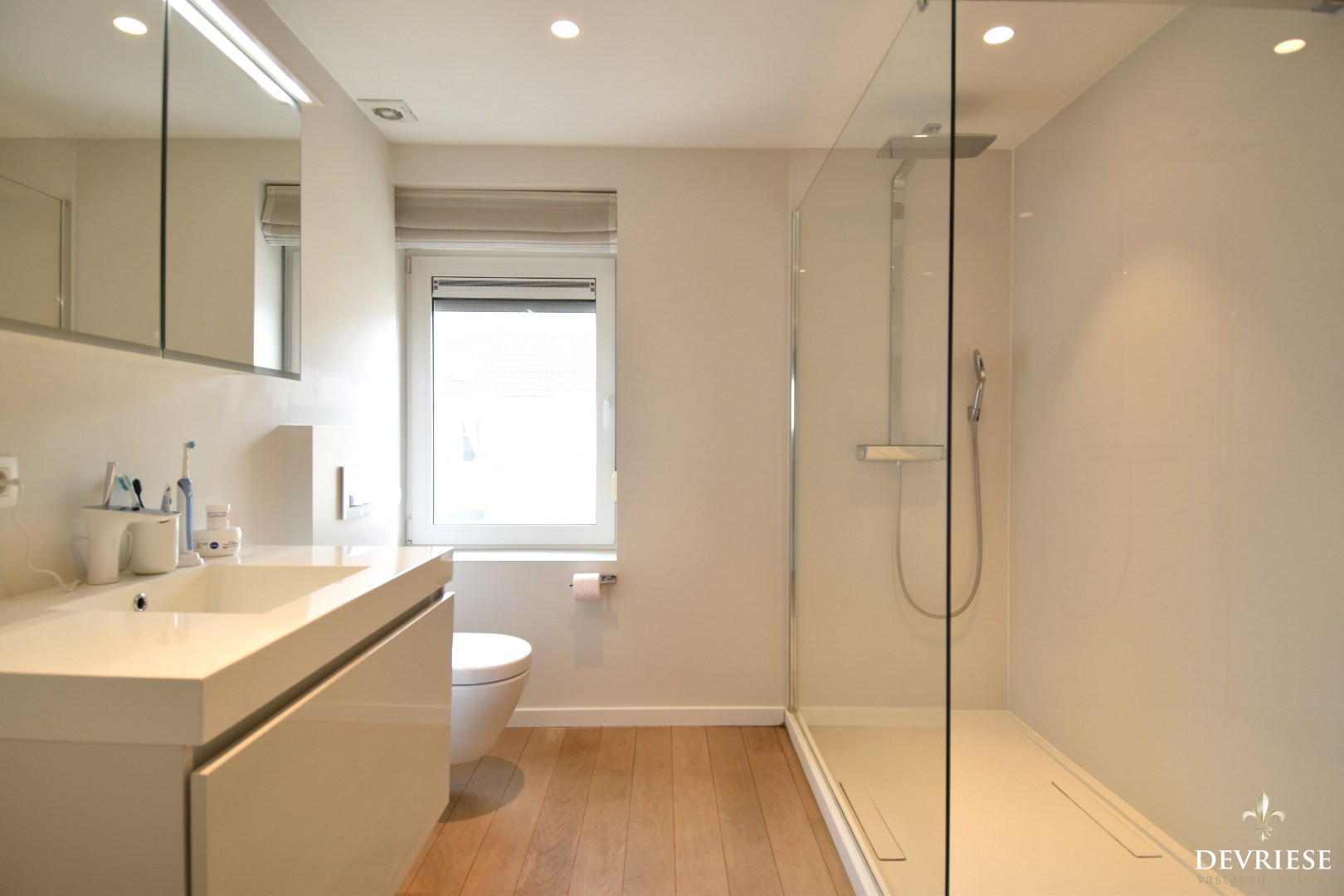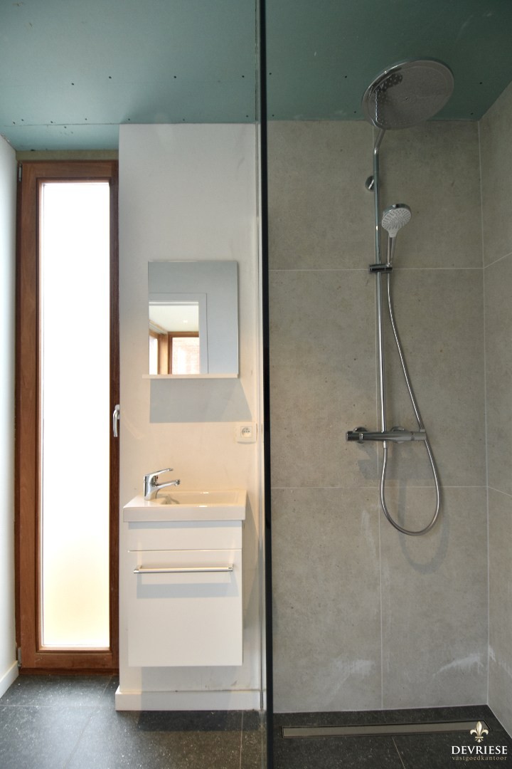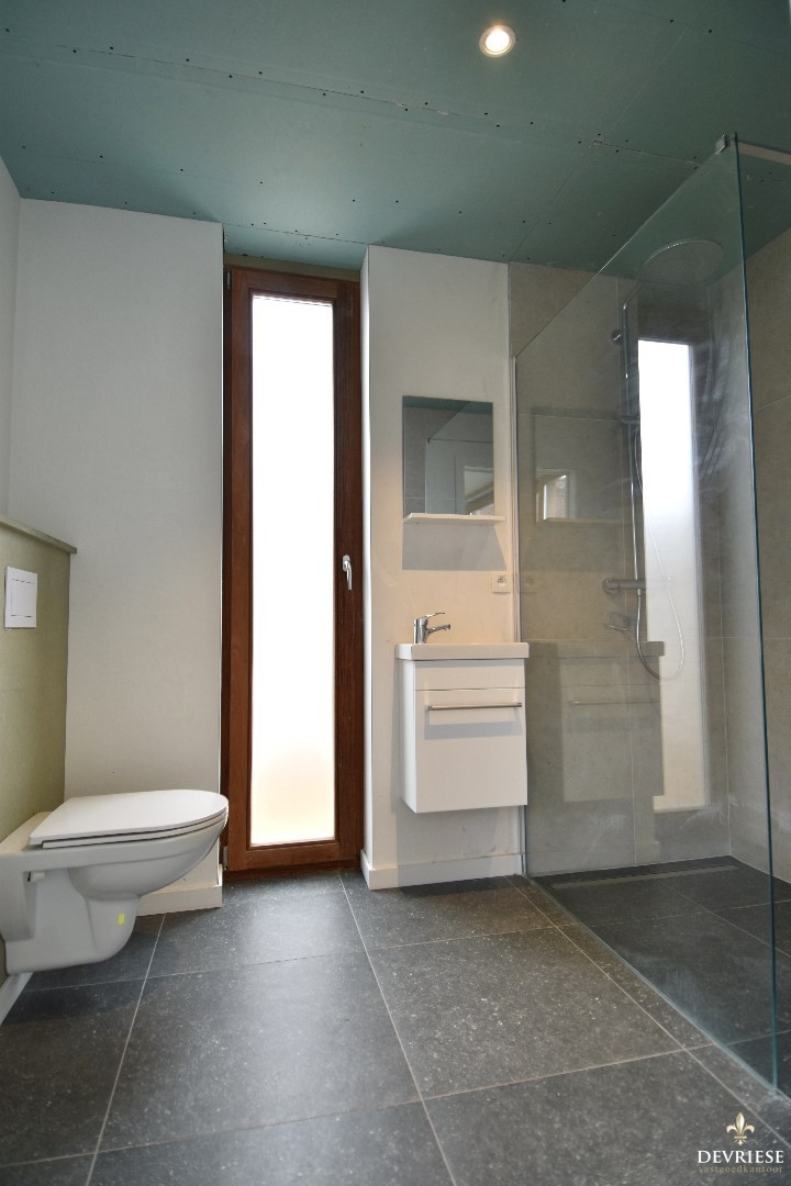 Op de eerste verdieping bevinden zich 2 slaapkamers, waarvan één momenteel ingericht is als bureau, evenals een stijlvolle badkamer uitgerust met een inloopdouche, lavabomeubel en een tweede toilet.
