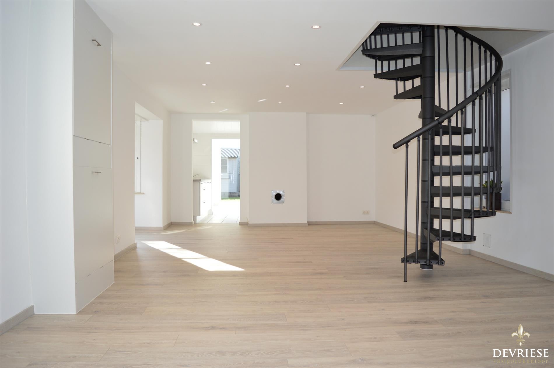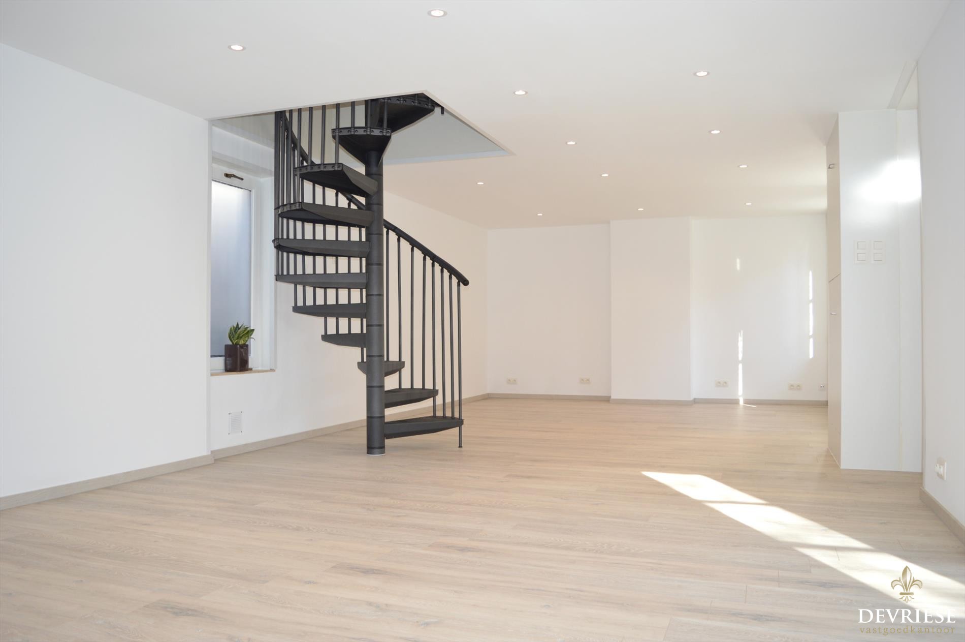 De draaitrap centraal in de leefruimte is een eye-catcher. Deze brengt ons naar de 2 slaapkamers boven met tussenin een overloop waar een bureelruimte is voorzien.