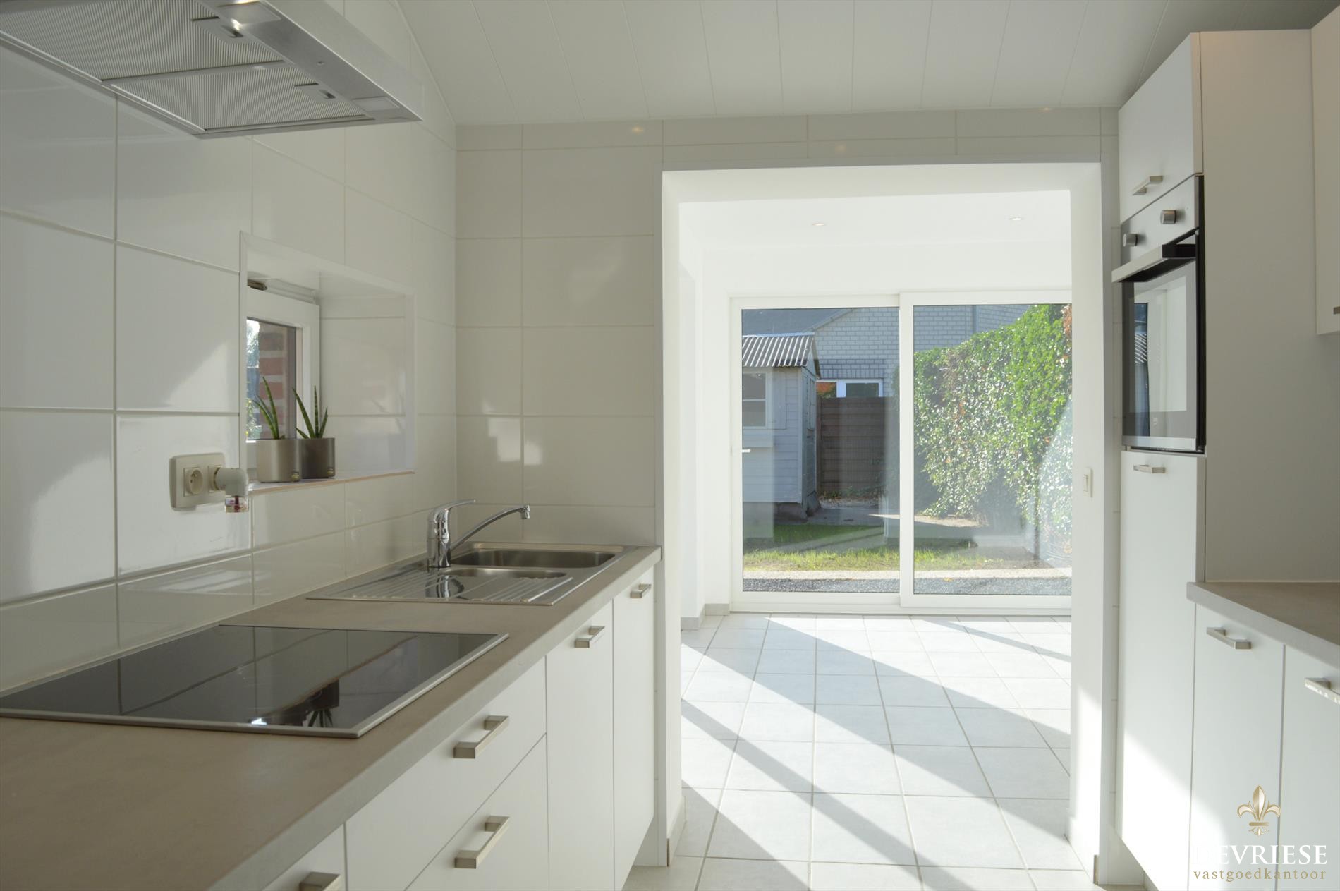 Aanliggend bevindt zich de nieuwe, ingerichte keuken. Deze biedt plaats aan een eigen zit- of eethoek, met vol zicht op de tuin, dankzij twee grote schuiframen. Spreekt voor zich dat ook deze ruimte veel daglicht geniet en het ook hier dus aangenaam vertoeven is.
