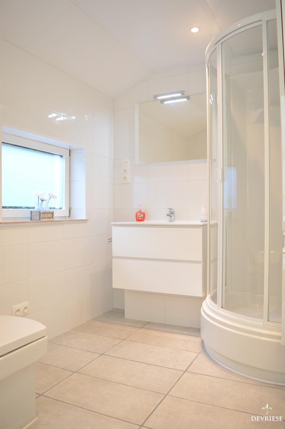 Naast de keuken, de nieuwe badkamer met toilet, lavabomeubel en douche.