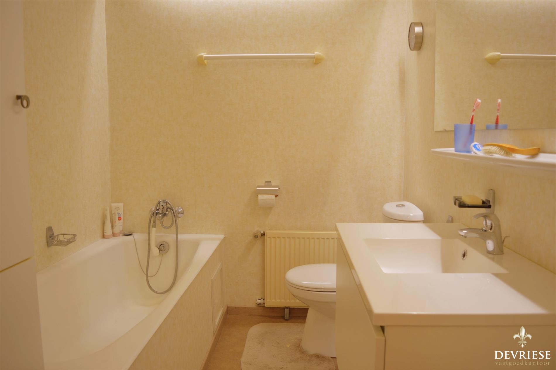 De instapklare badkamer, gelegen op de eerste verdieping, beschikt over ligbad, lavabo en toilet.