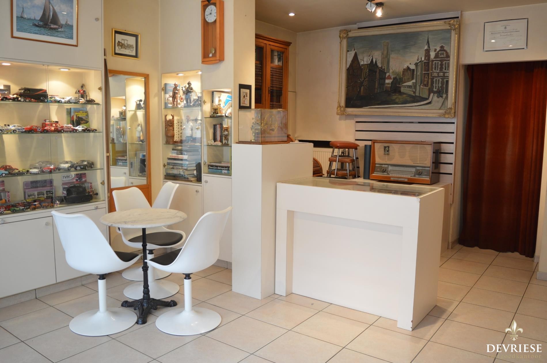 Op het gelijkvloers vooraan bevindt zich een winkel-/praktijkruimte met daarachter de gezellige leefruimte met houtkachel en open keuken. Tevens is er een ruime bergruimte en kelder aanwezig.