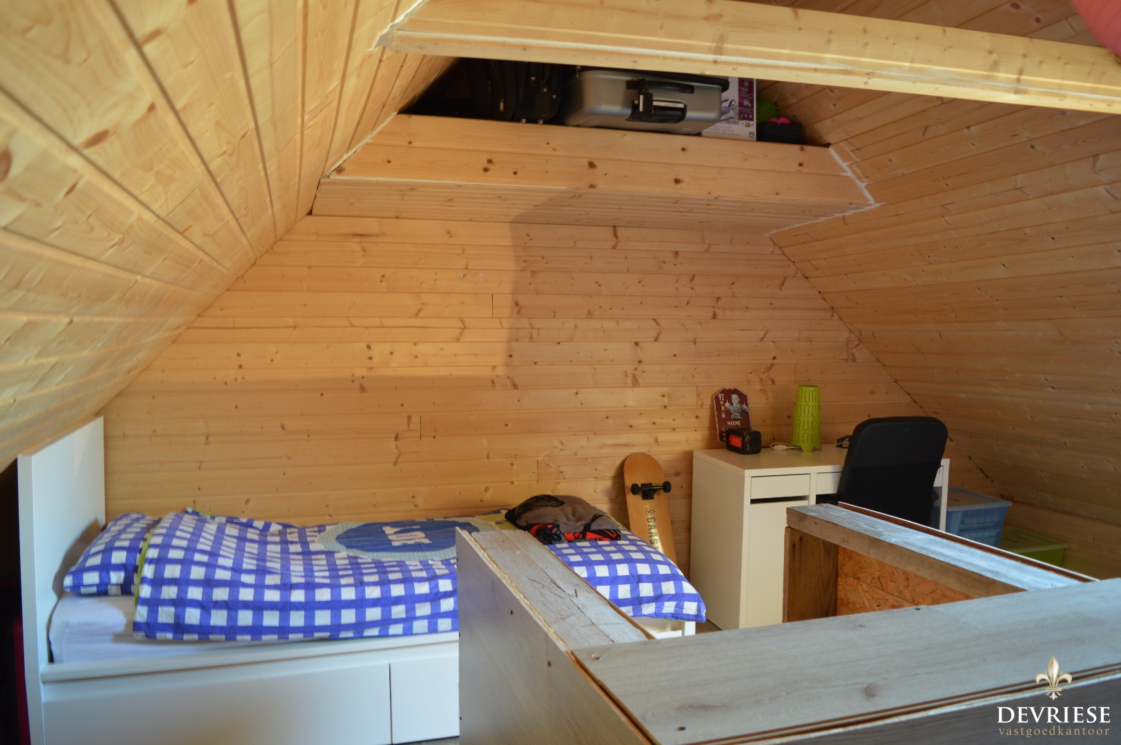 Via een vaste trap bereiken we de zolderverdieping, die ingericht is als 3e slaapkamer.