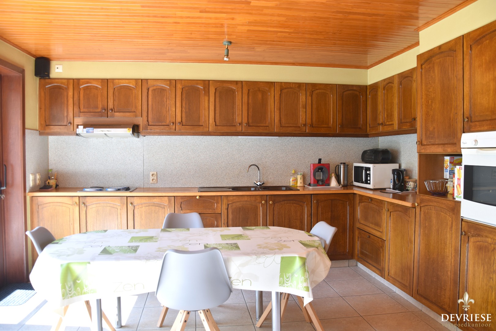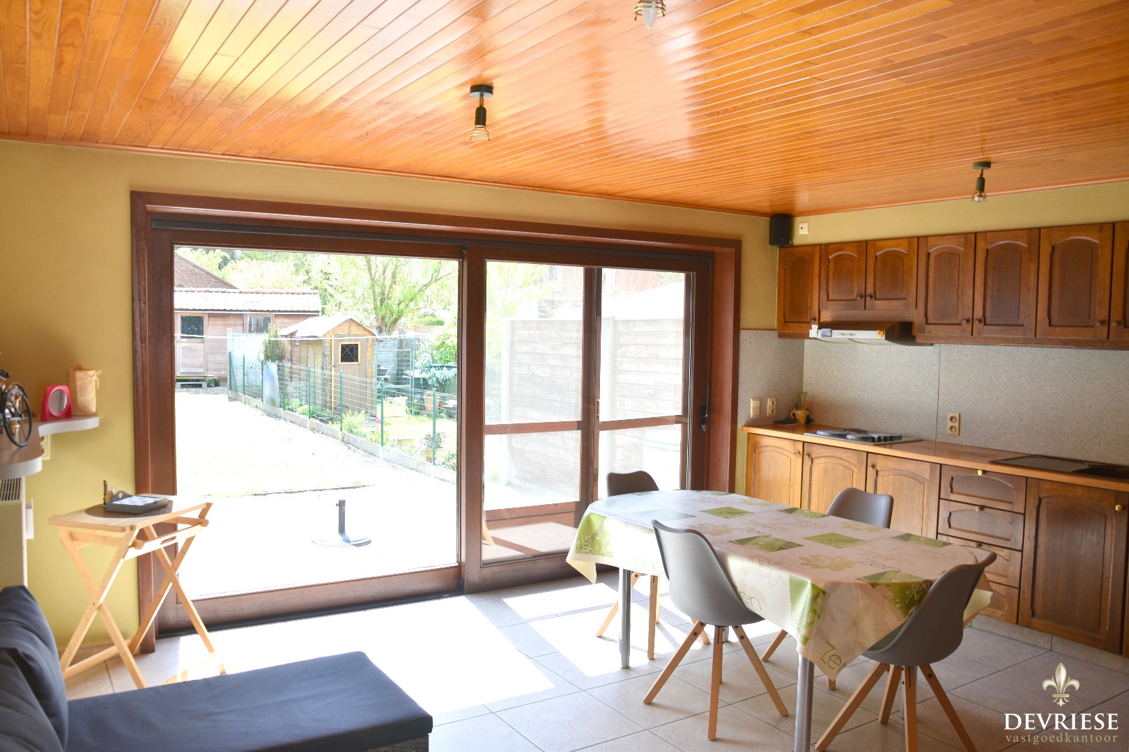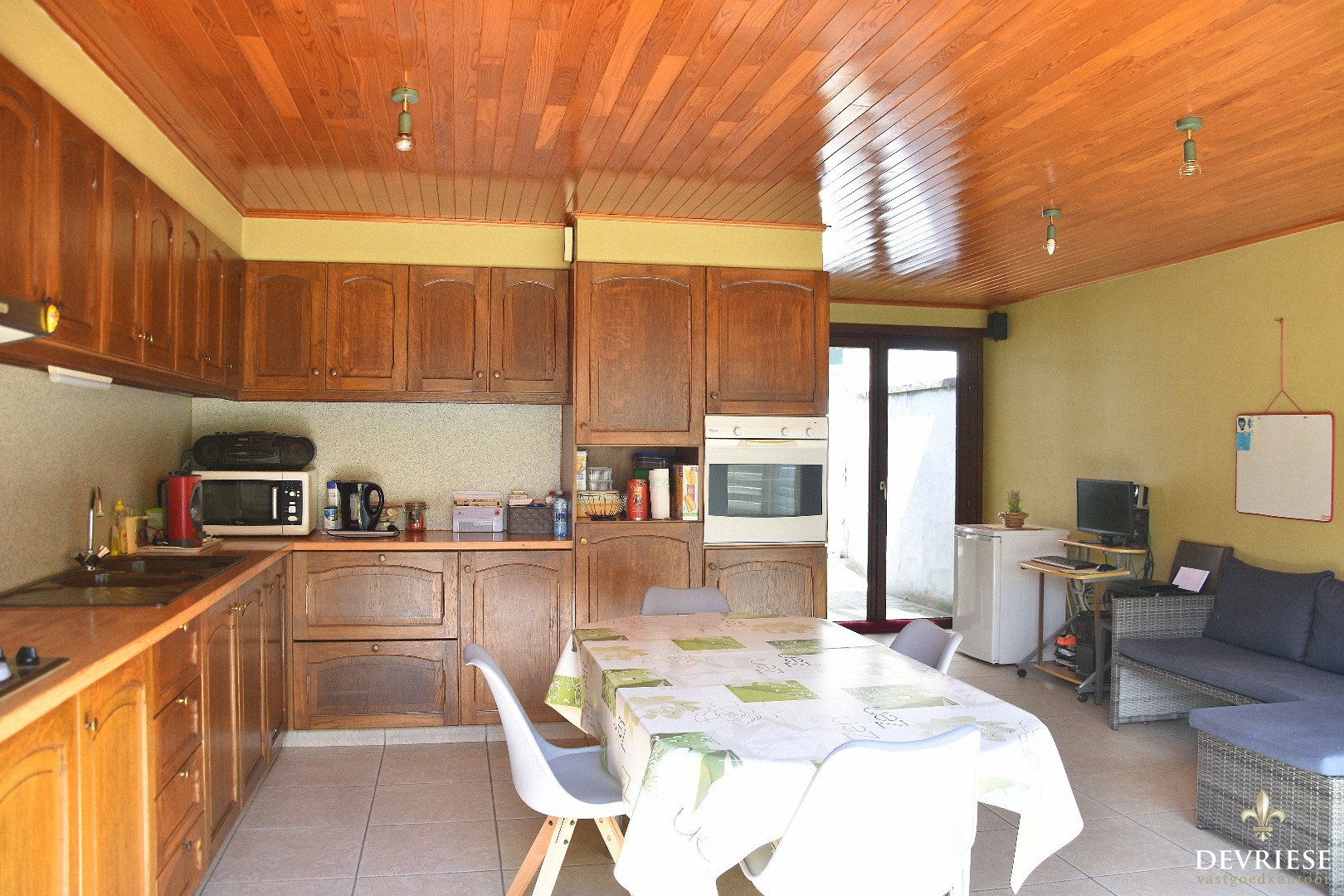Achteraan is de woning aanzienlijk uitgebreid geweest. Hier bevindt zich de ruime leefkeuken, die vol zicht geniet op de uitgestrekte achtertuin. Deze is gunstig georiënteerd en het is er zalig vertoeven.