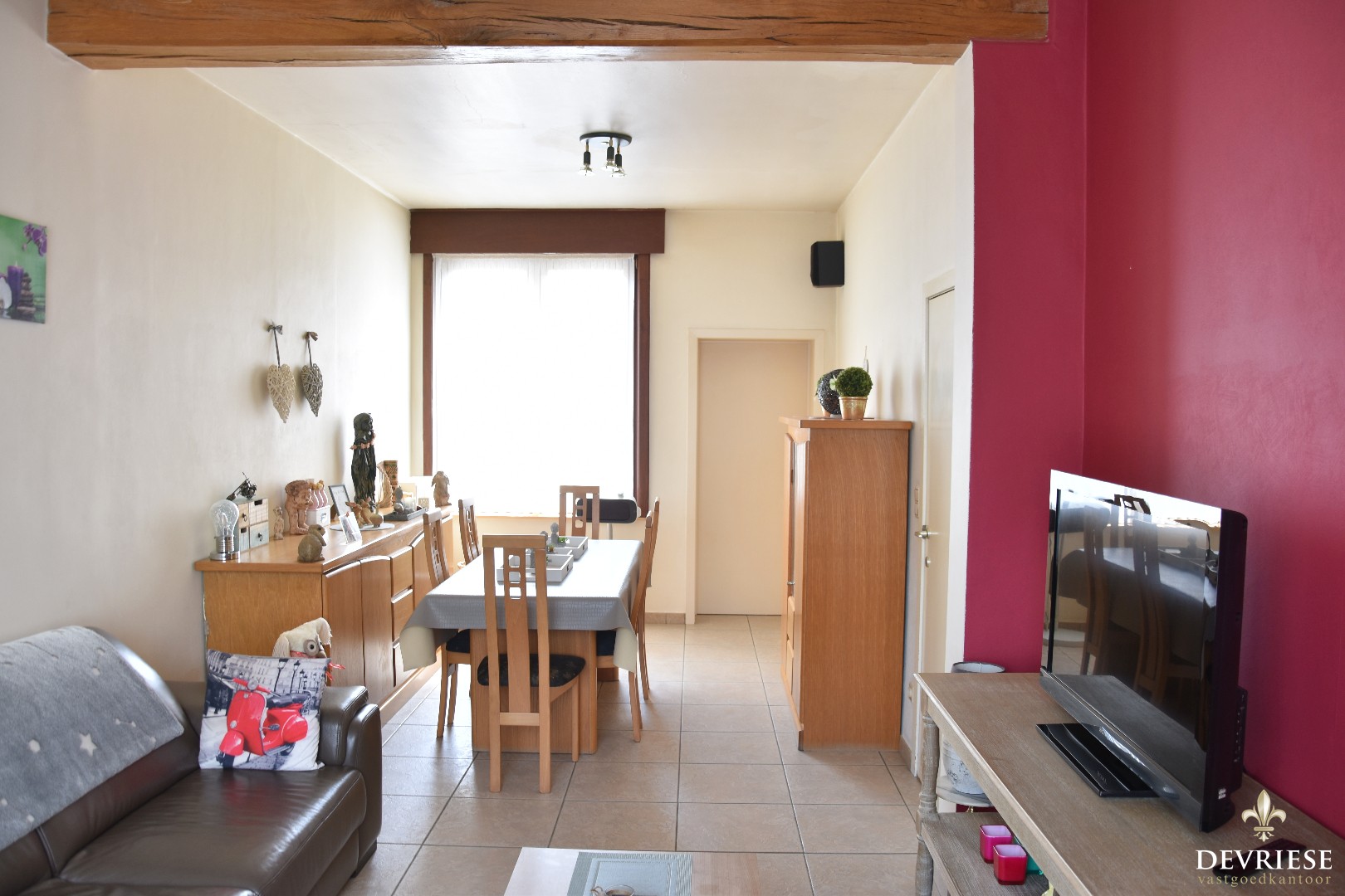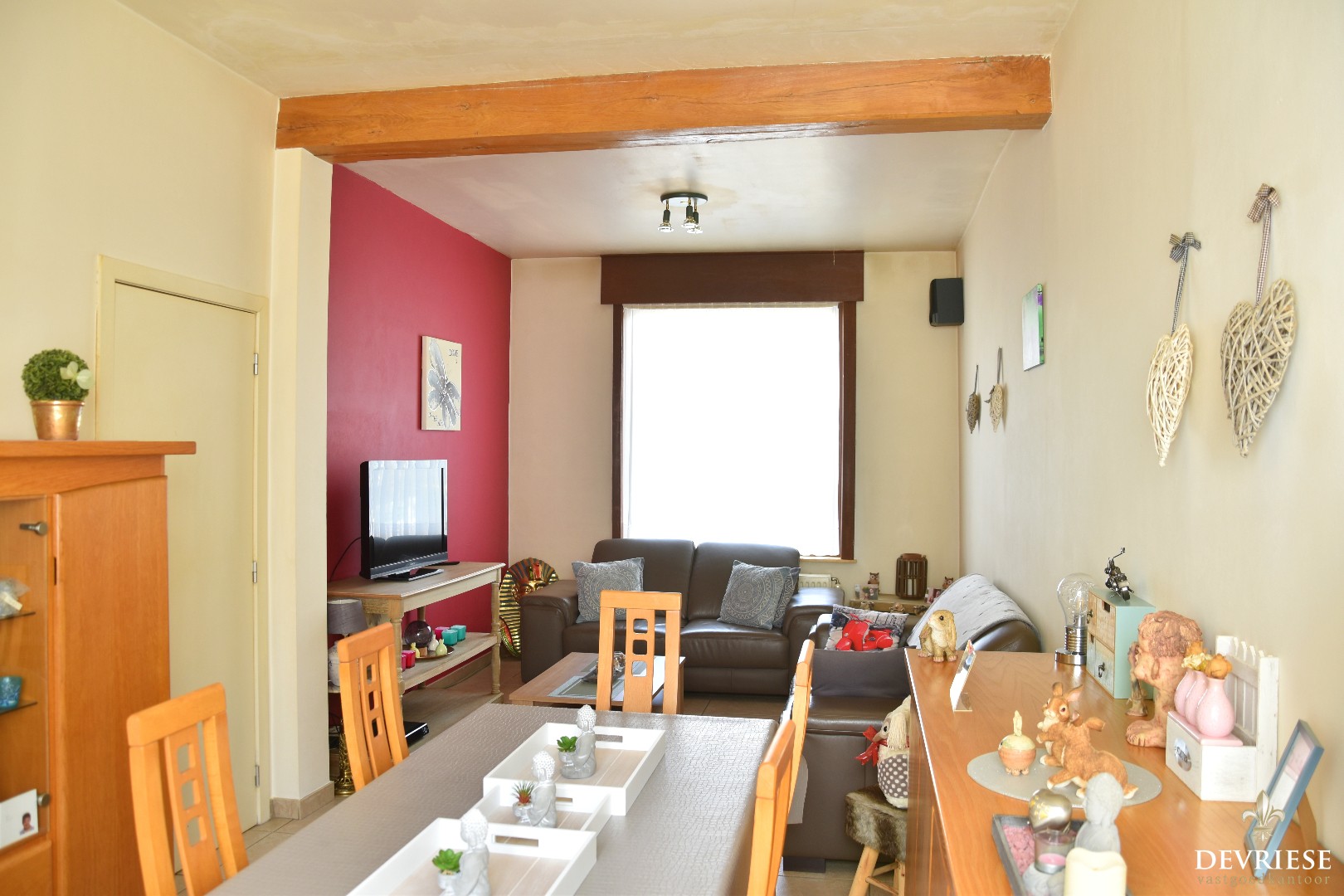 We treden de gezinswoning binnen via de aparte inkomhal, met vooraan de gezellige en lichtrijke leefruimte.