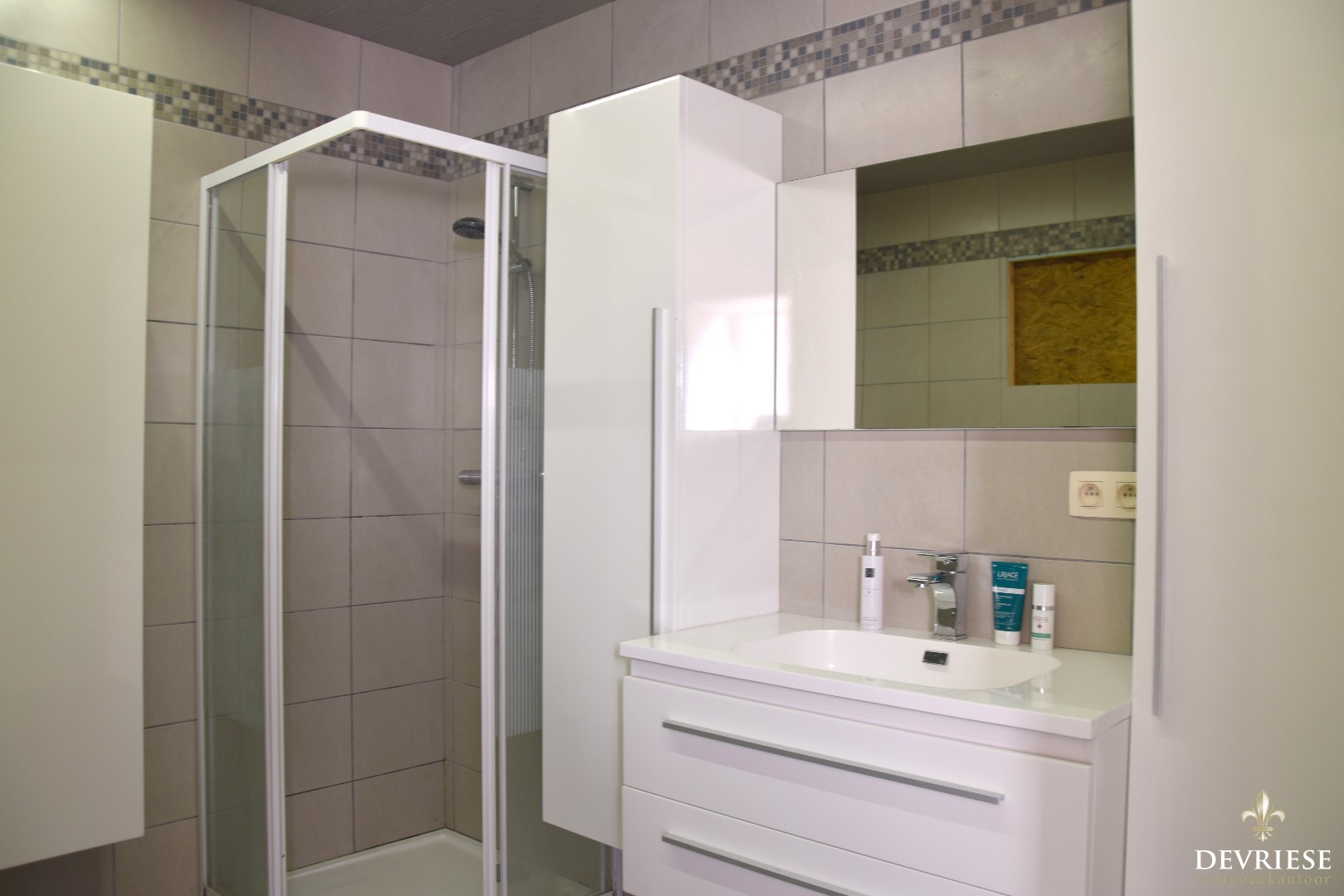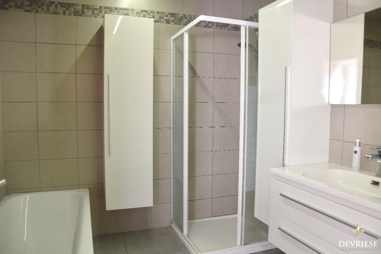 Verder op het gelijkvloers vinden we de nieuwe badkamer met bad en douche, een apart gastentoilet, een aparte wasplaats en berging.