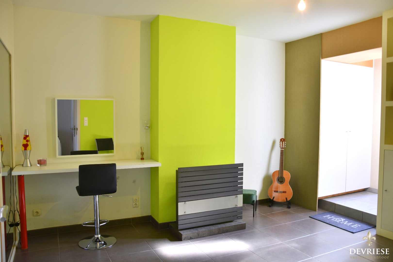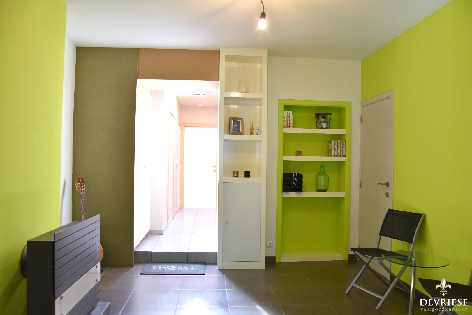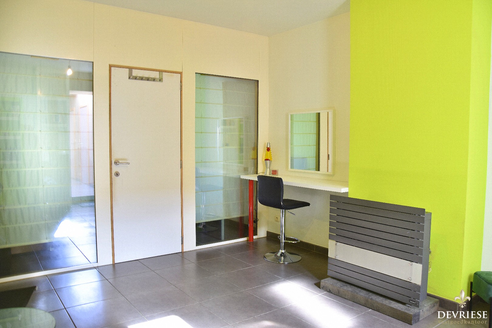 U komt binnen via de aparte inkomhal, die rechtstreeks toegang biedt tot de praktijkruimte. Ideaal voor wie een bijberoep uitoefent of een extra bureauruimte wenst. Vooraan de woning is er een eerste slaapkamer ingericht.