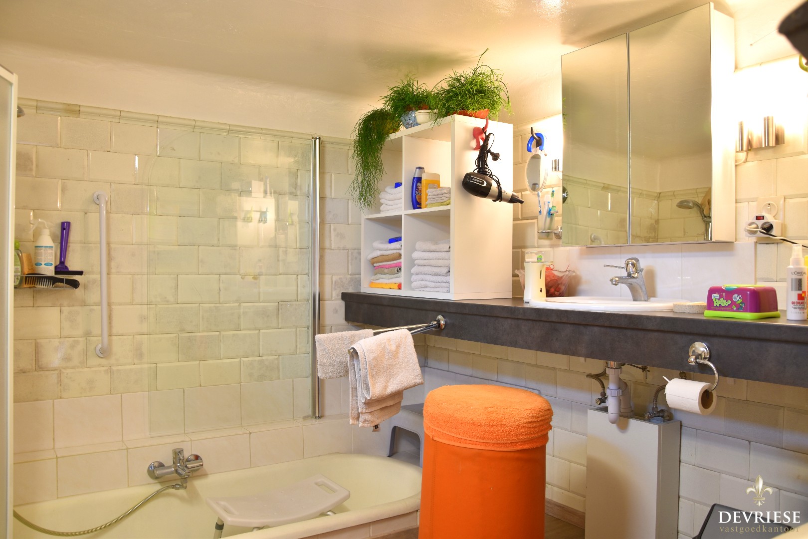 De badkamer bevindt zich op een tussenverdiep, met daaronder een praktische kelderruimte.