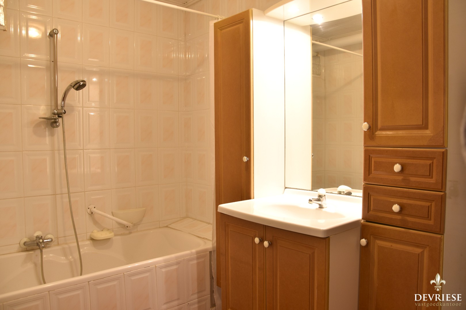 Via de aparte inkomhal treden we de lichtrijke leefruimte binnen. Dankzij de open keuken vormt de leefruimte één ruimtelijk geheel waar het aangenaam vertoeven is. Aanliggend treffen we de ruime badkamer met bad, lavabo en toilet.