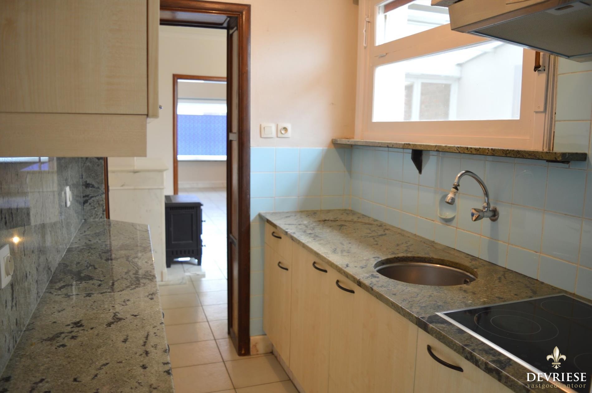 De uitbouw van de woning herbergt een praktische keuken die uitkijkt op de veranda met tuinzicht. Achteraan bevindt zich het gastentoilet.