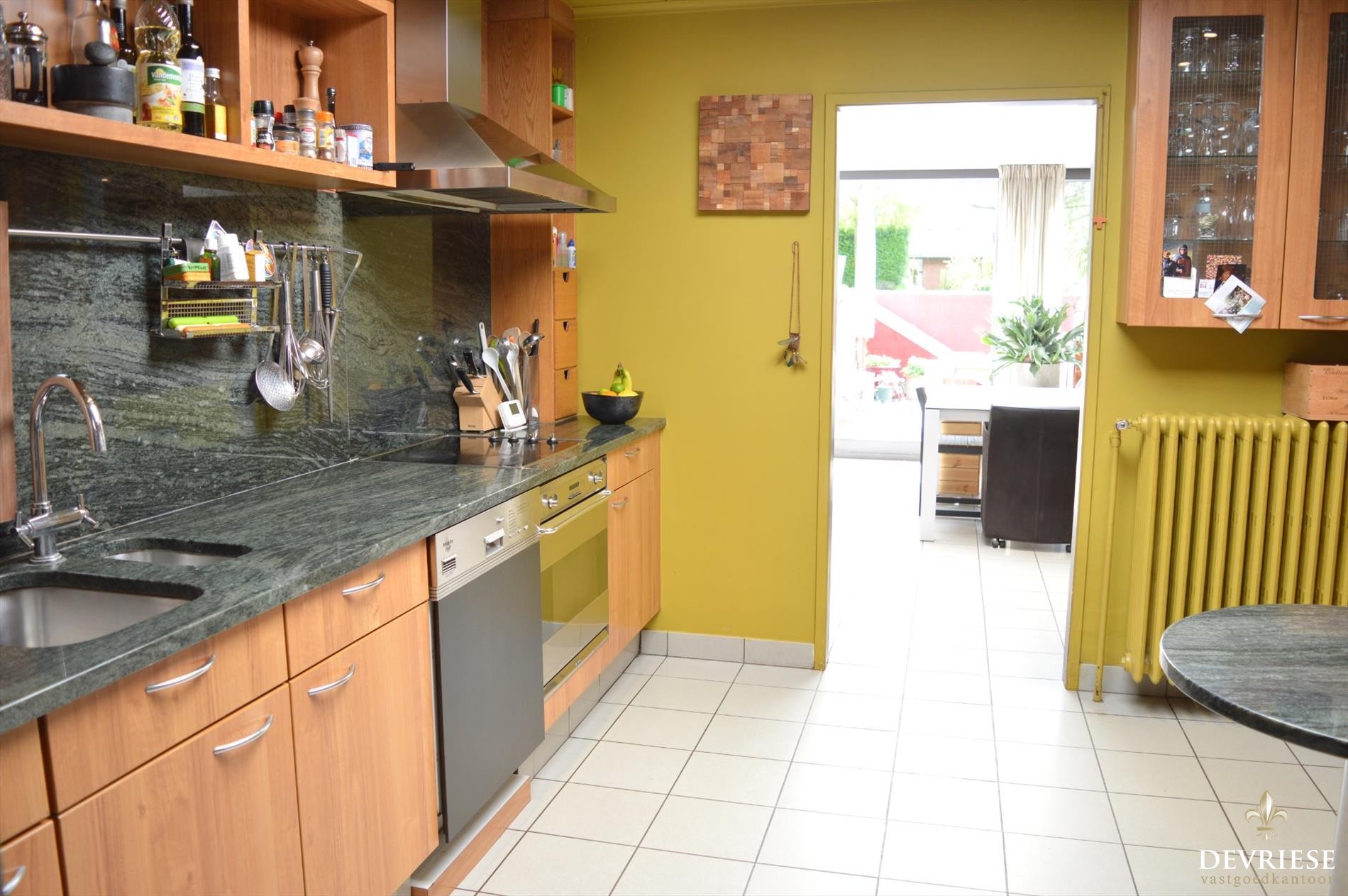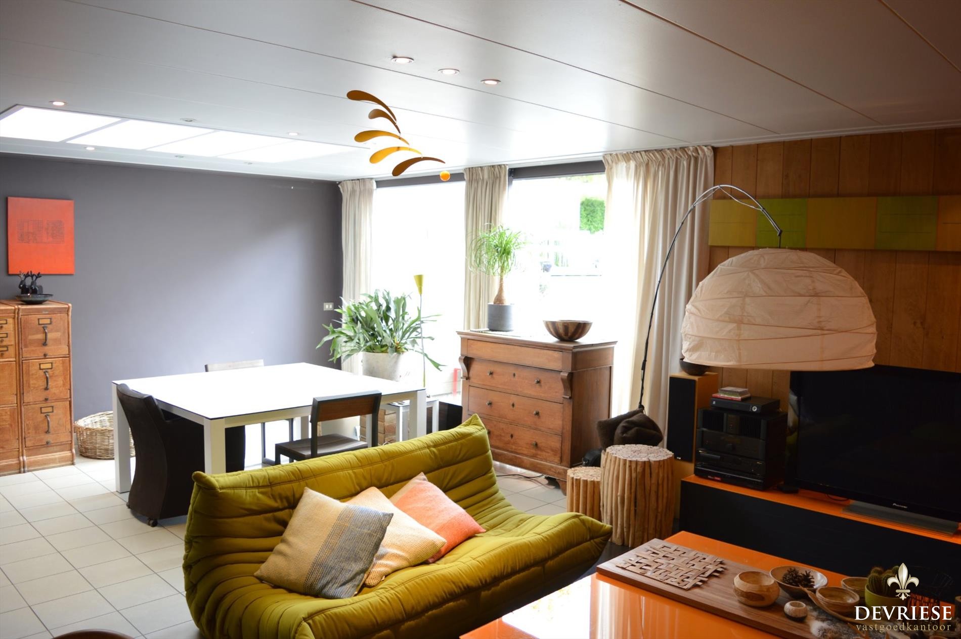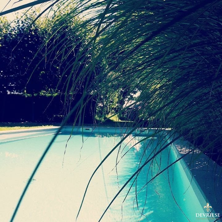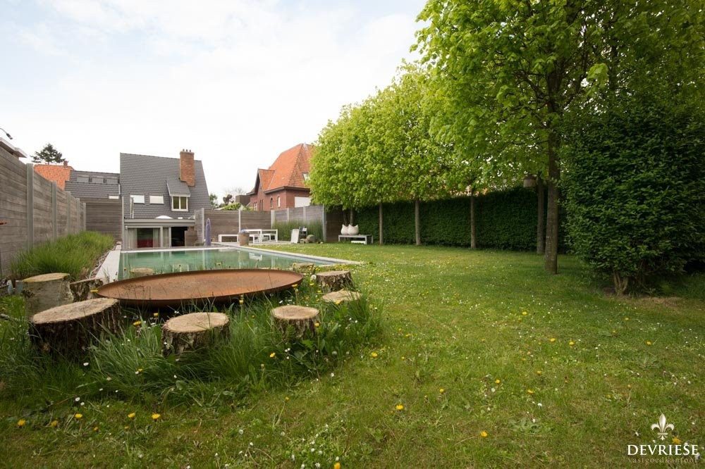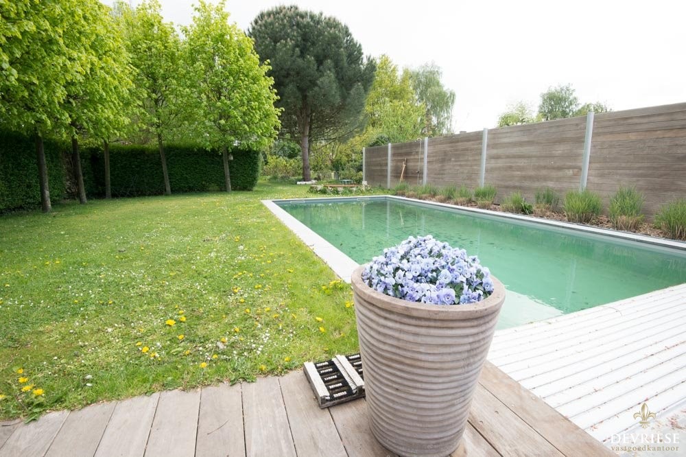 De cosi woonkamer ademt rust en gezelligheid en van hieruit geniet u van het zicht op de achtertuin en het terras. Door de zuidelijke oriëntatie van de tuin is het er steeds zalig vertoeven, omgeven door groen en de volledige privacy. Het zwembad is de kers op de taart en een leuke extra voor jong en oud. Hier komt u volledig tot rust.