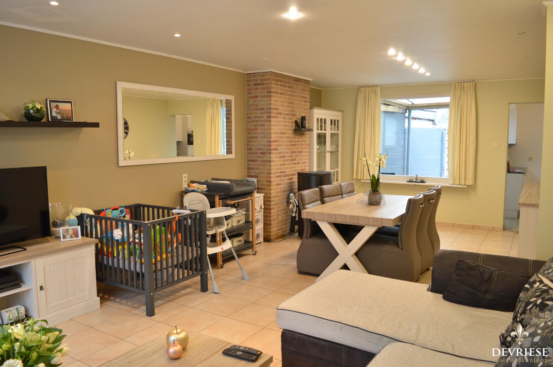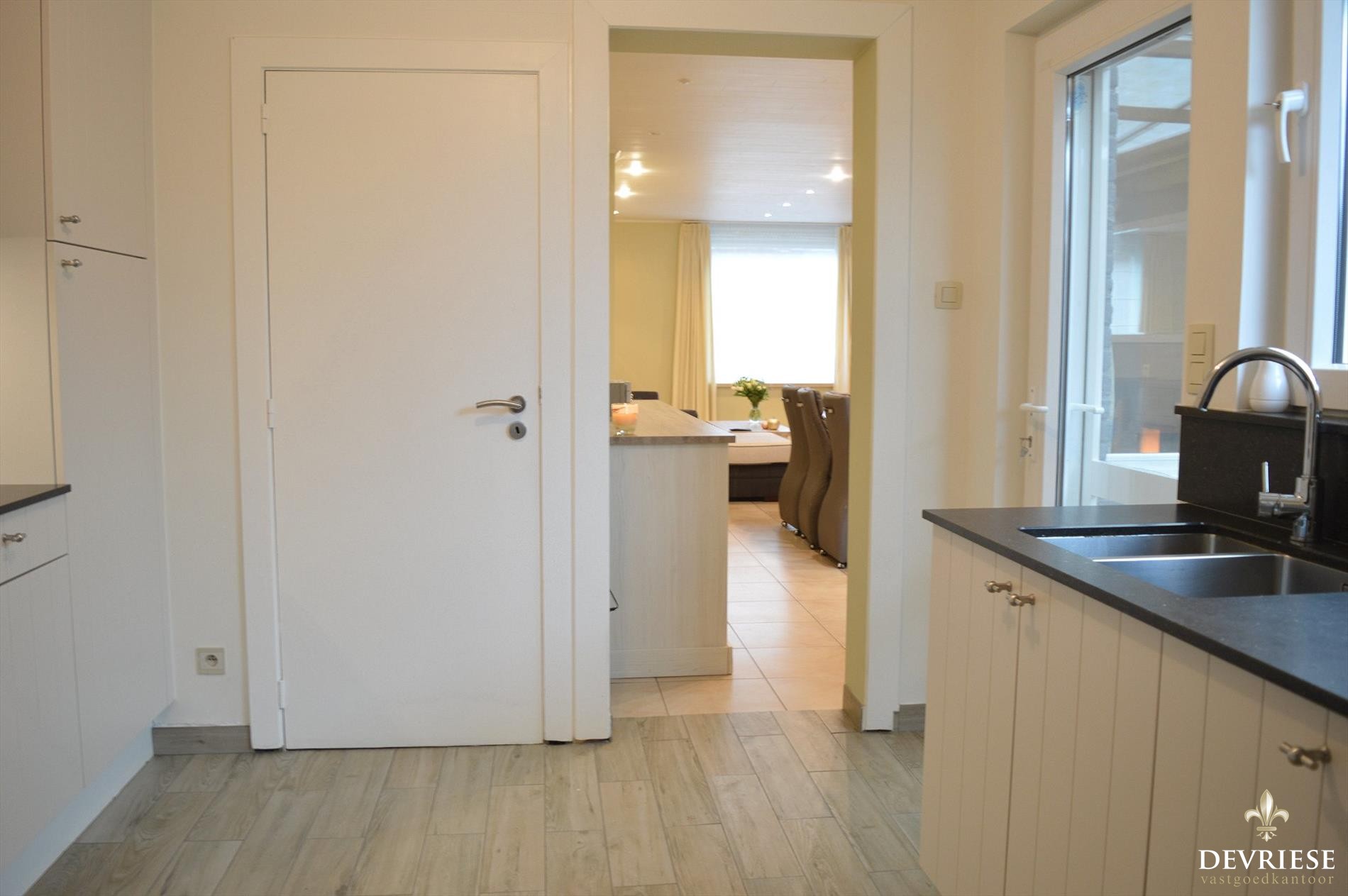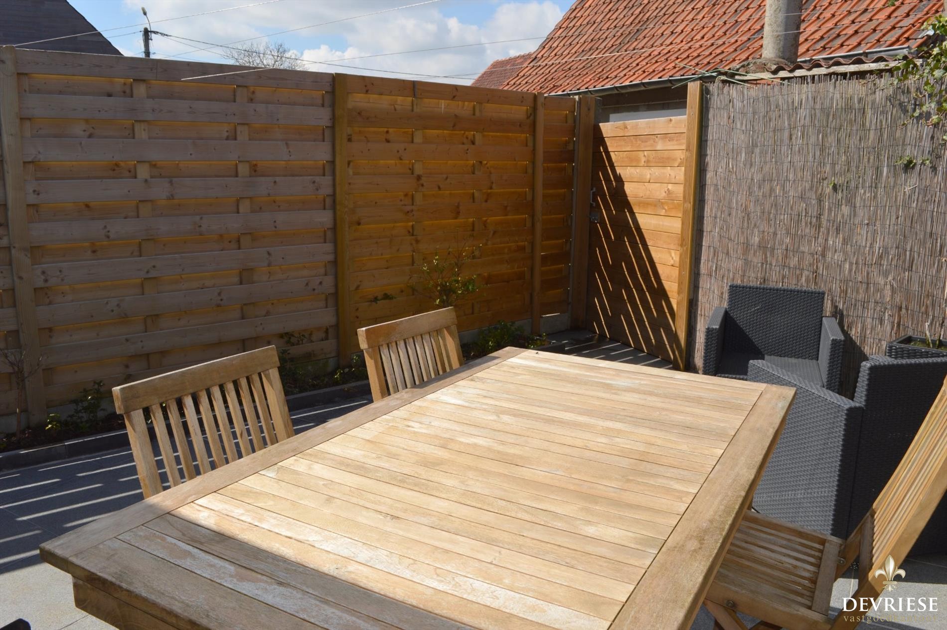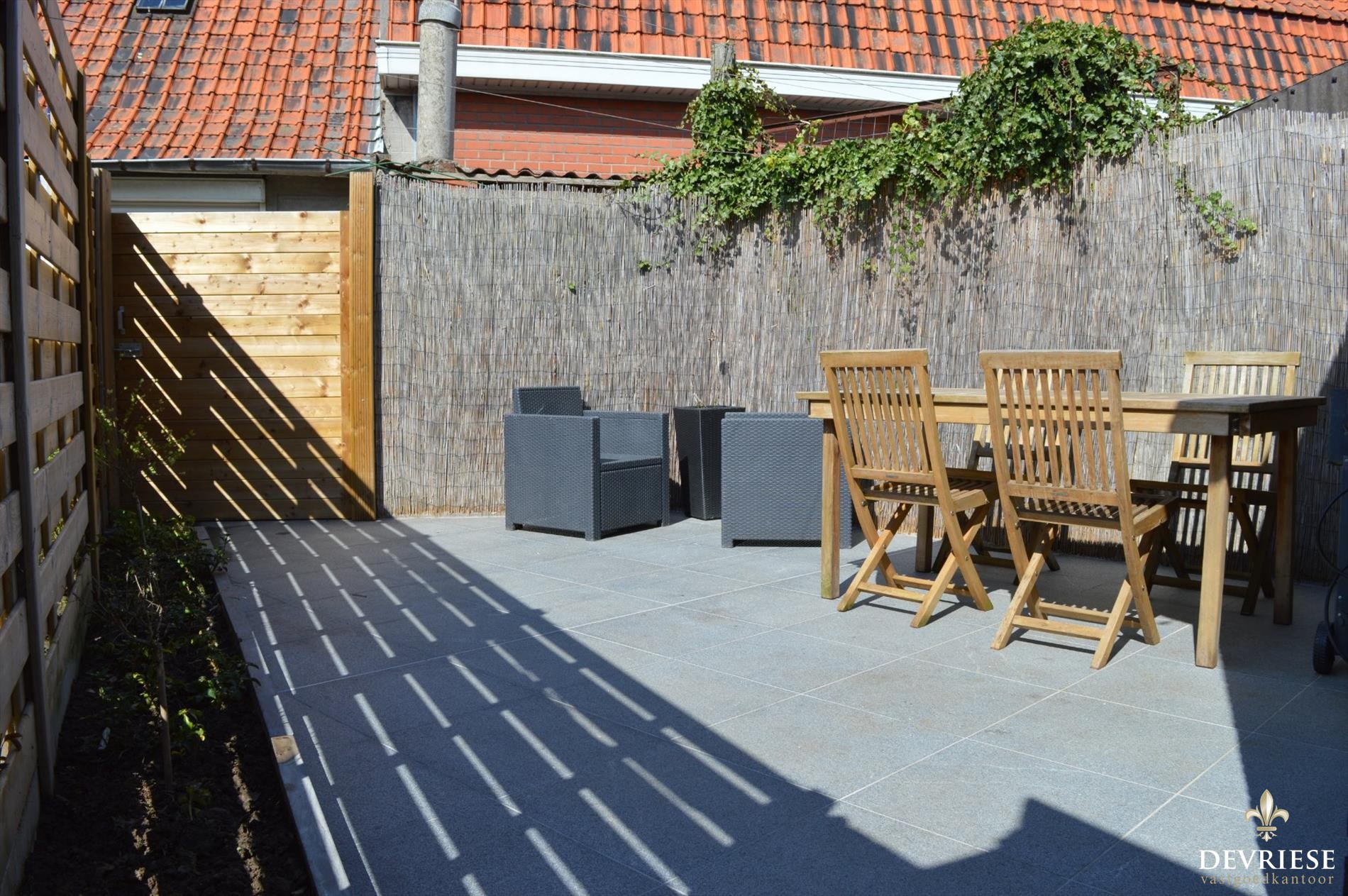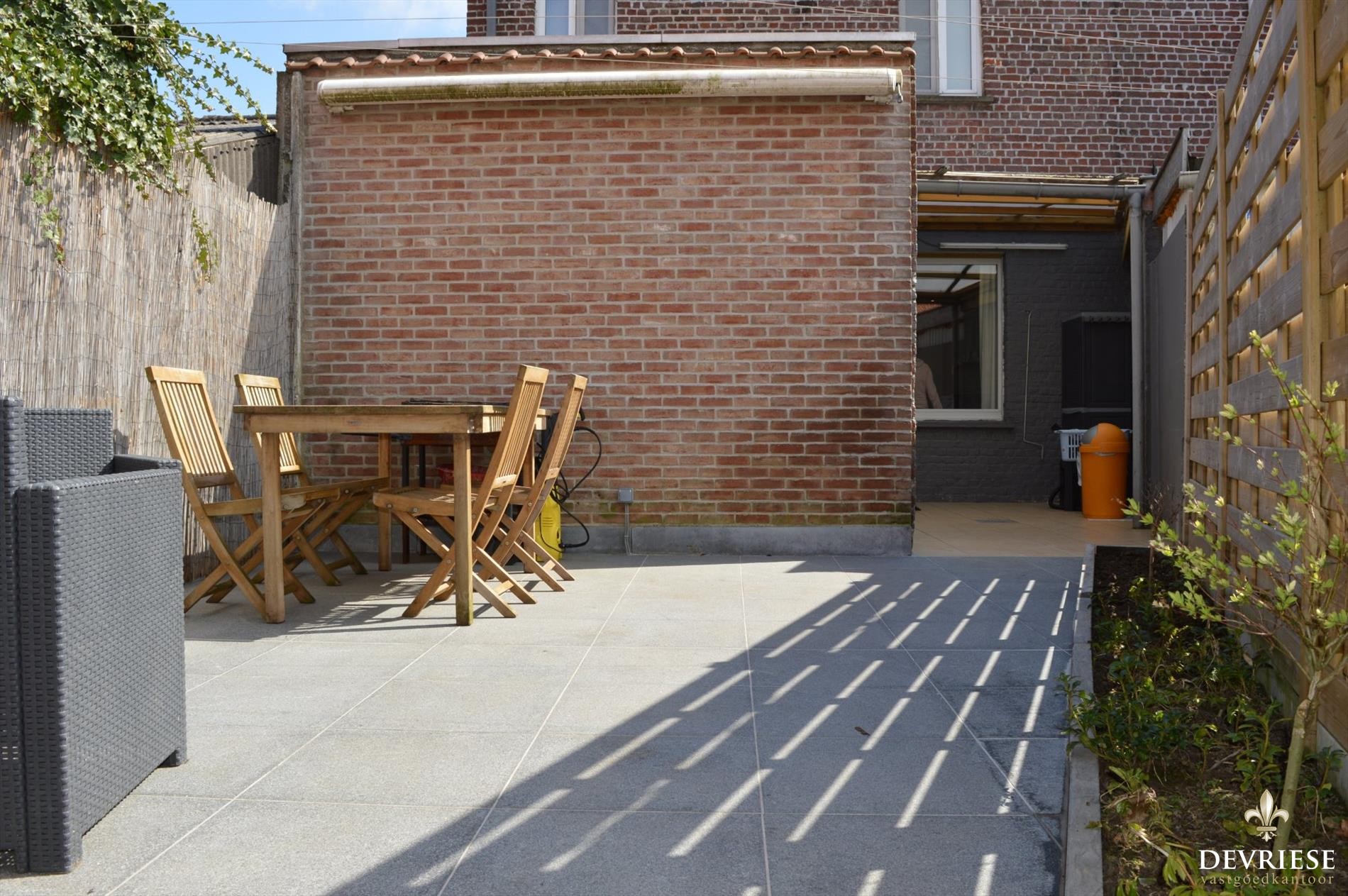 Vanuit de keuken is er toegang tot het fraai aangelegde en zeer zonnige terras achteraan. Geniet er van de rust en de eerste zonnestralen van het jaar.