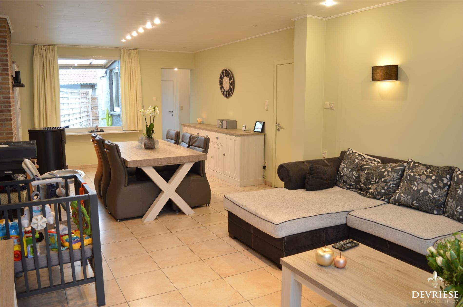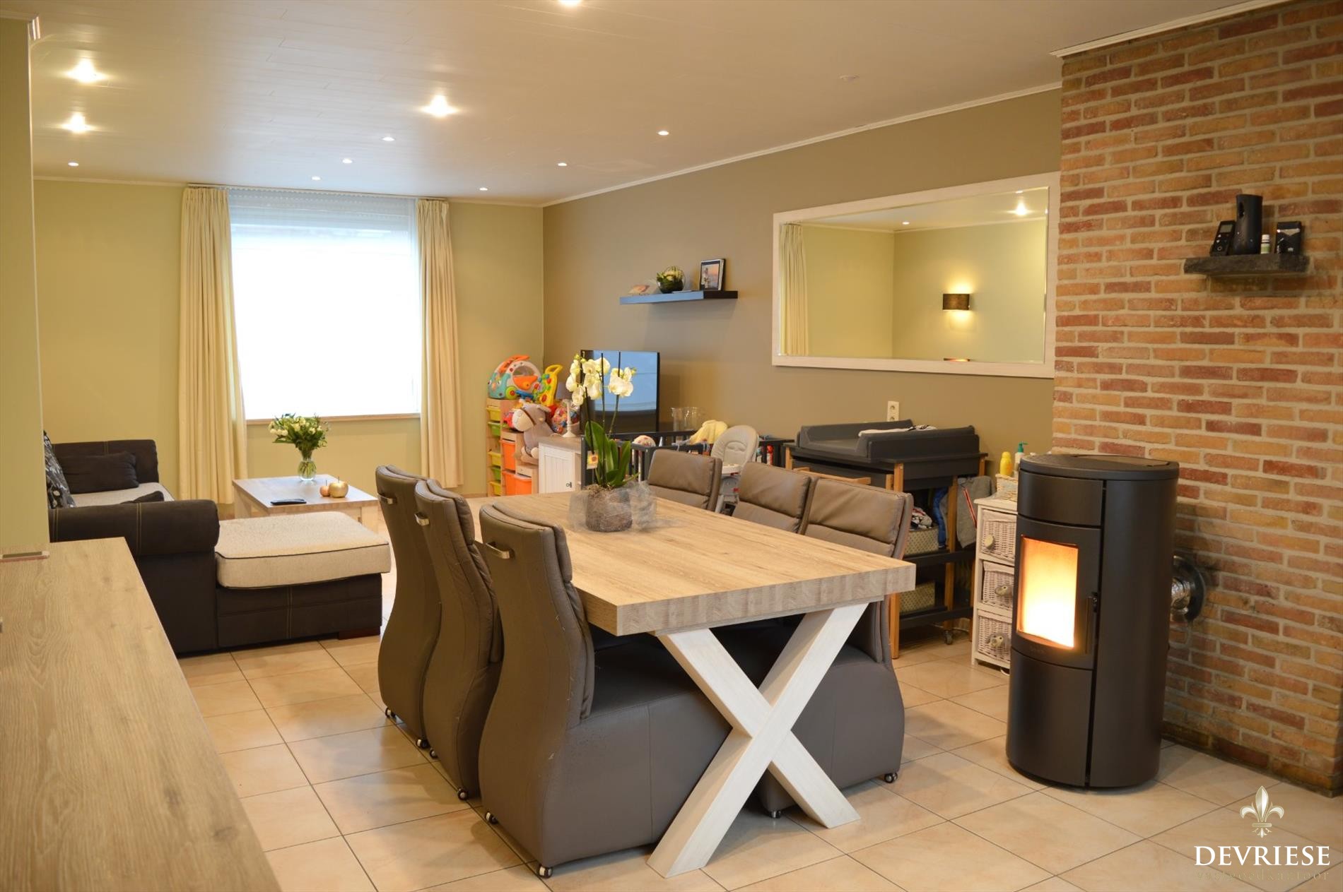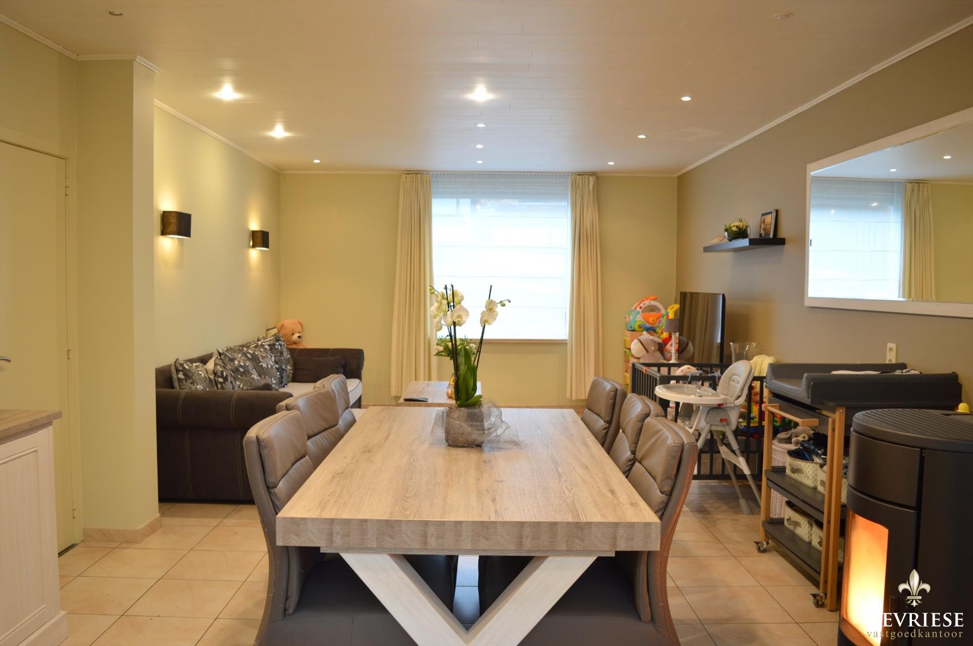 Deze aantrekkelijke instapklare gezinswoning ligt op een boogscheut van het centrum en van belangrijke invalswegen. De woning omvat een ruime inkomhal, grote leefruimte met recente pelletkachel en een pas vernieuwde moderne keuken. Aansluitend een berging en gastentoilet. De woning is daarenboven voorzien van een praktische voorraadkelder.