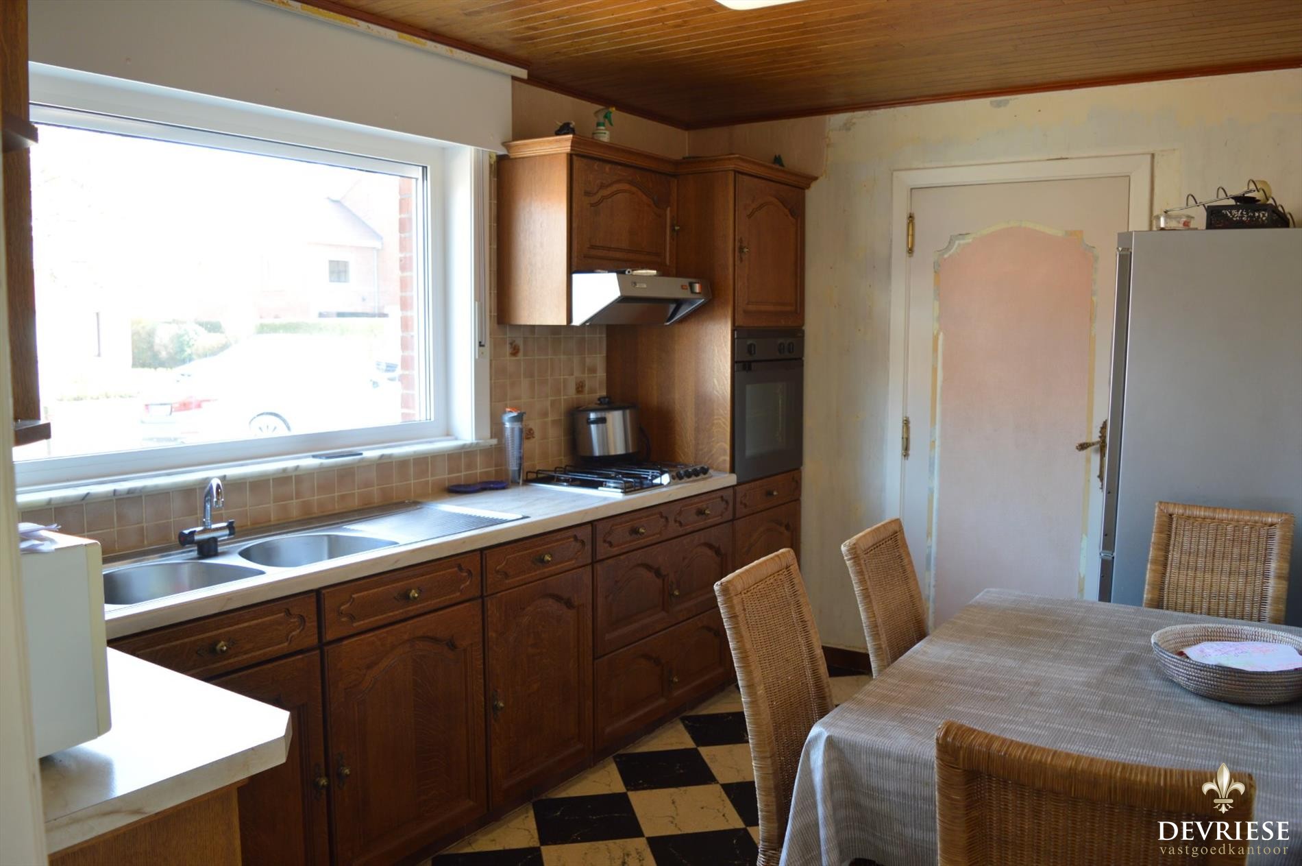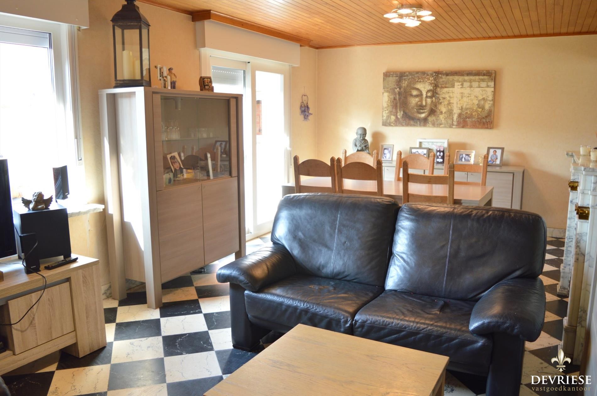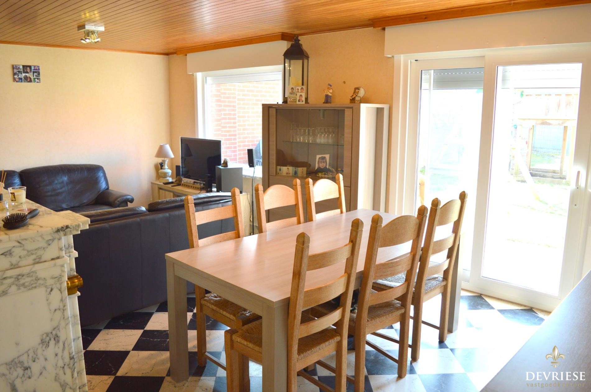 Aparte inkomhal met gastentoilet, lichtrijke leefruimte met zicht op de achtertuin, praktische keuken met extra bergruimte.