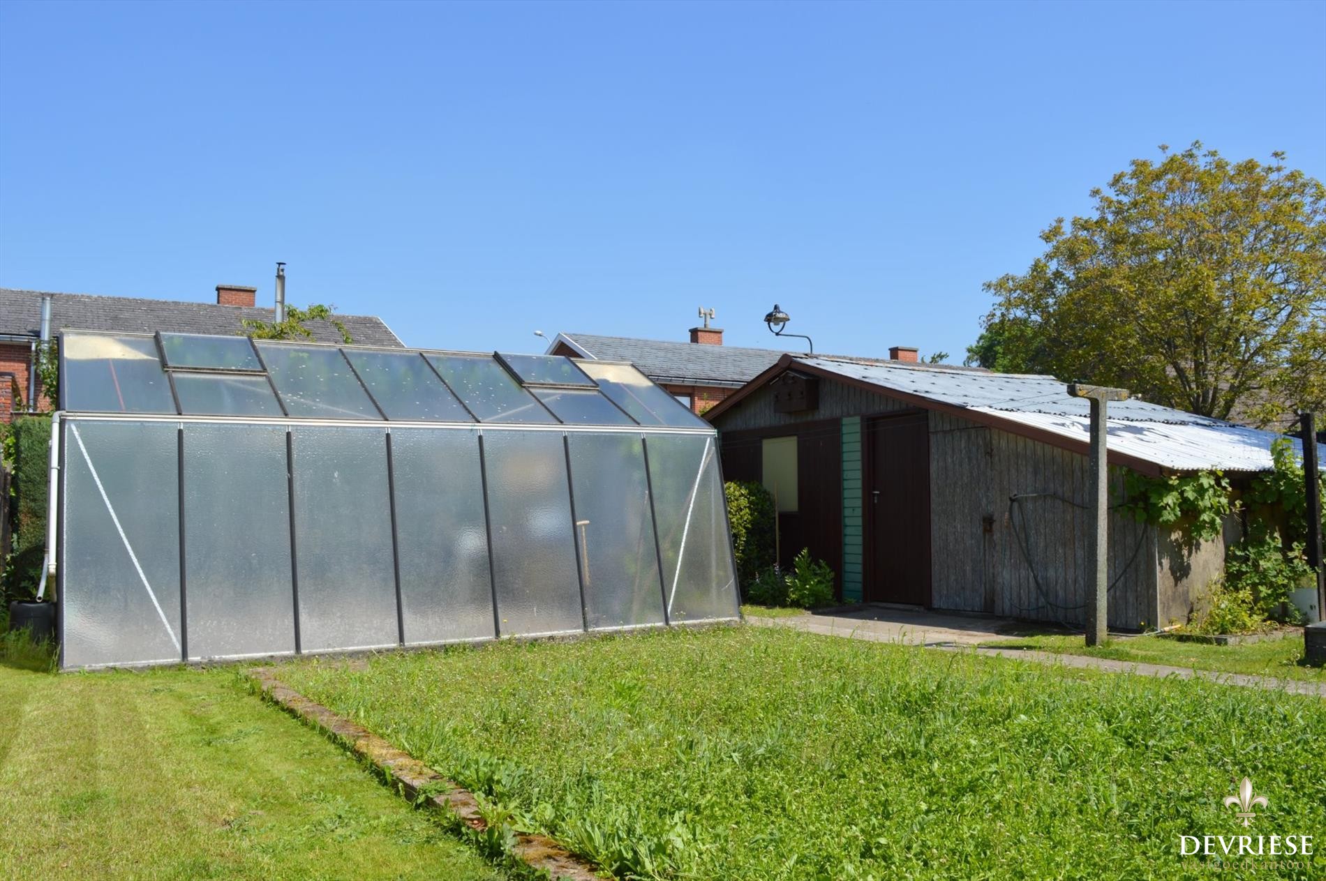 Bij het binnenkomen in de inkomhal, is er toegang tot het apart toilet en is er een kleine bergruimte voorzien. Van hieruit is er toegang tot de keuken en de gezellige leefruimte met ruime veranda en vol zicht op de tuin. Er is bovendien een garage voorzien met daarachter nog een ruime extra bergruimte. Via de veranda is er toegang tot de verrassende tuin met zuidoost oriëntatie. Dit dient als ideaal speelterrein voor de kids of voor wie groene vingers heeft.