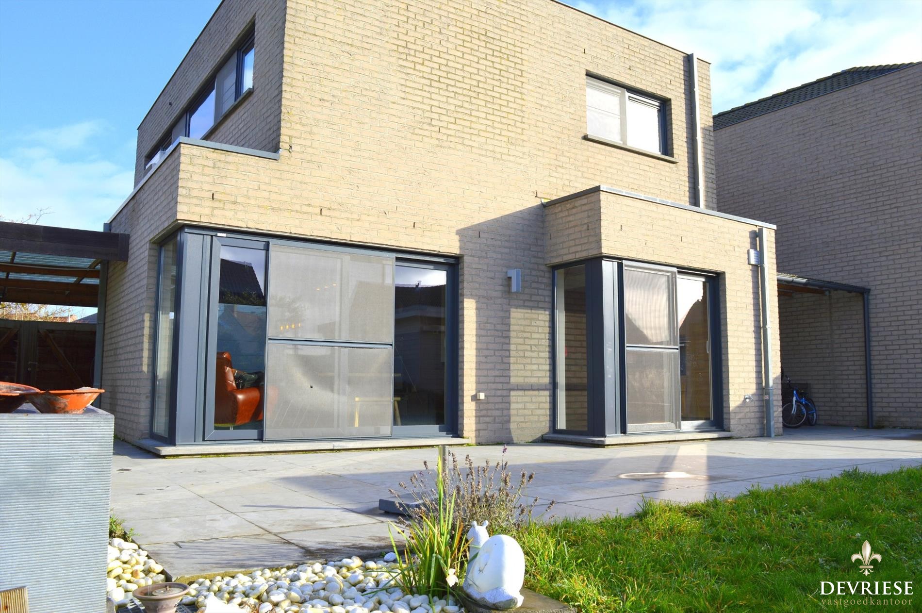 De leefruimte en keuken zijn voorzien van grote schuiframen die vol zicht en toegang geven op de tuin.
