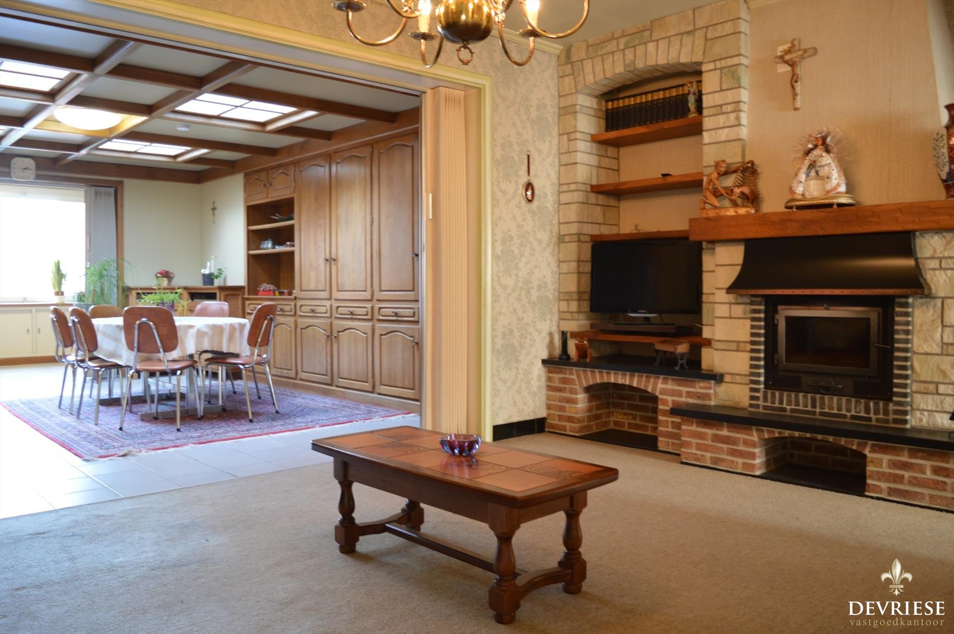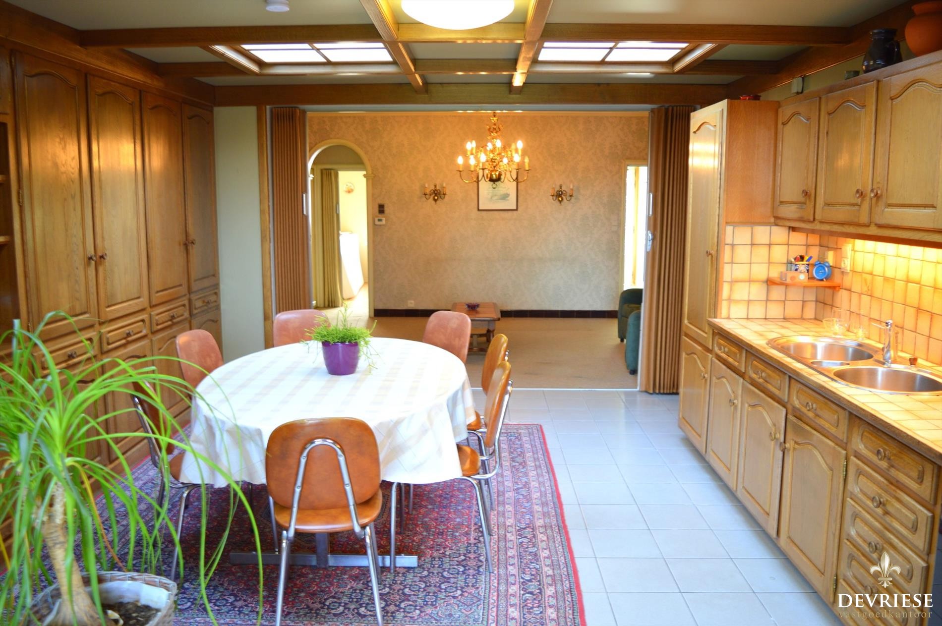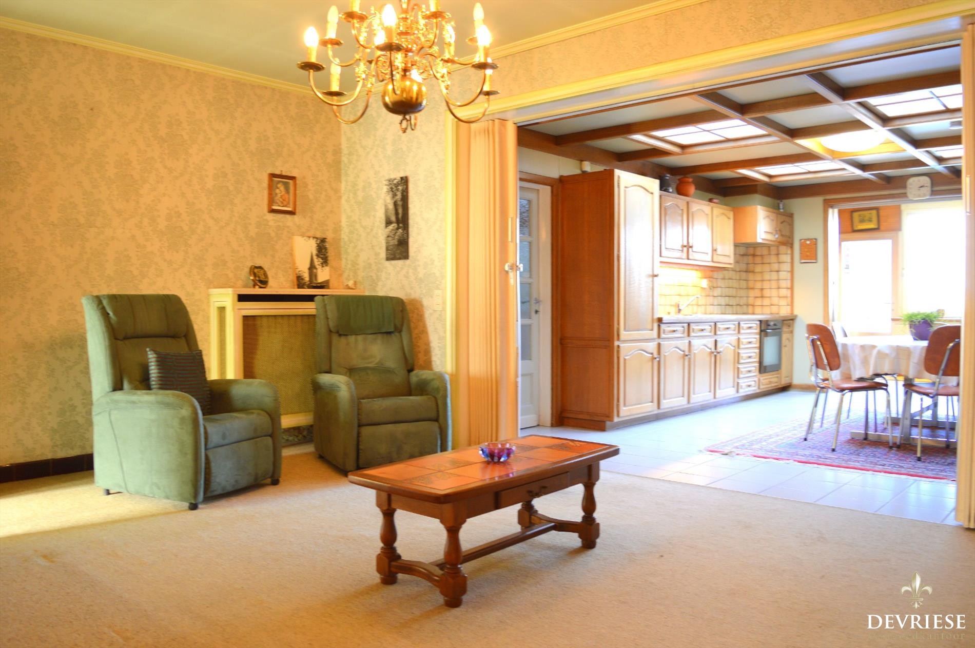 De living en keuken strekken zich uit tot achteraan de woning. Zo genieten deze twee ruimtes een mooi zicht op de tuin, die zich uitstrekt naar de landelijke gronden achteraan het perceel.