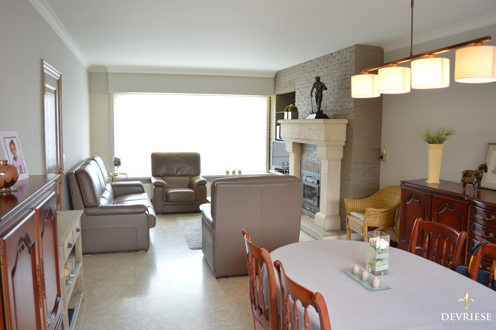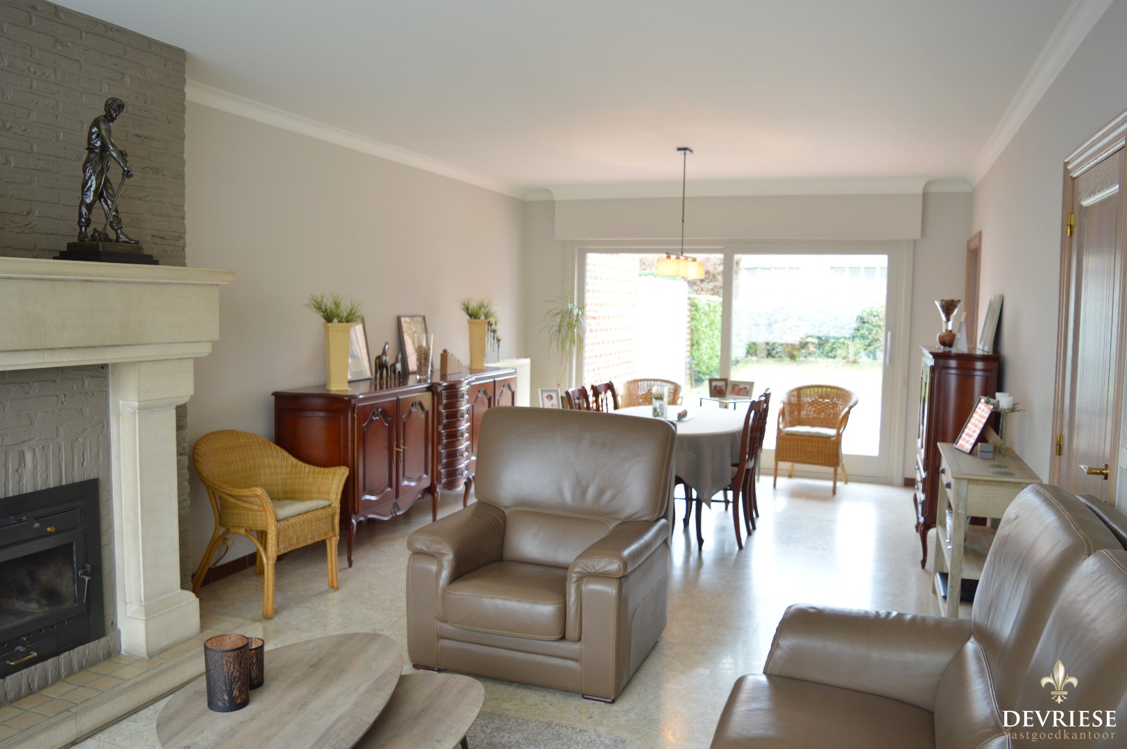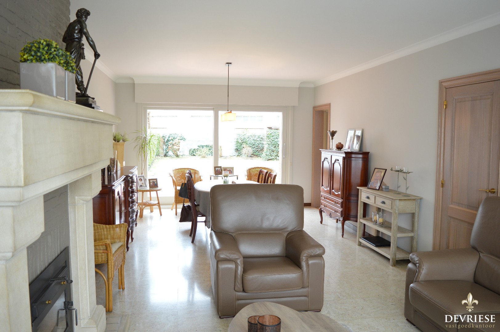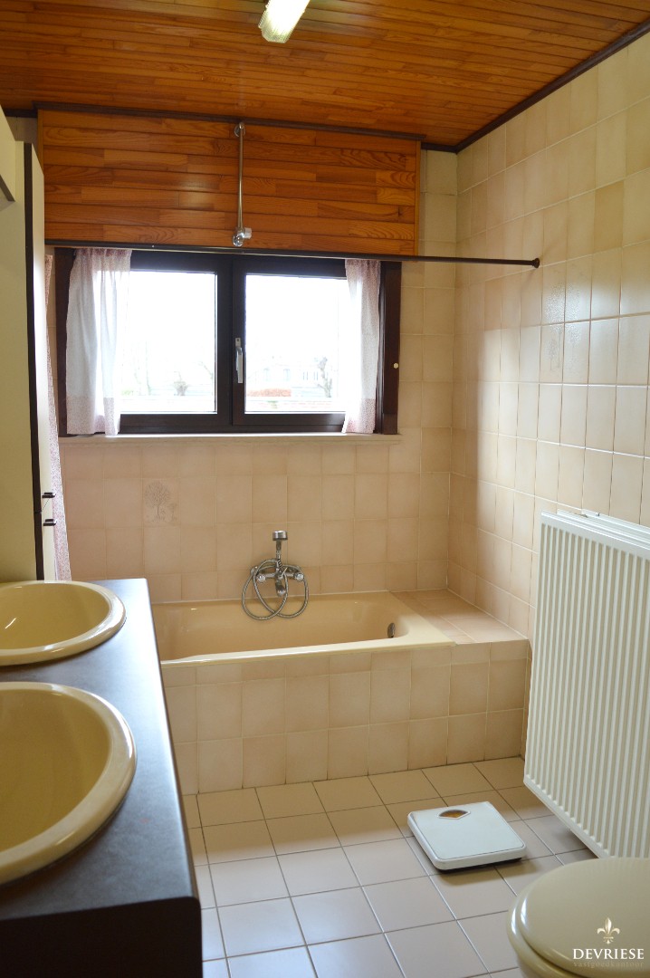 Bij binnenkomst in de inkomhal kan u naar de bovenverdieping, is er een apart toilet of kom je in de leefruimte. De living beschikt over een sierlijke open haard, heeft een enorme lichtinval en geeft bovendien uit op de zonnige tuin. Aansluitend de keuken bestaande uit degelijke materialen en ook een rechtstreekse toegang tot de tuin en de garage die is voorzien van nog een kleine bergruimte.