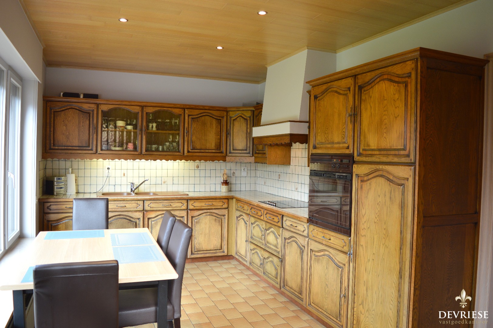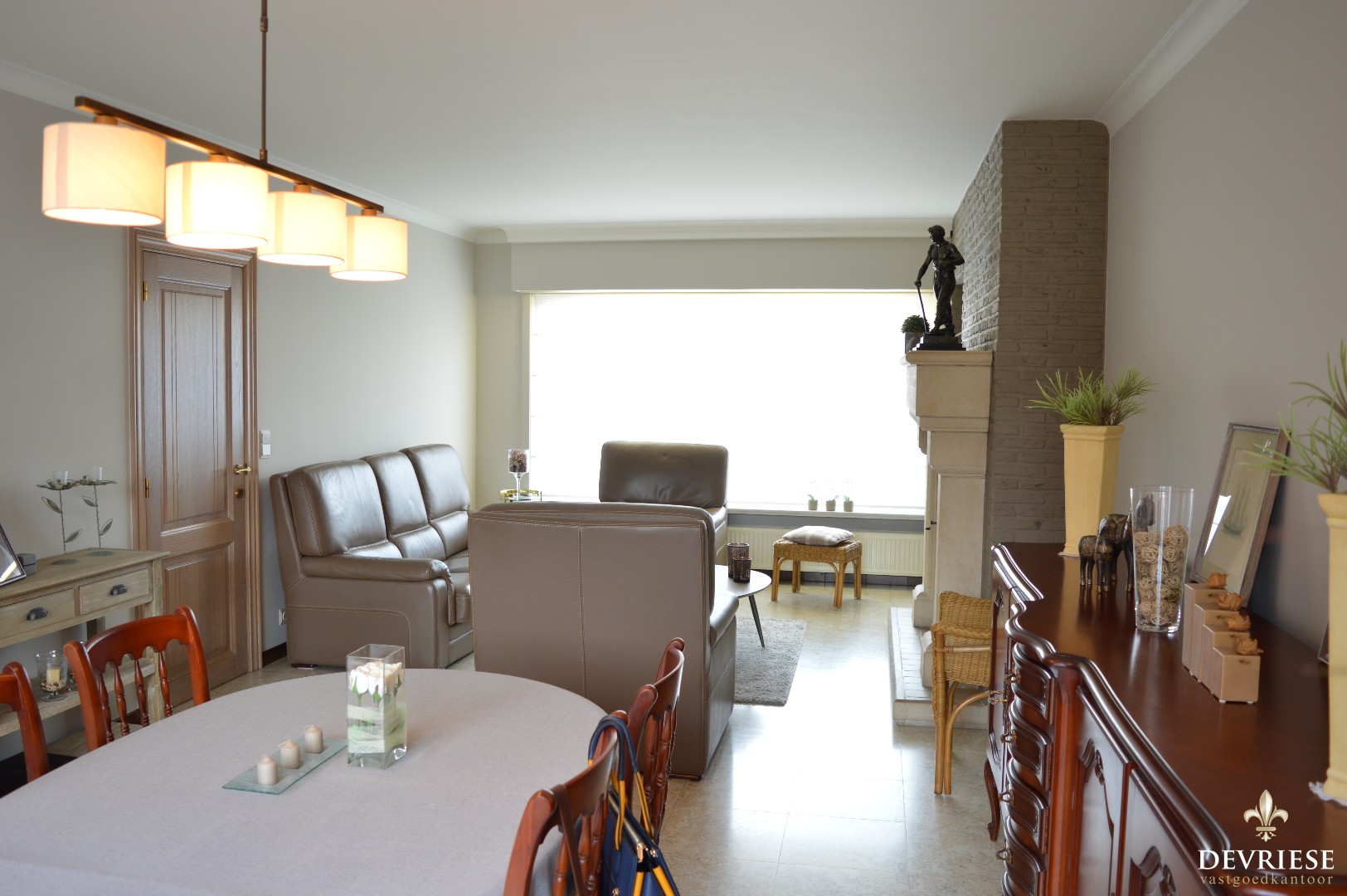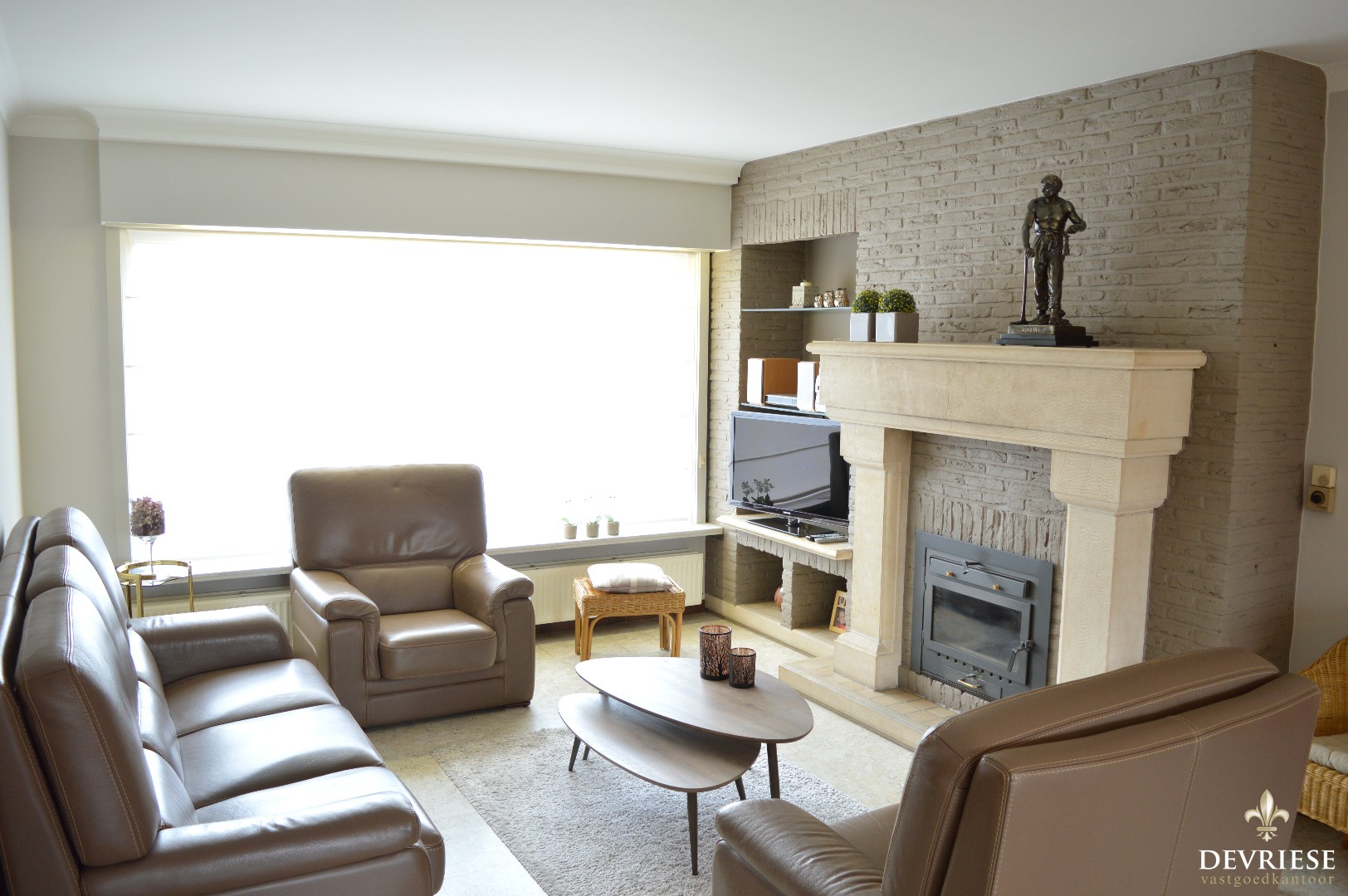 Bij binnenkomst in de inkomhal kan u naar de bovenverdieping, is er een apart toilet of kom je in de leefruimte. De living beschikt over een sierlijke open haard, heeft een enorme lichtinval en geeft bovendien uit op de zonnige tuin. Aansluitend de keuken bestaande uit degelijke materialen en ook een rechtstreekse toegang tot de tuin en de garage die is voorzien van nog een kleine bergruimte.