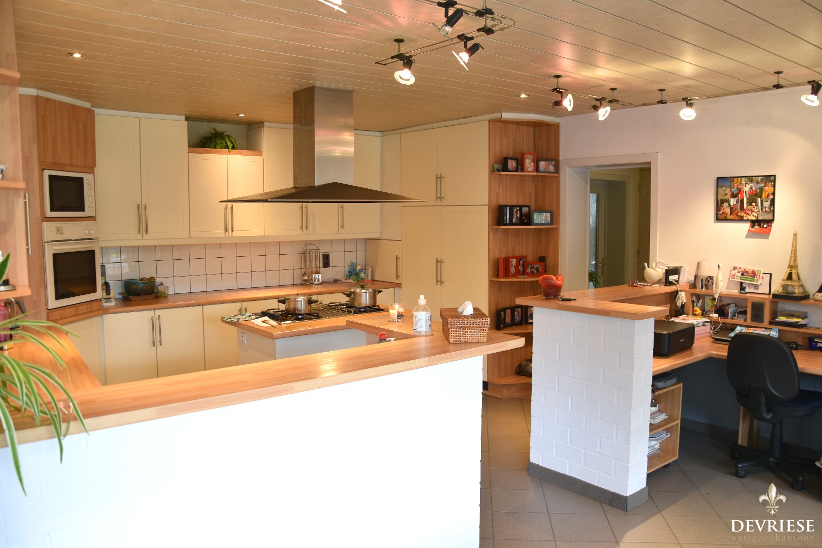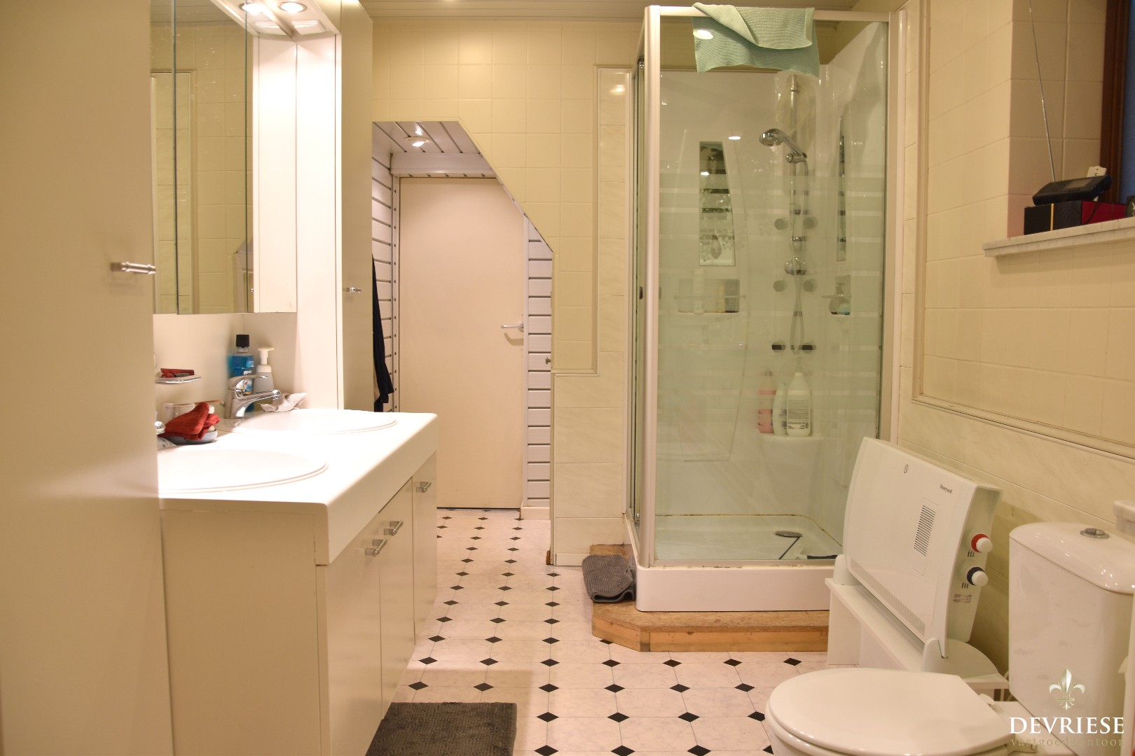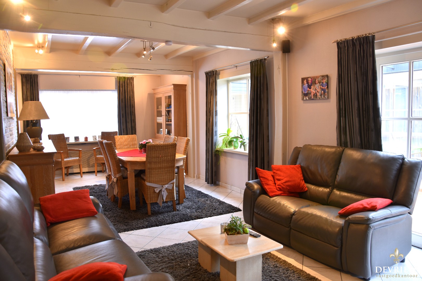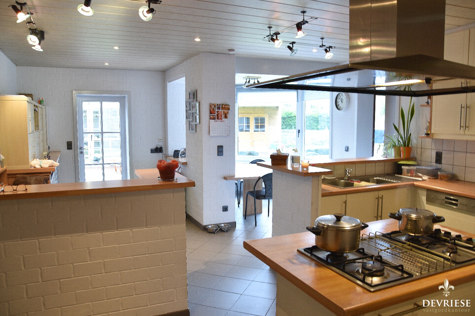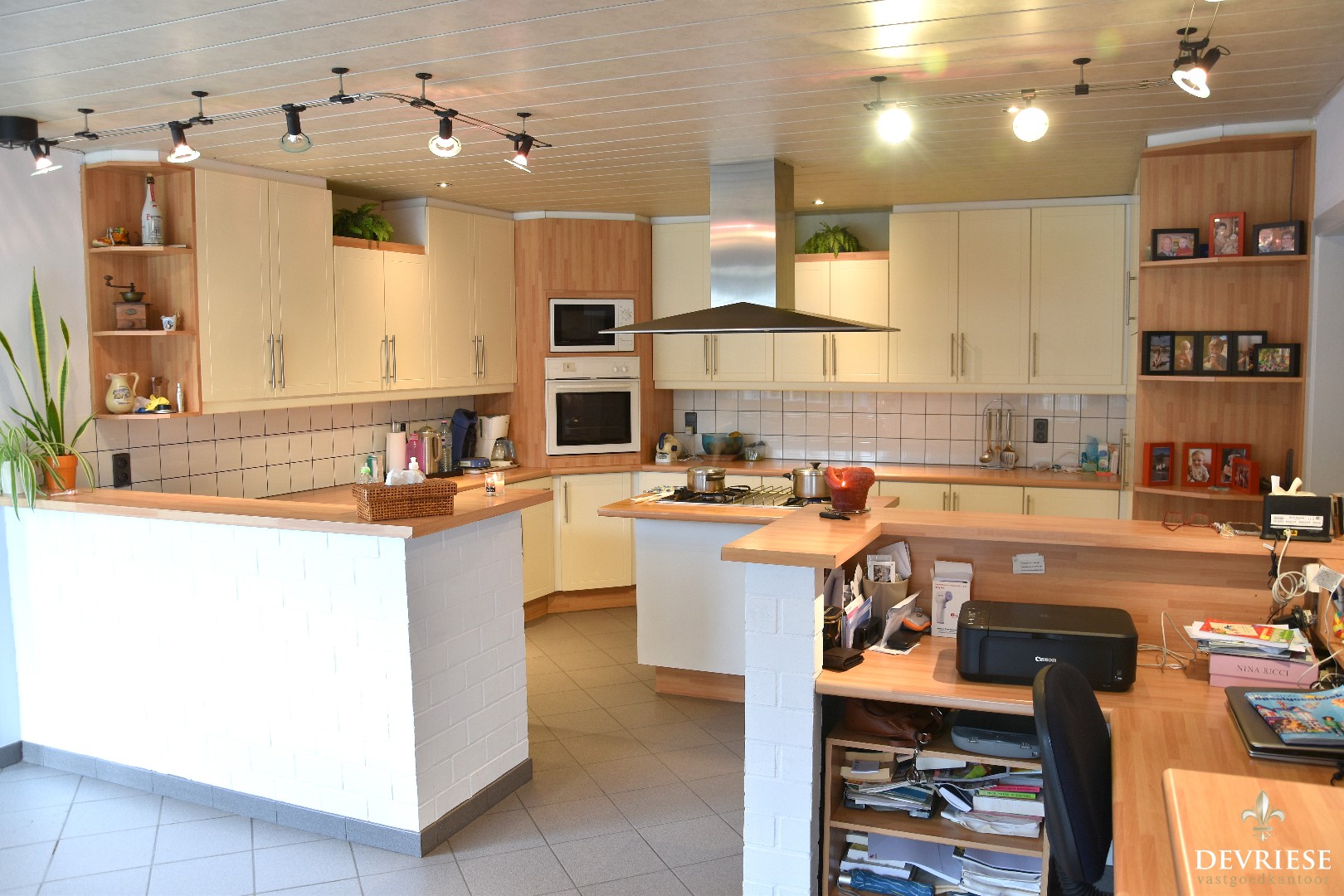 De woning ligt op 860 m² grond. U komt binnen in de aparte inkomhal, voorzien van gastentoilet. Daarnaast is er toegang tot de leefruimte vooraan. Daar achter ligt de ruime leefkeuken, waar u volop geniet van vol zicht op de tuin. Ook op het gelijkvloers liggen extra bergruimtes, een bijkeuken, een ruime veranda en de badkamer, voorzien van bad, douche, een tweede toilet en dubbele lavabo. Op de verdieping werden 3 slaapkamers ingericht.