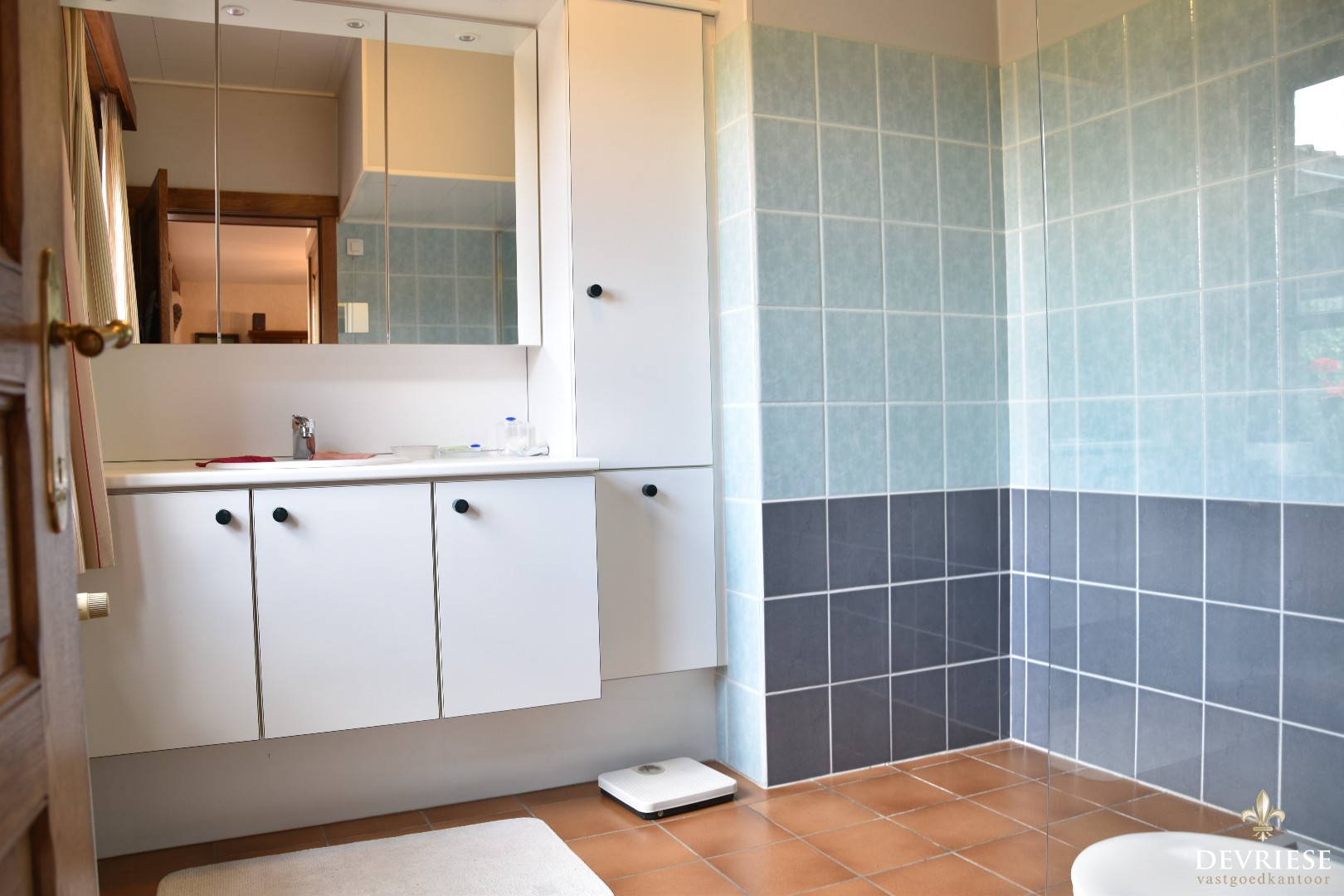 Onderhoudsvriendelijke badkamer met lavabomeubel, ruime inloopdouche en toilet.