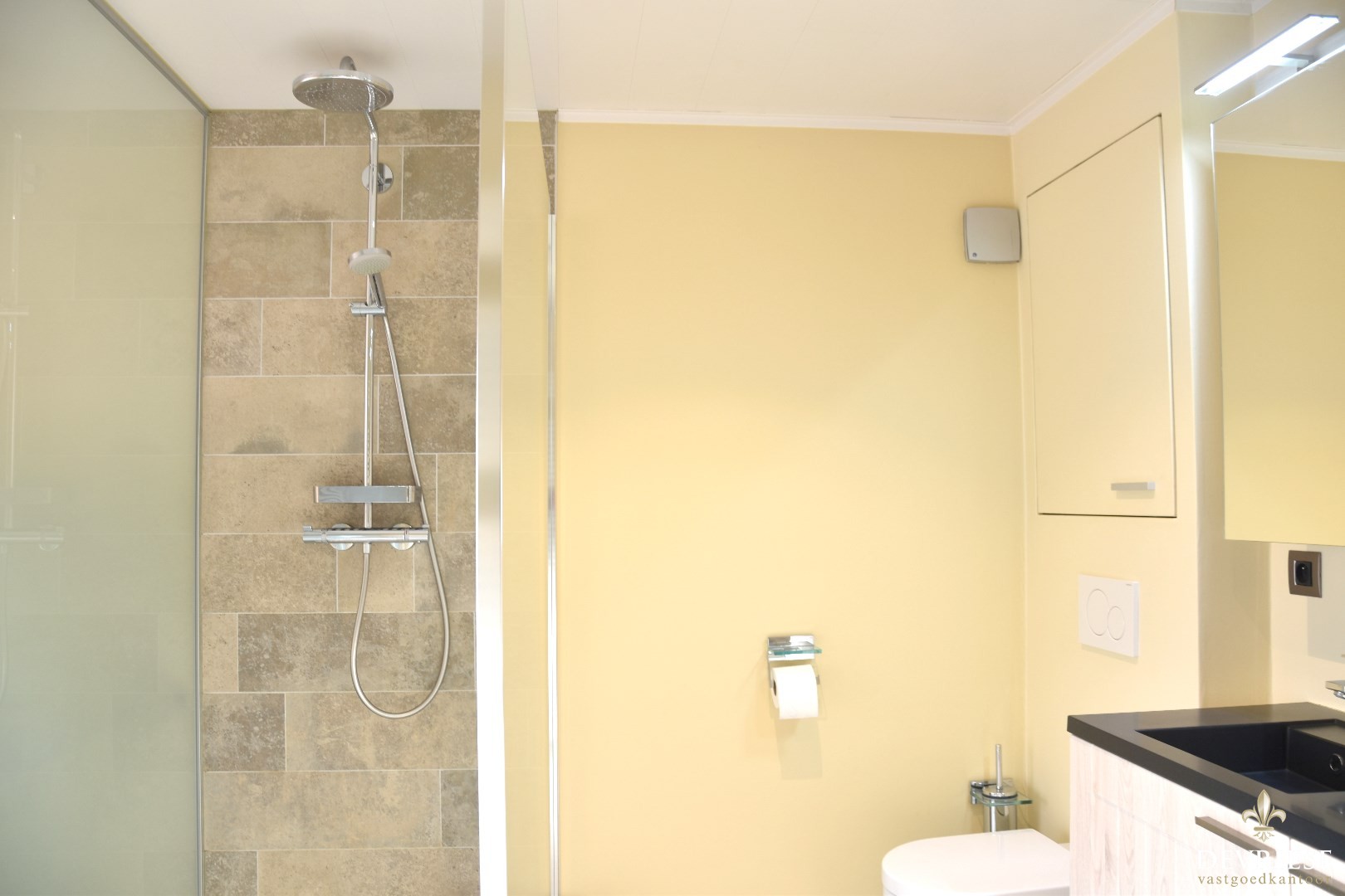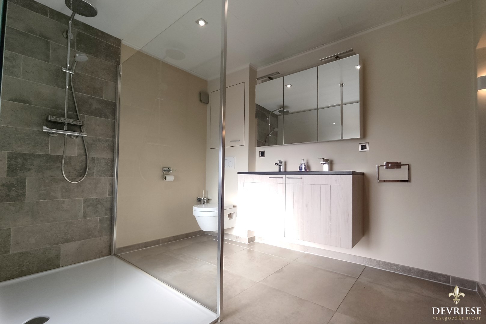 Recent vernieuwde badkamer bestaande uit inloopdouche, dubbel lavabomeubel en toilet.