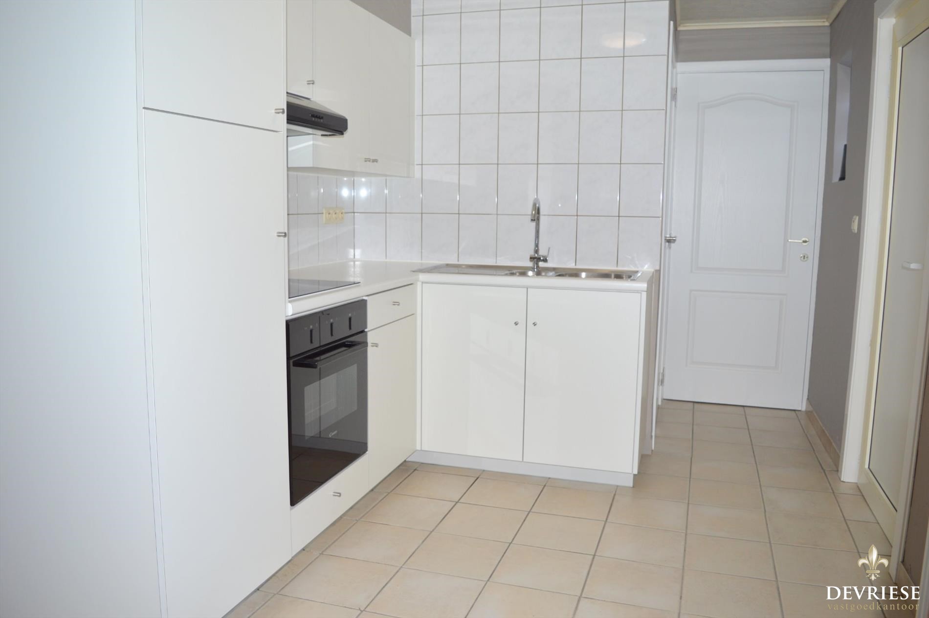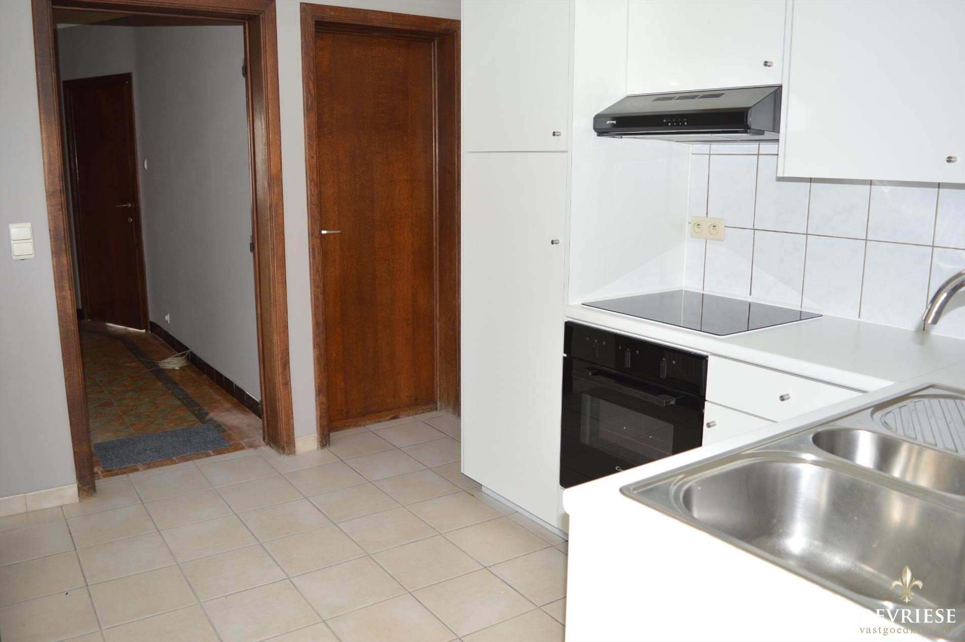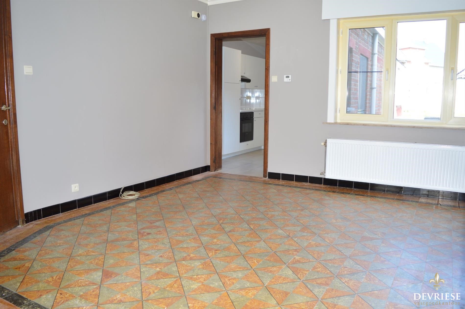 Inkomhal met rechtstreekse doorgang tot de gezellige leefruimte. Aanpalend vinden we een geïnstalleerde keuken.
