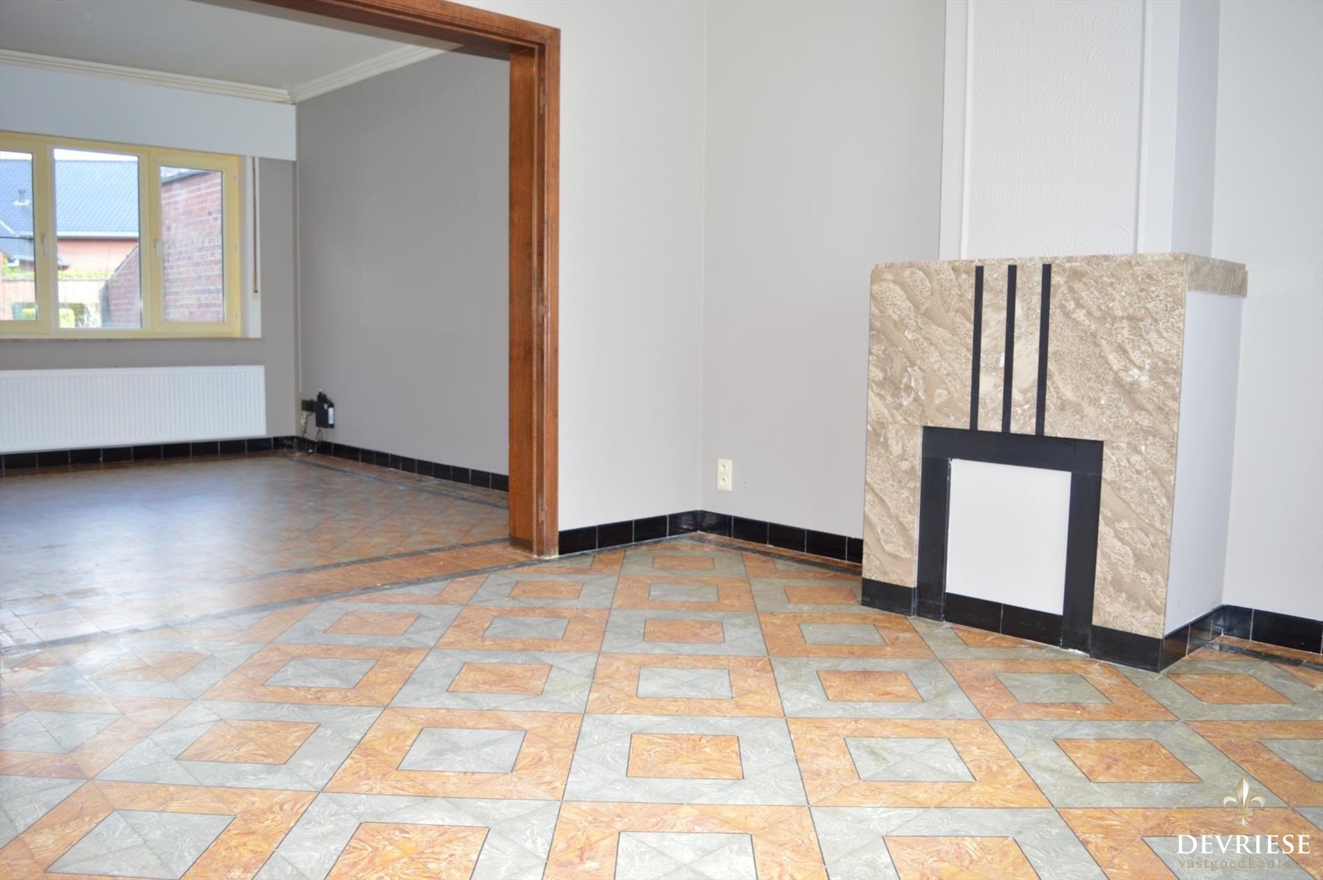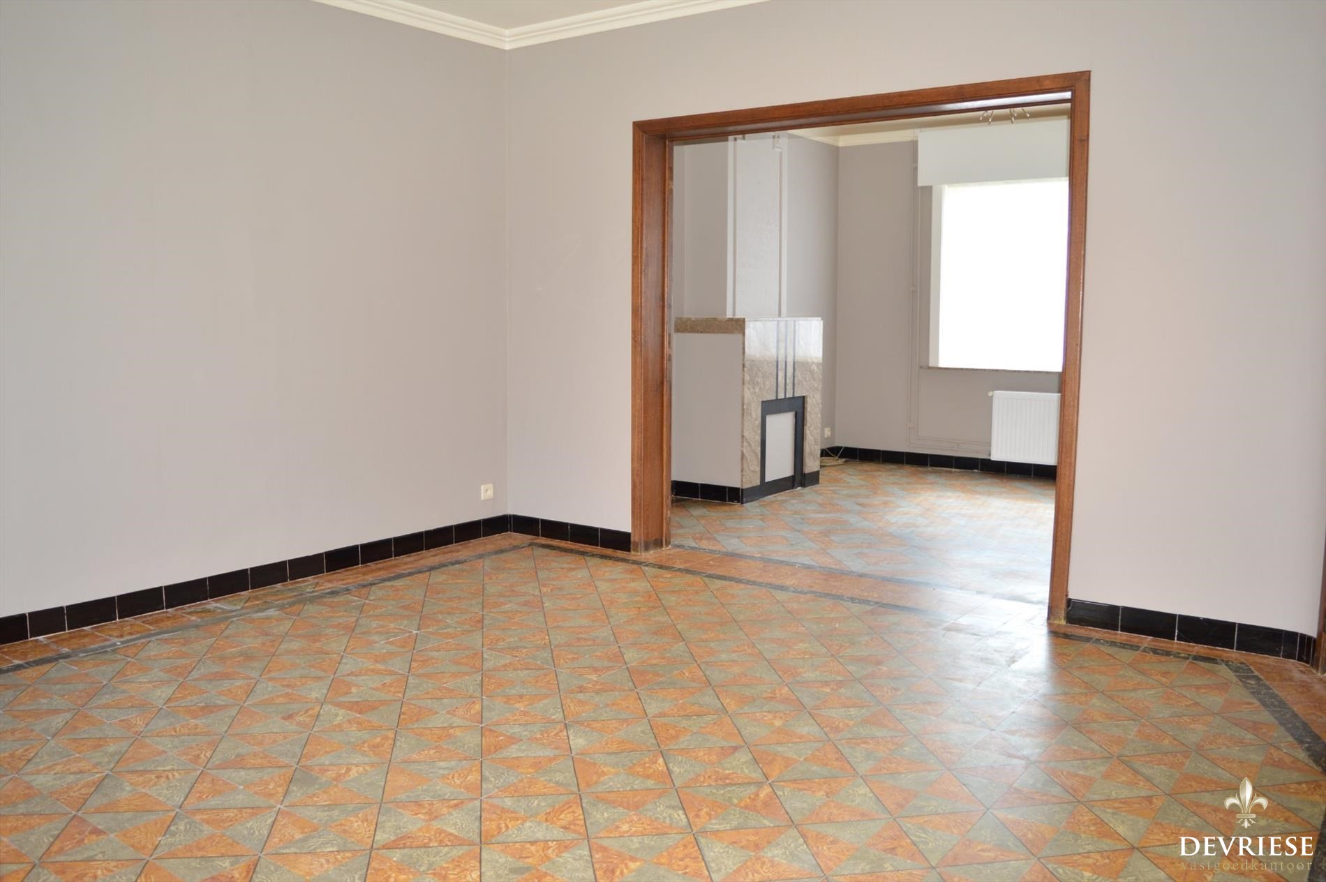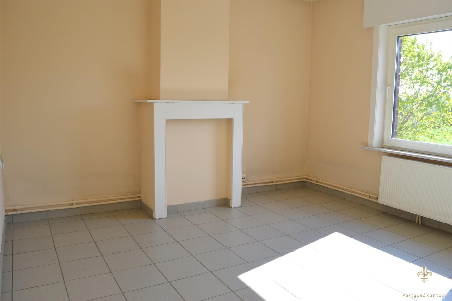 Inkomhal met rechtstreekse doorgang tot de gezellige leefruimte. Aanpalend vinden we een geïnstalleerde keuken.