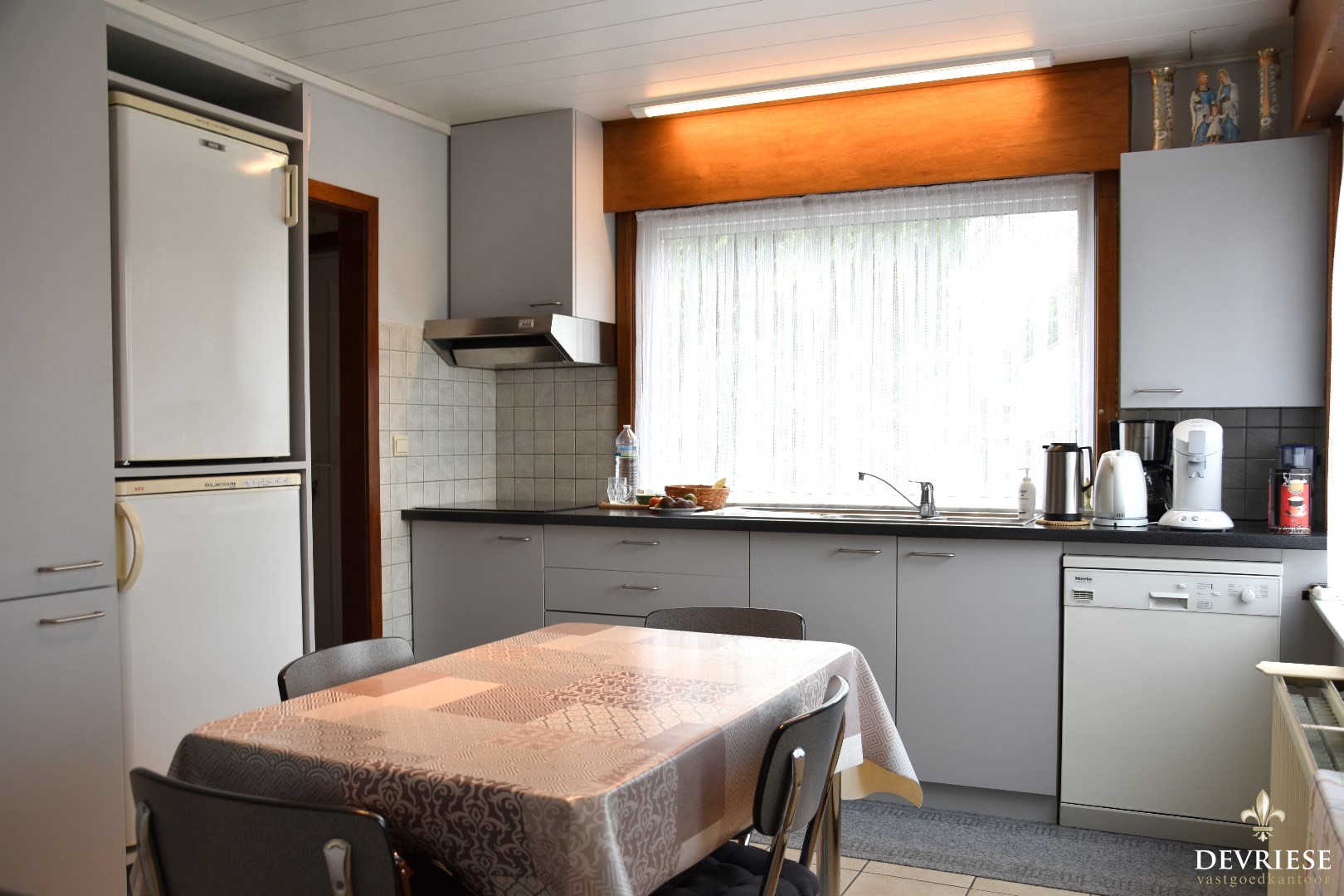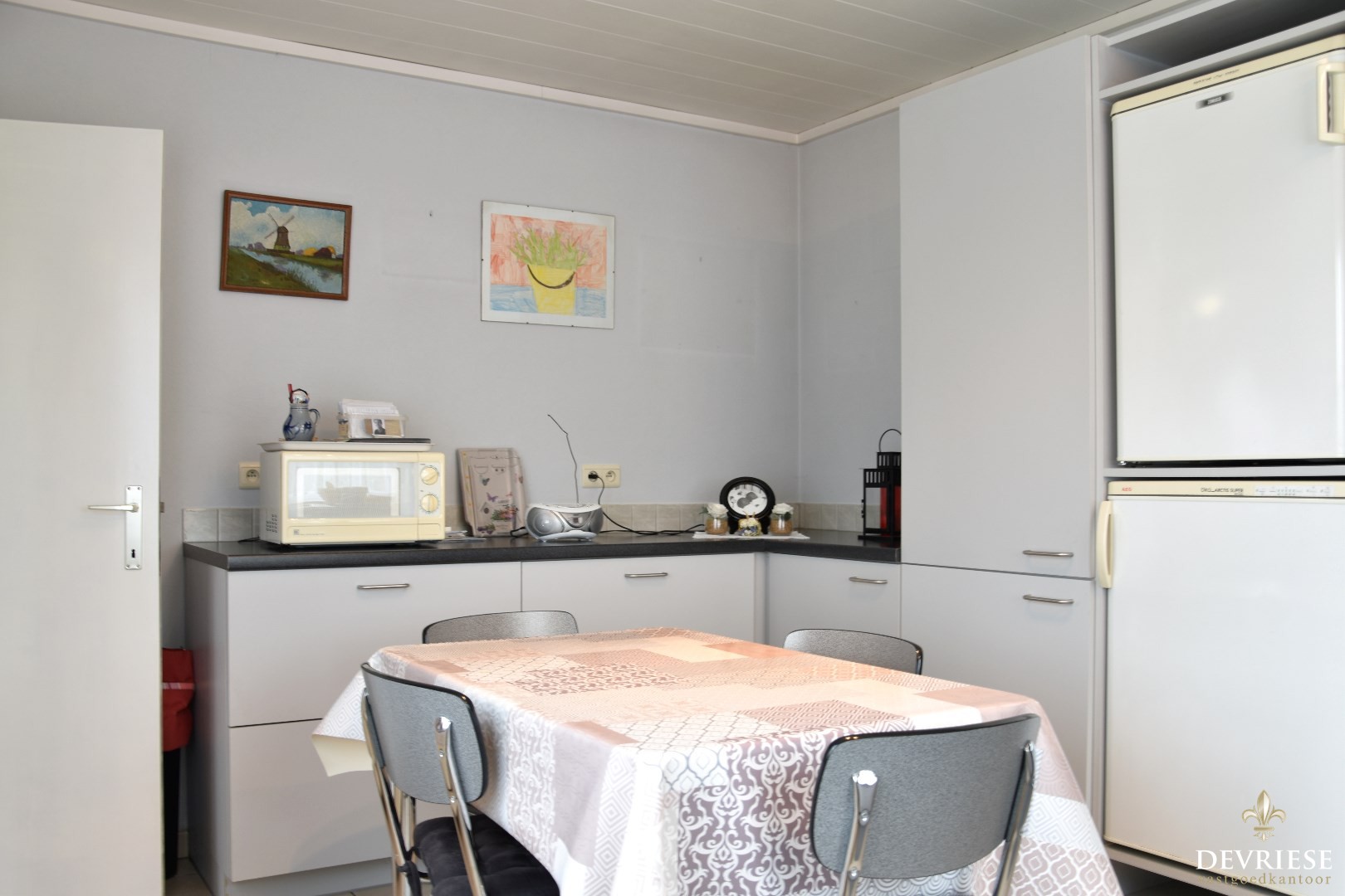 Aanpalend maken we kennis met een geïnstalleerde keuken. Naast de vele opbergmogelijkheden is er ook een ingerichte ontbijthoek voorzien.