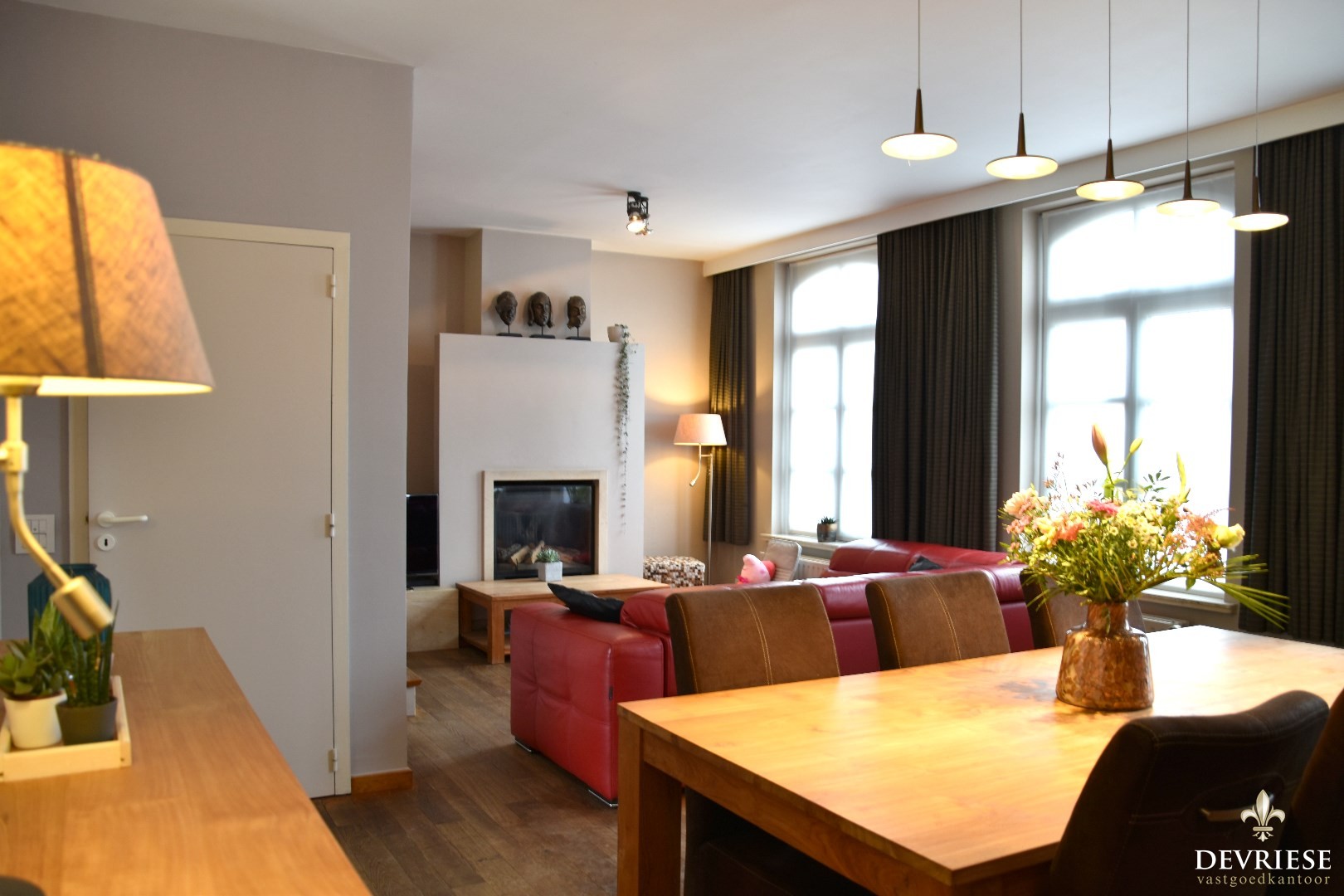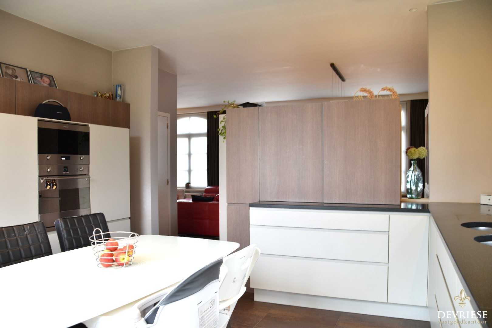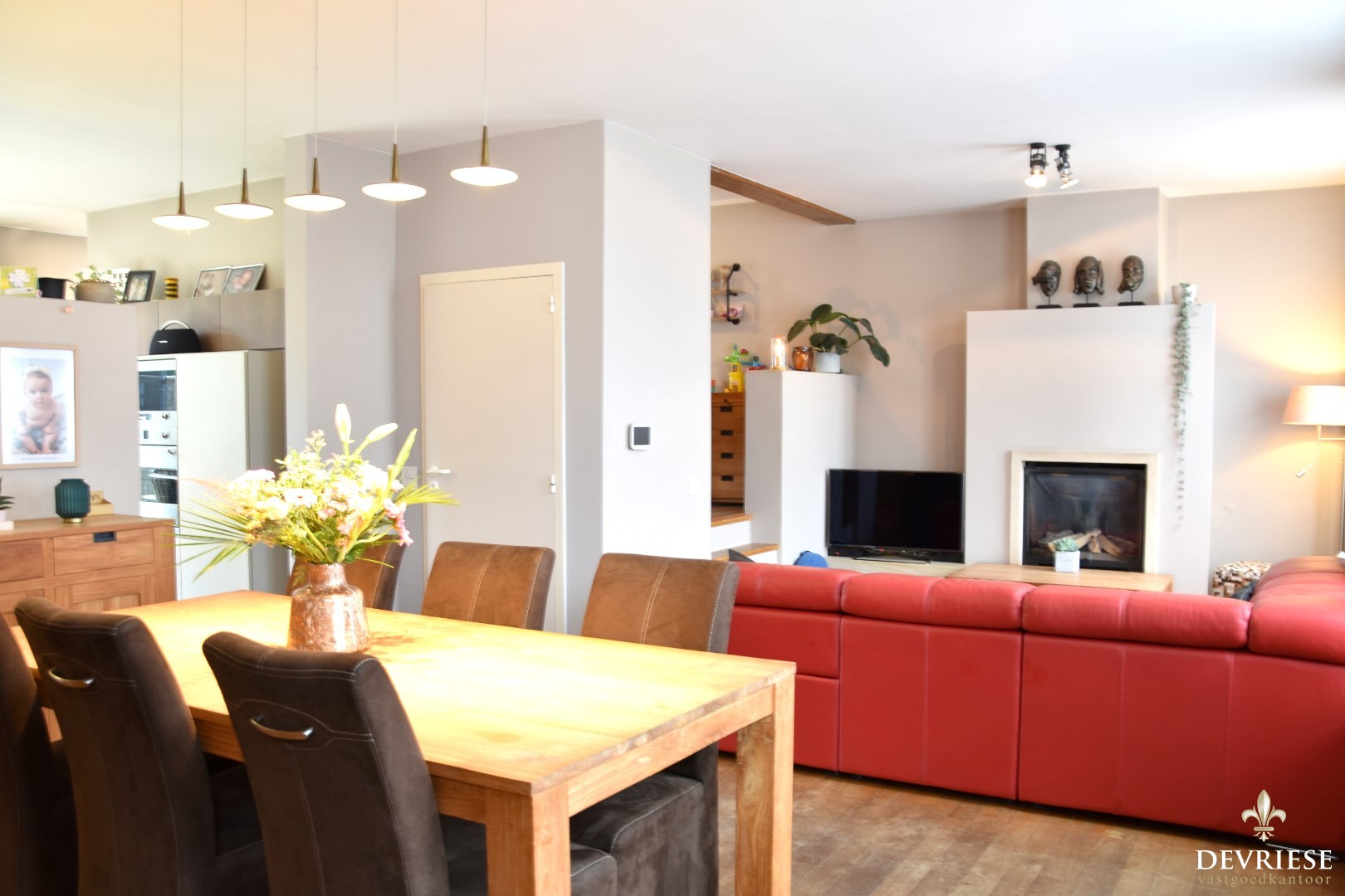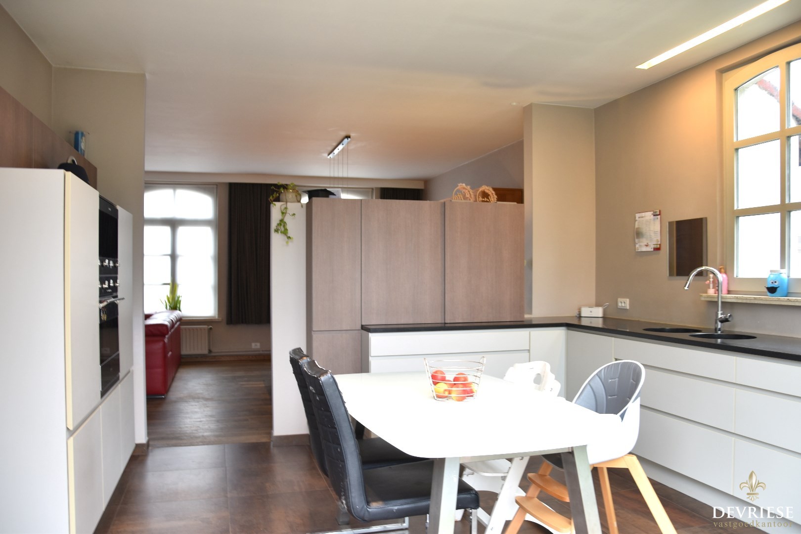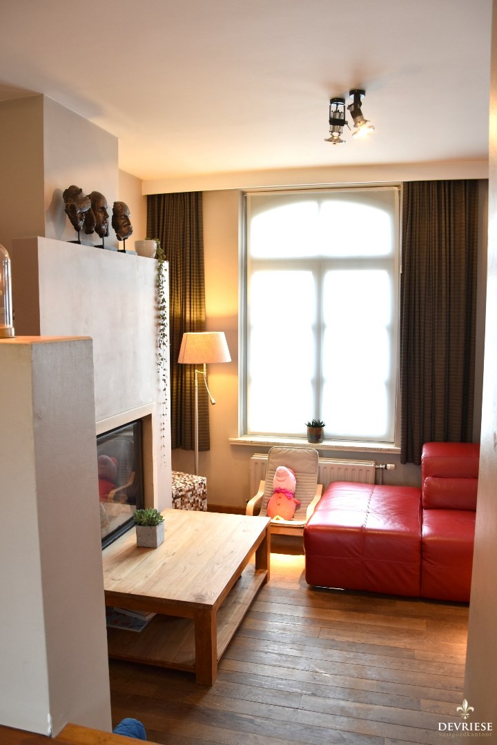 Gezellig leefgedeelte, bestaande uit salon met gashaard en een ruime eetplaats. Aanpalend treffen we een volledig geïnstalleerde keuken mét ontbijthoek.