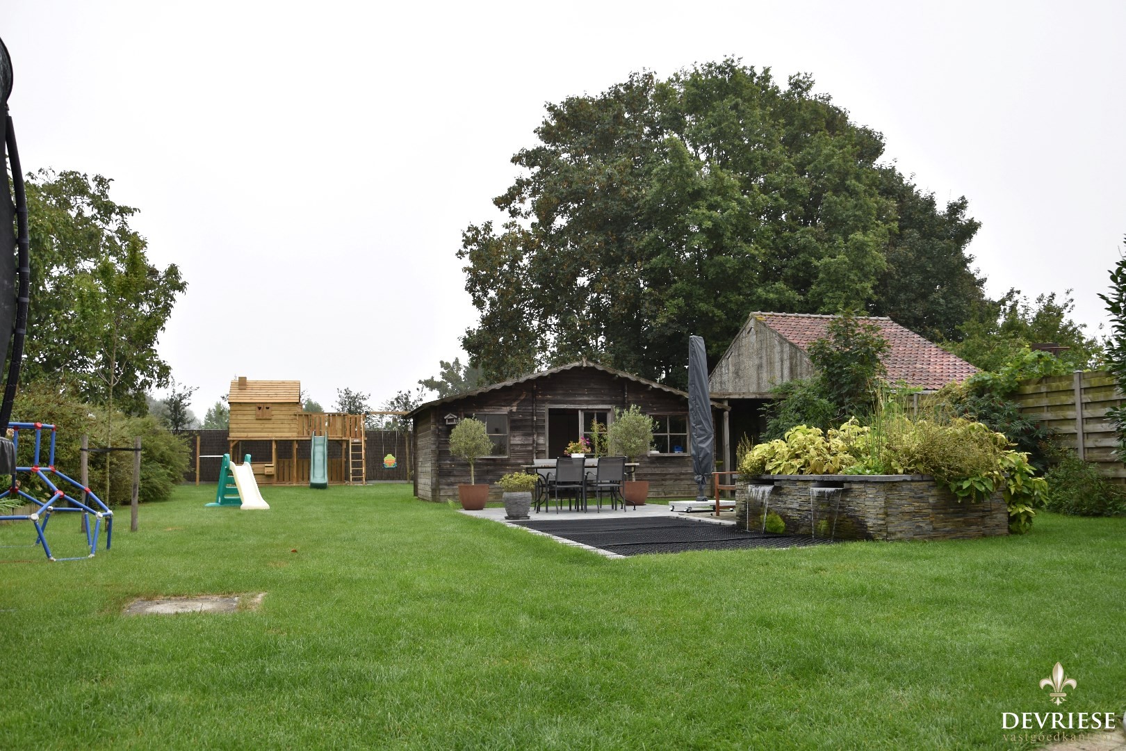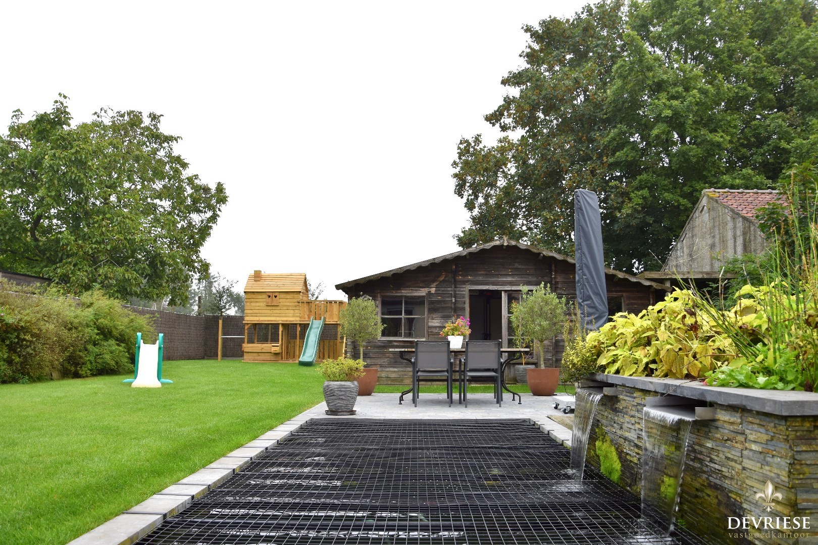 Terras, tuinhuis met elektriciteit en een knap aangelegde ... vijver.