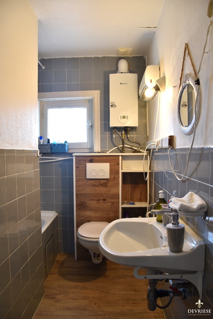 Badkamer met zitbad/douche, lavabo en een tweede toilet.