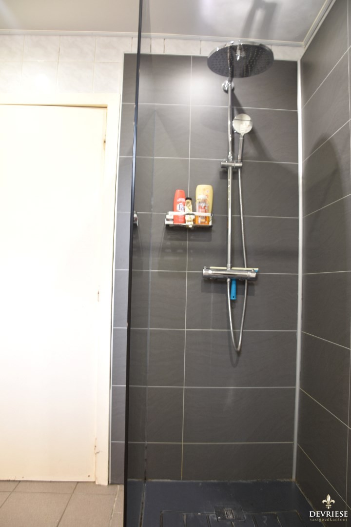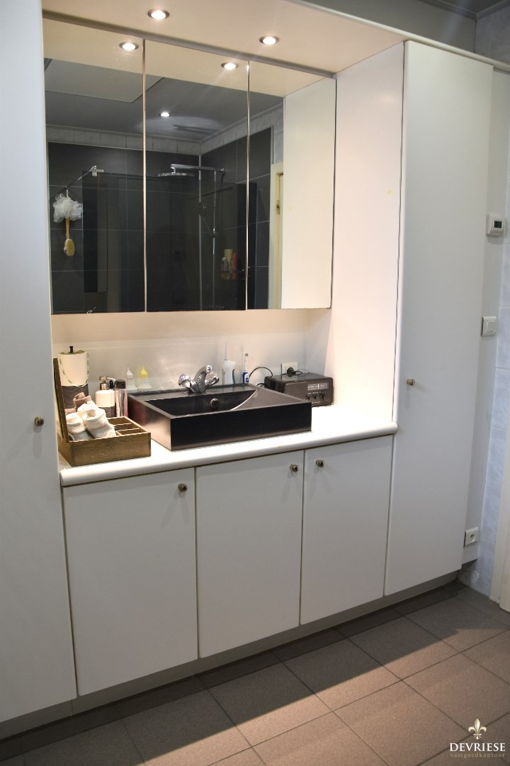 Onderhoudsvriendelijke badkamer met inloopdouche en lavabomeubel.