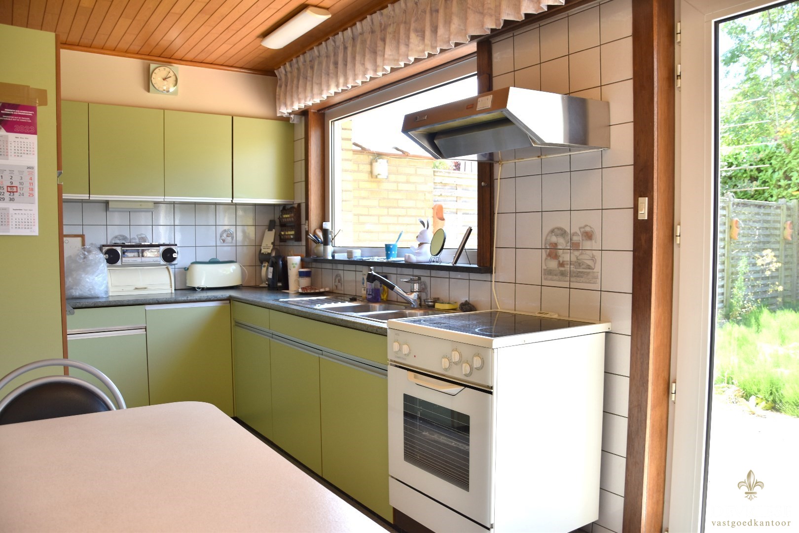 Aanpalend vinden we een uitgeruste keuken met ontbijthoek. Vol zicht op de zonovergoten tuin.