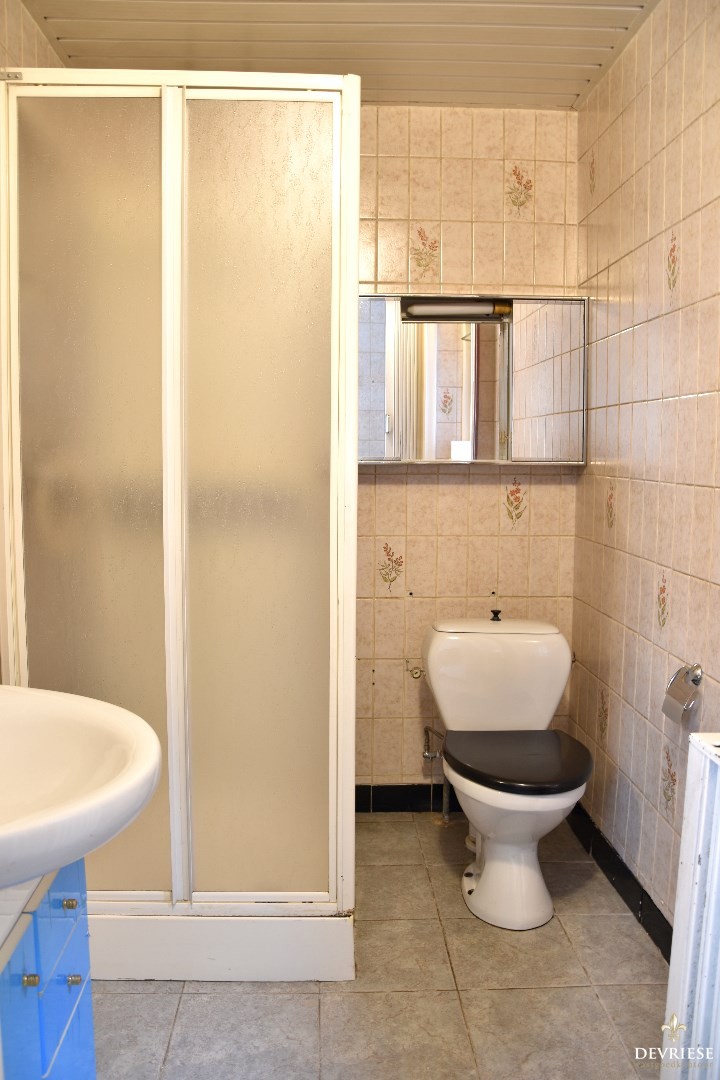 Gelijkvloerse badkamer met lavabo, douchecel en toilet.