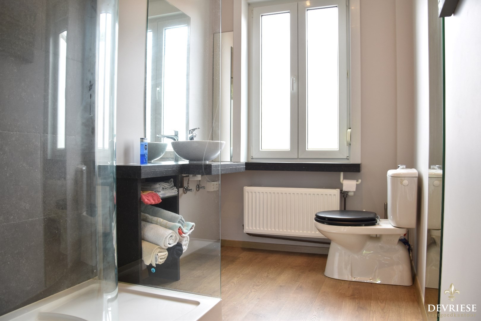 Op de eerste verdieping treffen we 2 volwaardige slaapkamers, samen met een stijlvolle badkamer die voorzien is van een douche, lavabo en toilet.