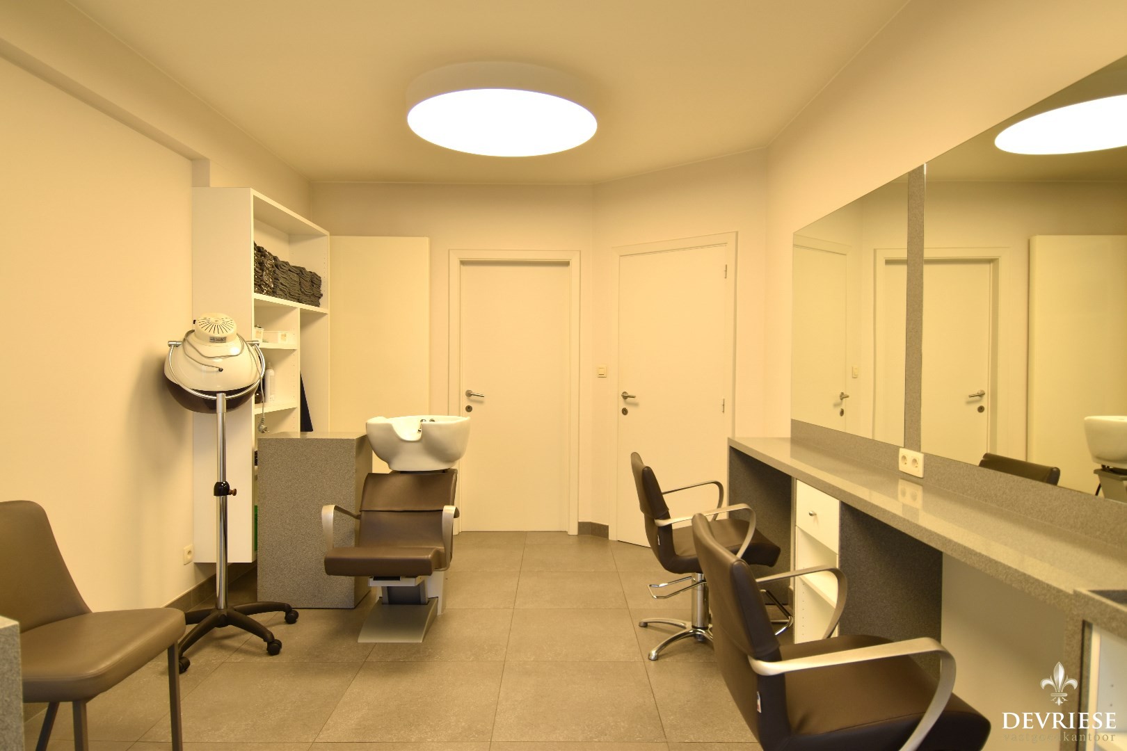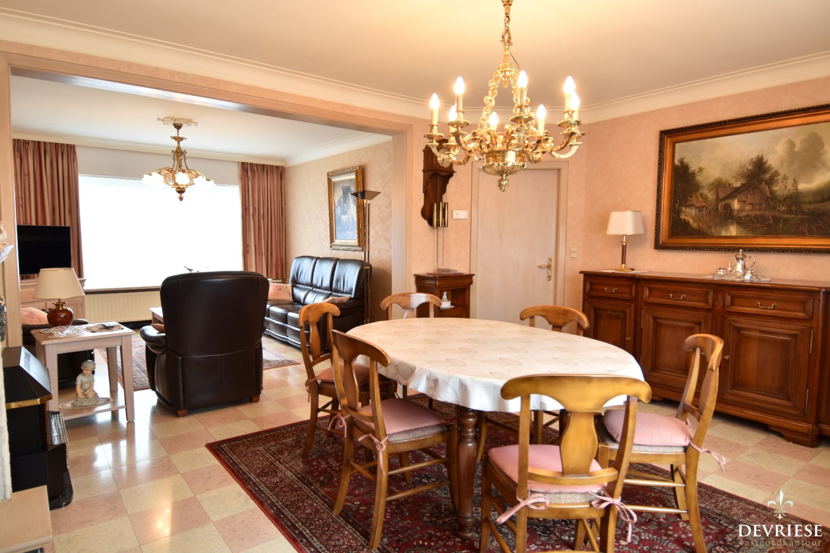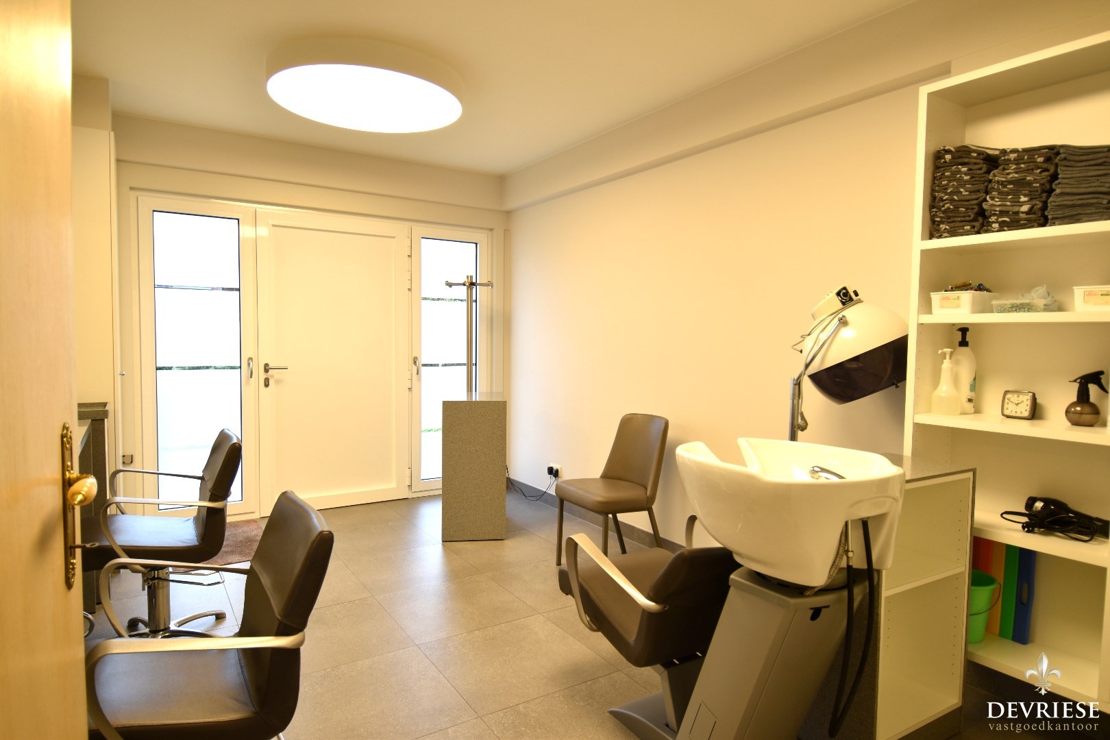 Op het gelijkvloers komt u binnen in een polyvalente ruimte (voorheen garage) die rechtstreeks toegang geeft tot een uitnodigende, lichtrijke doorzonleefruimte. Hier kunt u heerlijk ontspannen in het salon of dineren aan tafel.