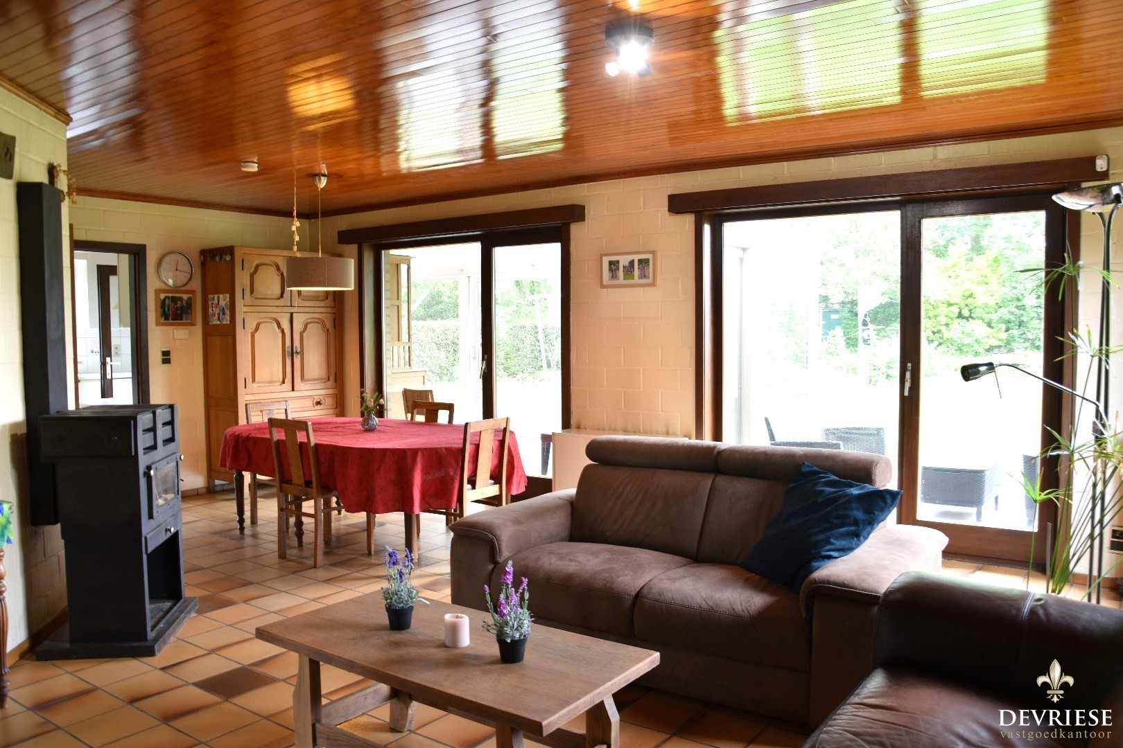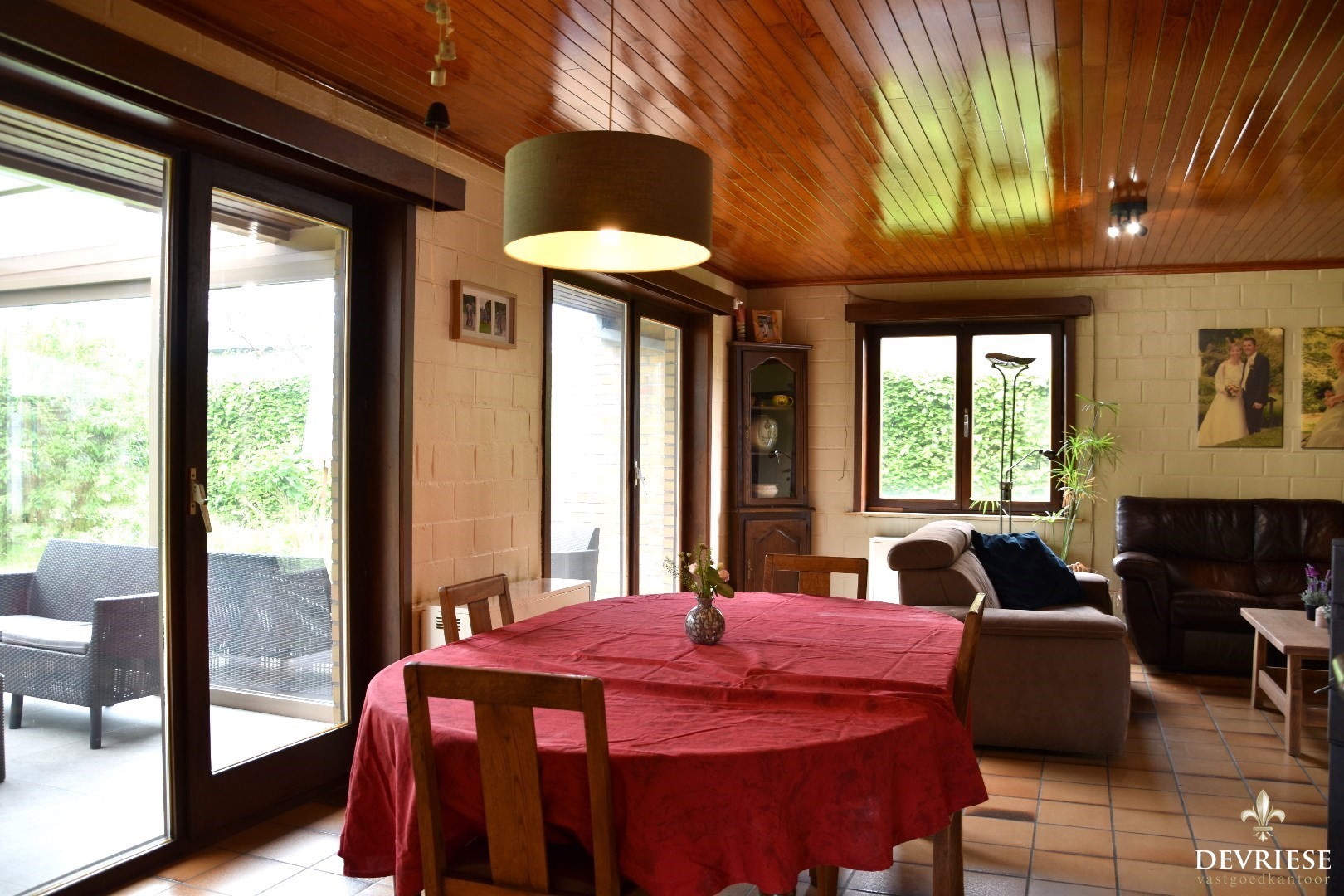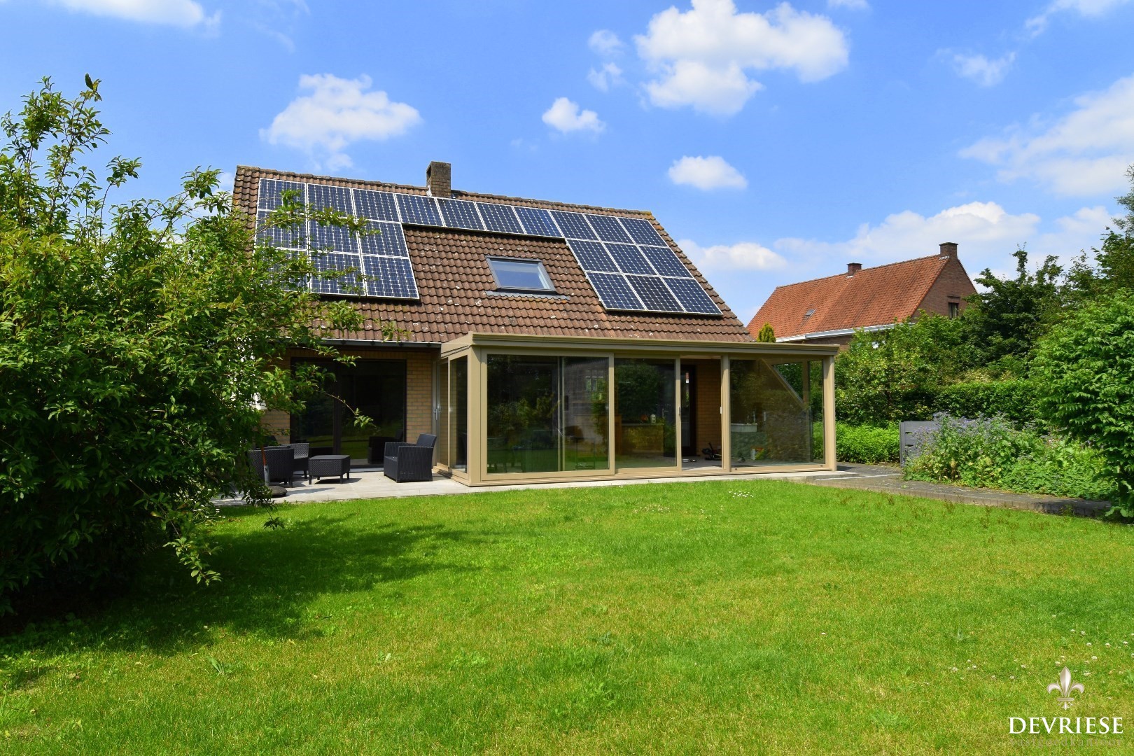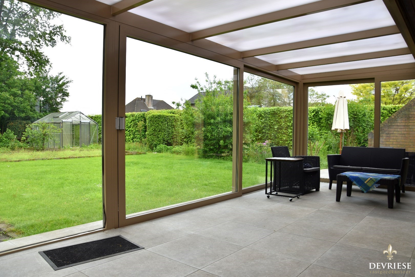 Een ruime veranda strekt zich uit met een panoramisch uitzicht op de zuidgerichte tuin, waar u kunt genieten van ontspanning in alle stilte.