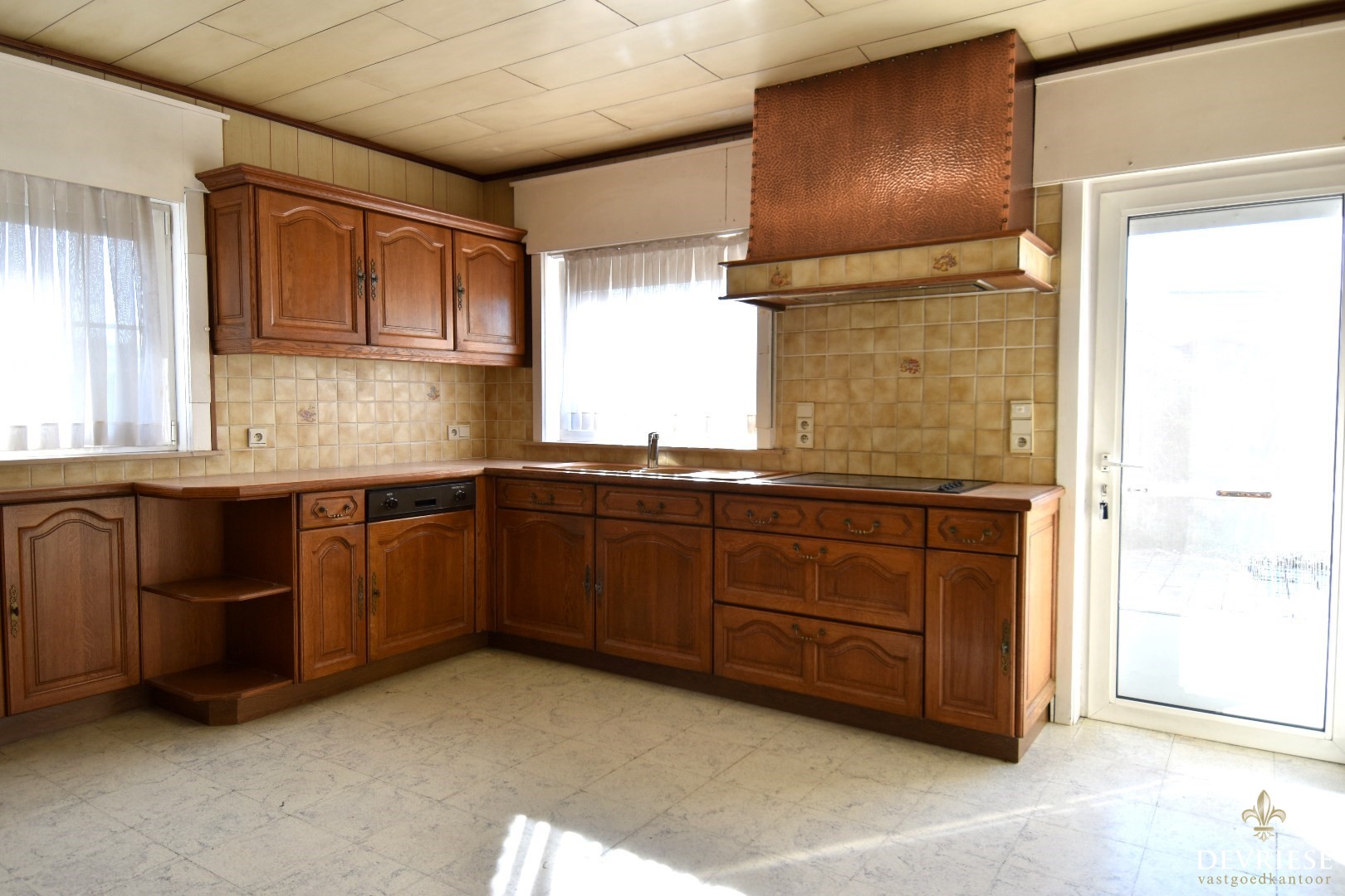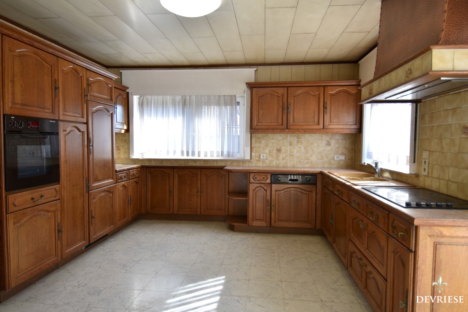 De hal geeft directe toegang tot de volledig uitgeruste keuken, waar u geniet van veel opbergmogelijkheden en een gezellige ontbijthoek (vanuit de keuken is er toegang tot de ruime kelder).