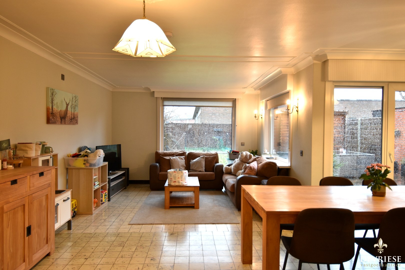 Van hieruit ga je verder naar de ruime en lichtrijke leefruimte, waar grote raampartijen zorgen voor een aangename lichtinval en een mooi zicht op de achtertuin.