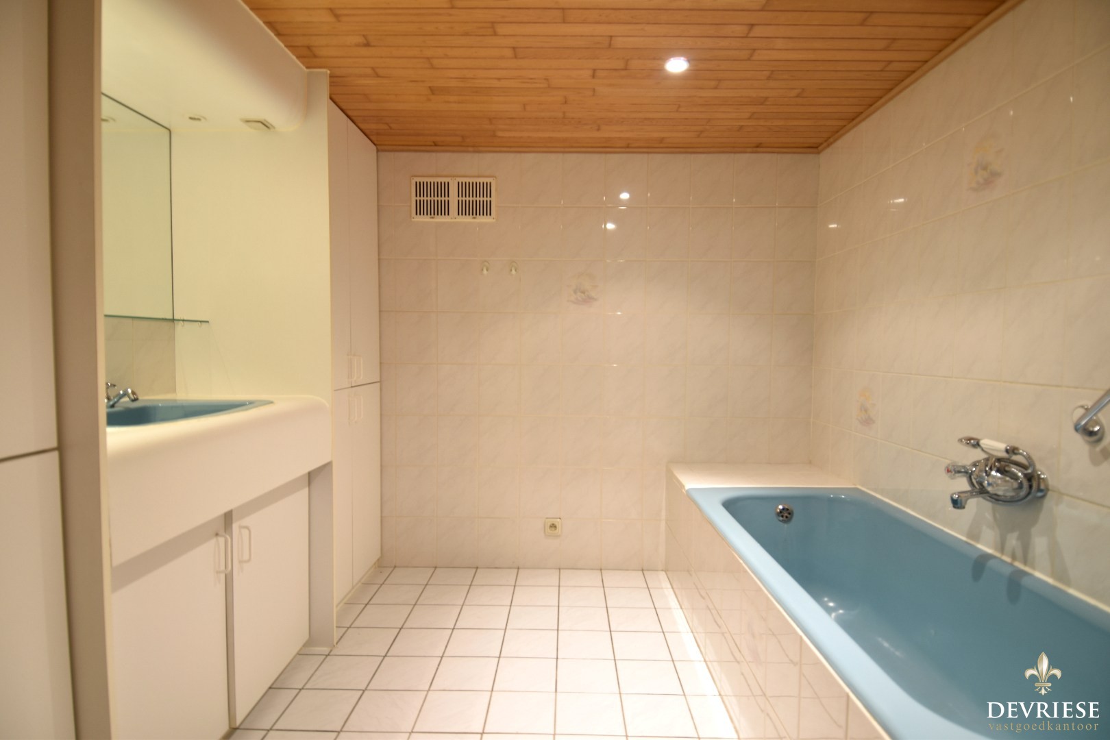 Op het tussenverdiep bevindt zich een badkamer met ligbad en lavabomeubel.