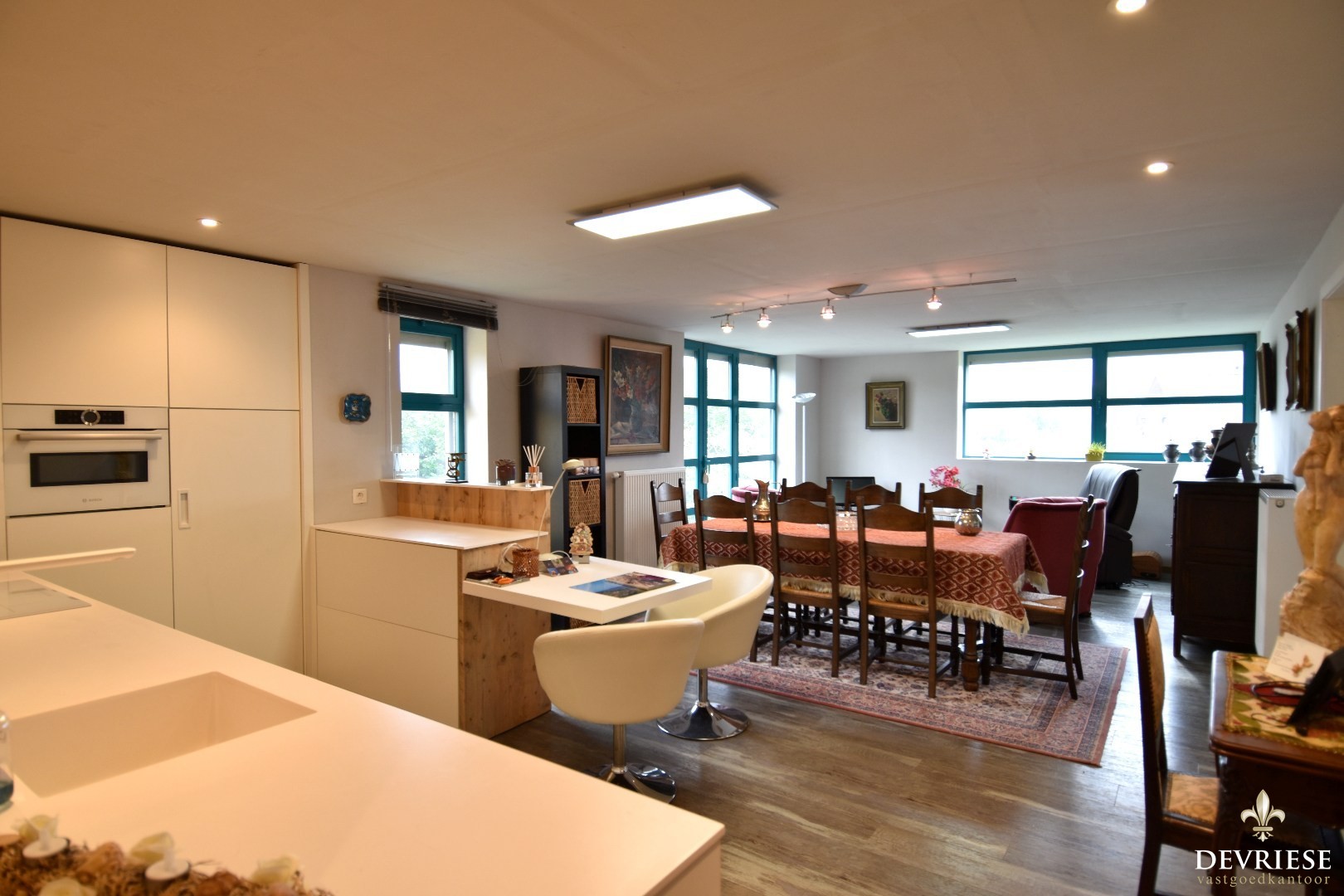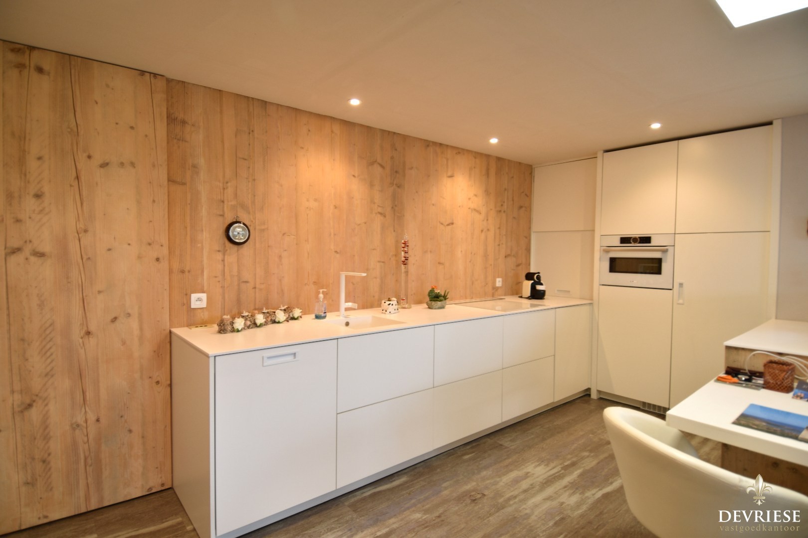 Vervolgens bereikt u de lichtrijke leefruimte, voorzien van een sfeervolle houtoven, die zich harmonieus verbindt met het aangrenzende ruime keukengedeelte.