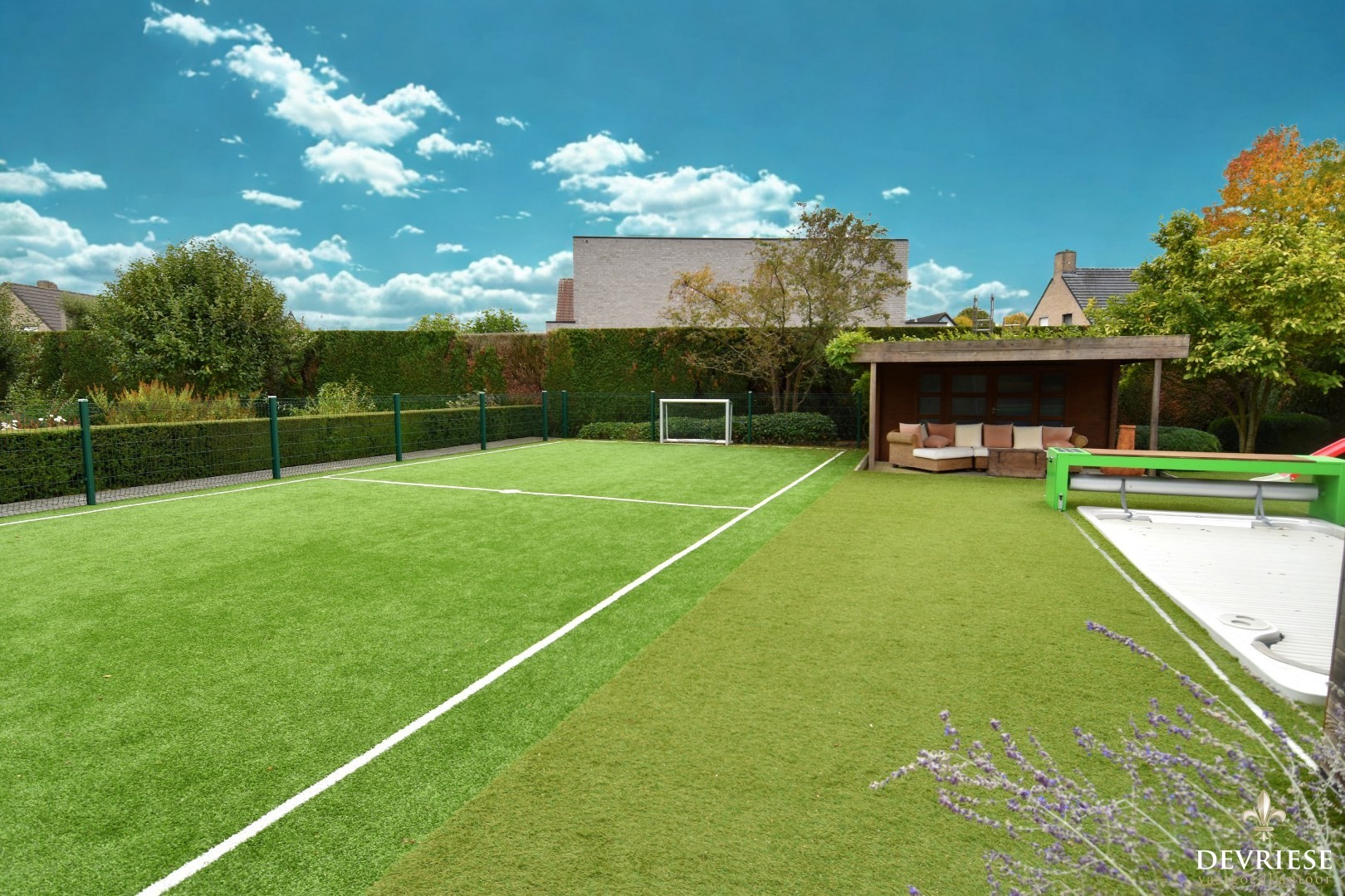 De tuin is een absoluut pronkstuk! Met veel zorg en smaak aangelegd, voorzien van volwassen beplanting, strakke gazonpartijen en harmonieuze terrassen, ... Zwembad & aangelegd voetbalveld met kunstgras mochten hier uiteraard niet ontbreken.