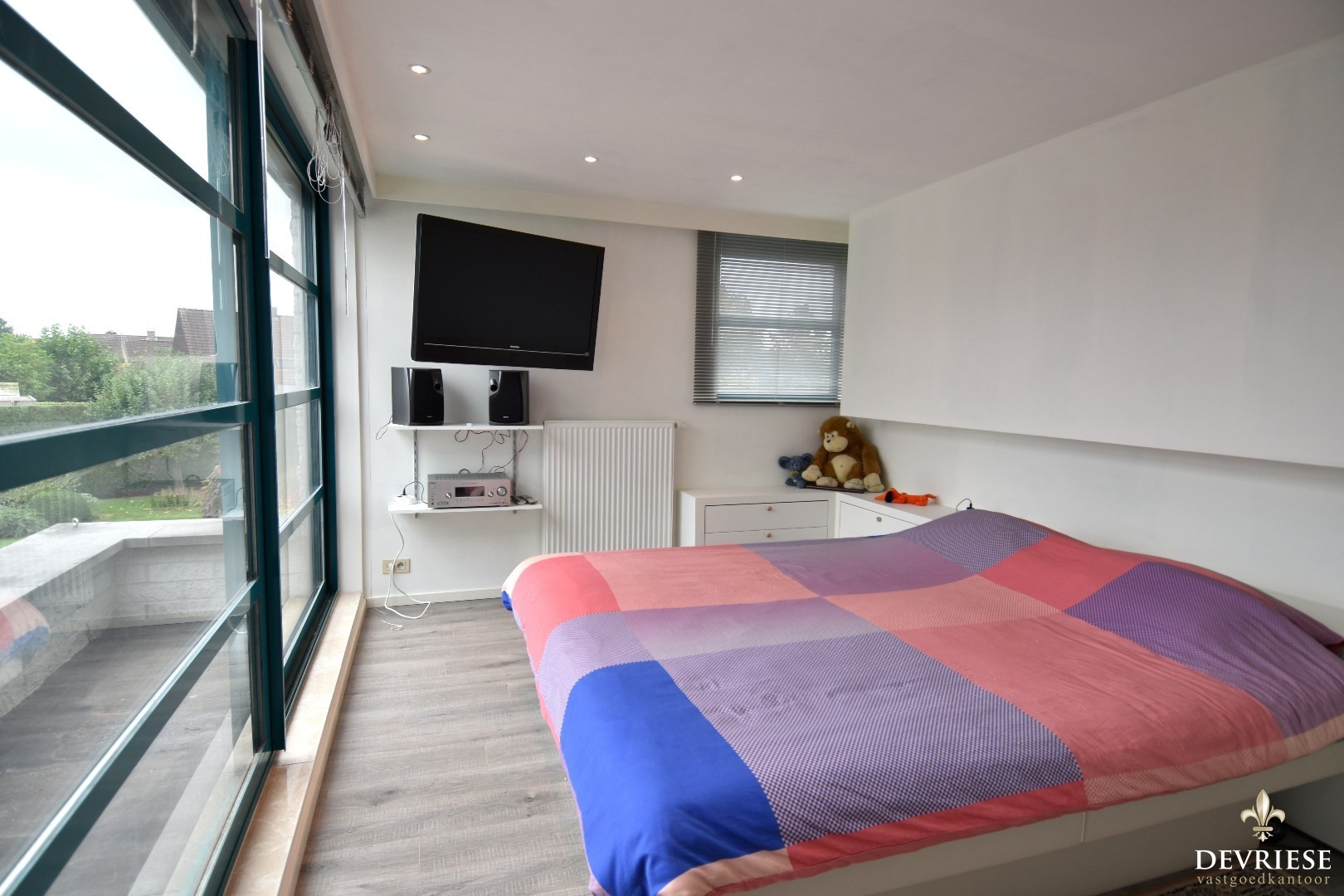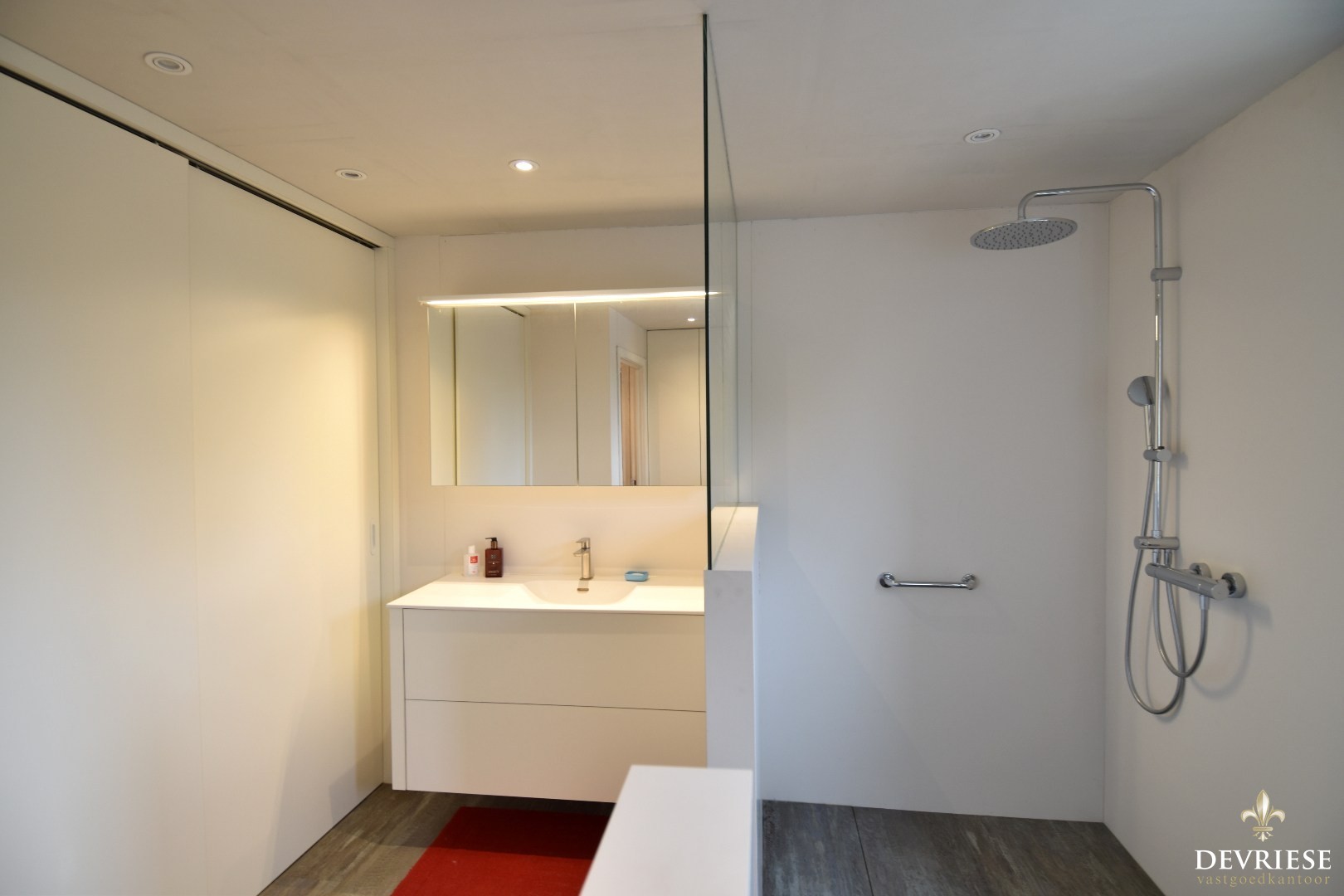 De master bedroom is een échte parel! Deze is voorzien van een dressing én een ensuite badkamer met dubbele inloopdouche, toilet en stijlvol lavabomeubel.