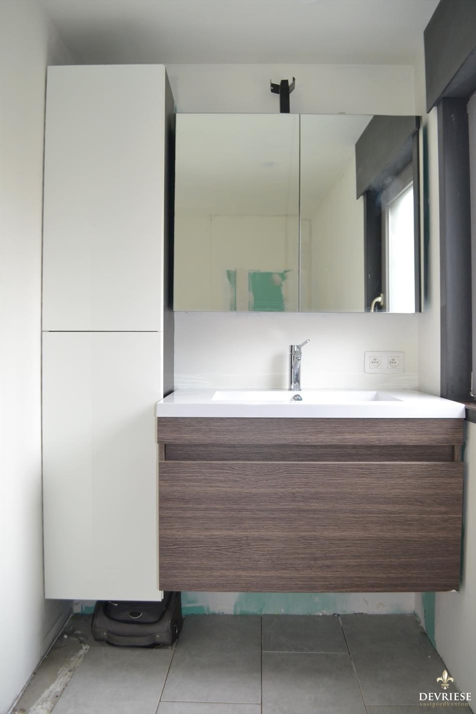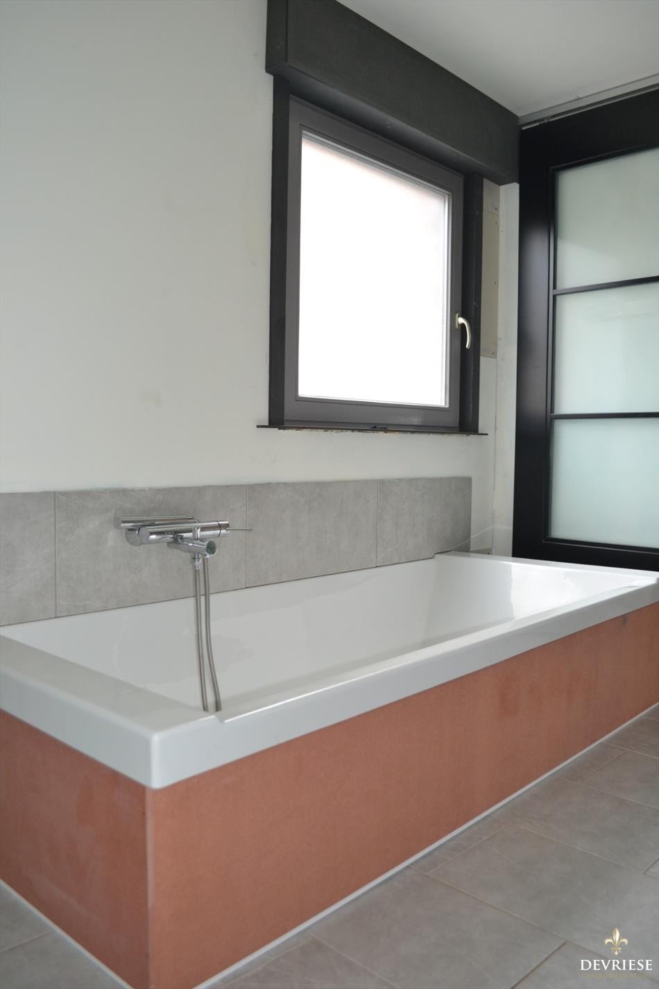 De badkamer is gelegen op het gelijkvloers en voorzien van een lavabomeubel, ligbad en verder af te werken inloopdouche.