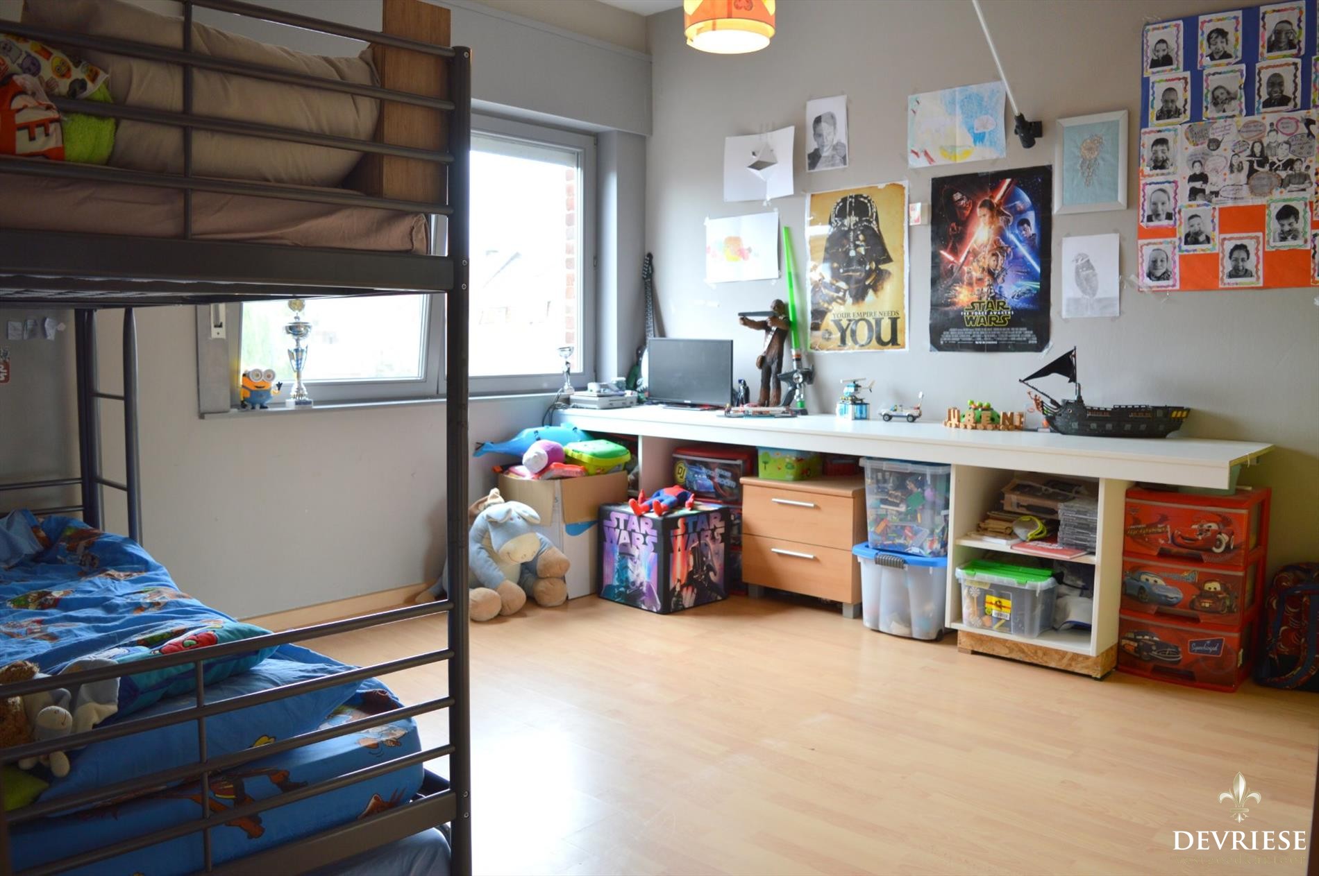 De bovenverdieping telt 3 slaapkamers waarvan 1 dienst kan doen als dressing of bureau.