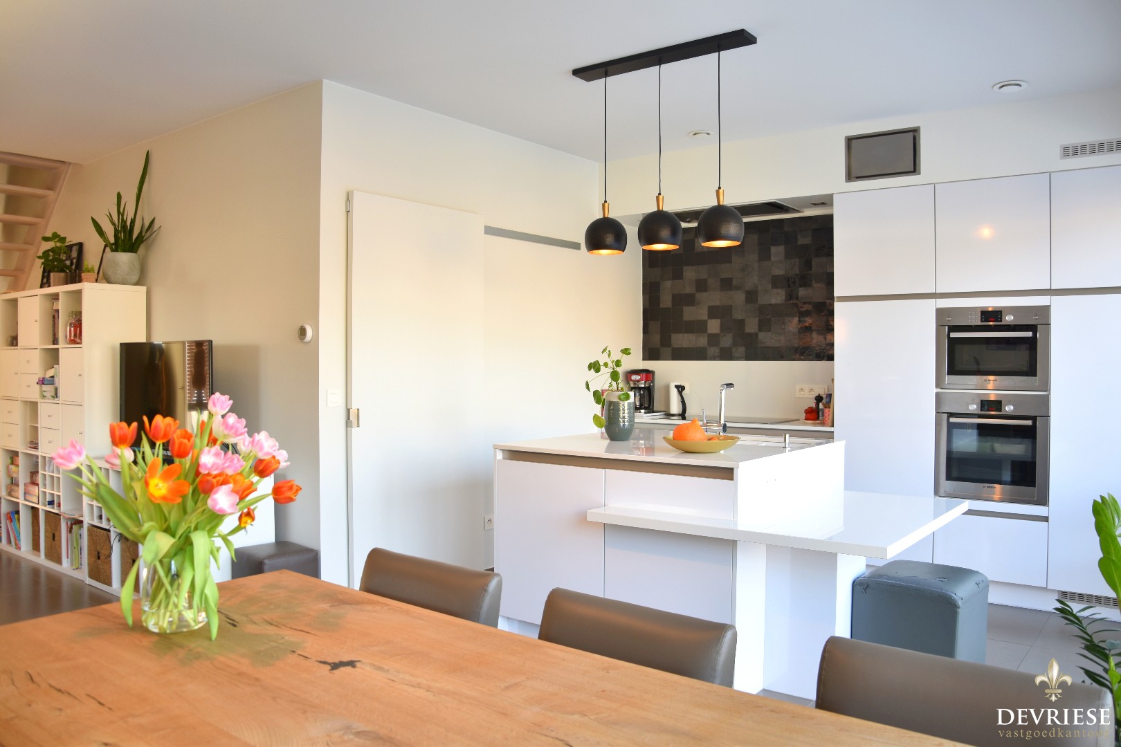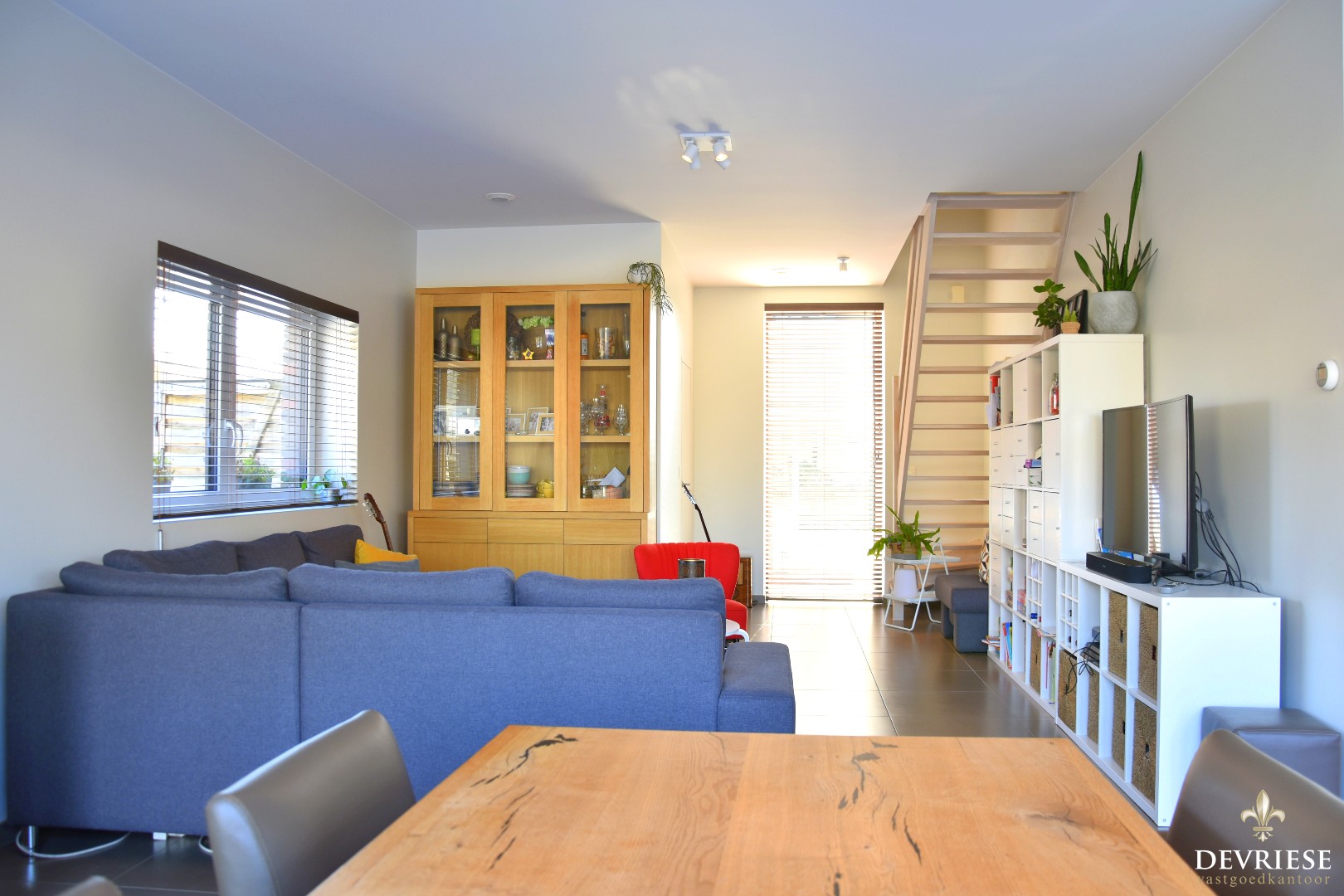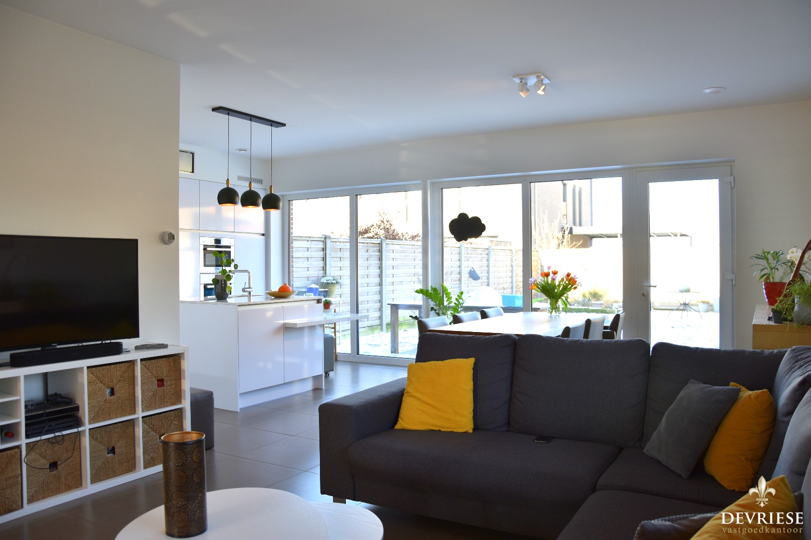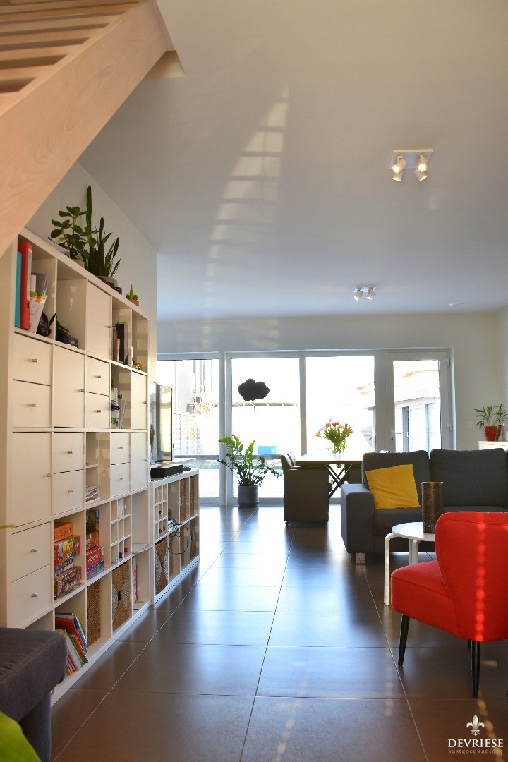 U komt binnen in de aparte inkomhal met gastentoilet. Daarnaast is er rechtstreekse toegang tot de gezellige leefruimte met open, moderne ingerichte keuken. Hier geniet je heel wat lichtinval door ... de grote raampartijen. Zo is er ook vol zicht op de tuin.
